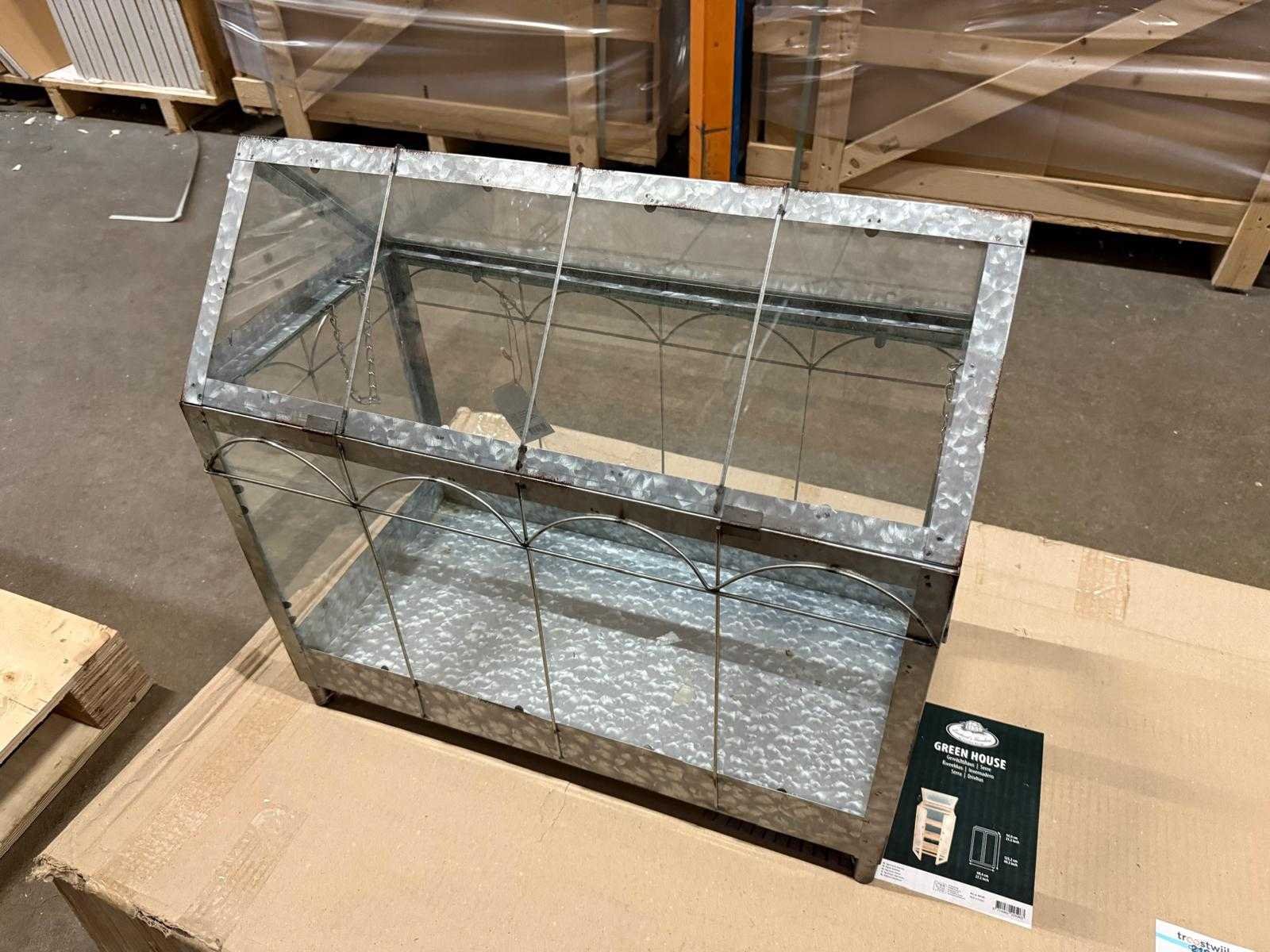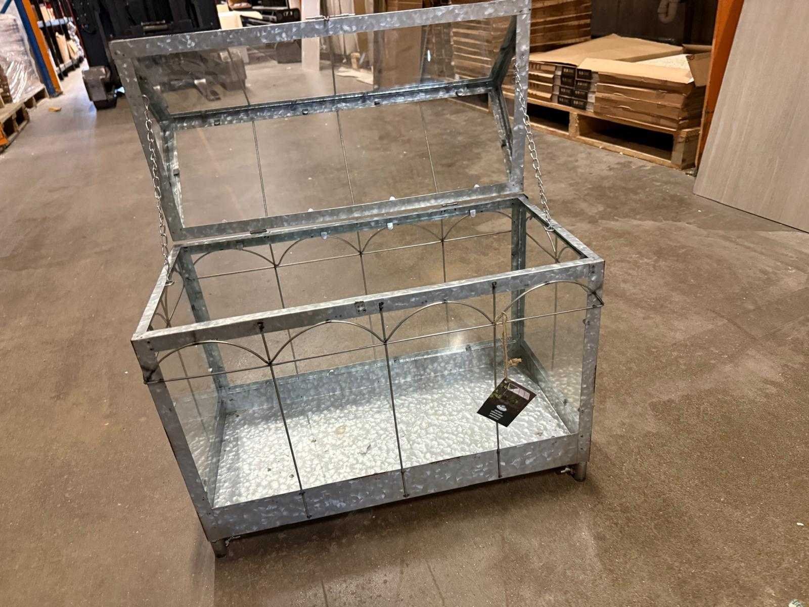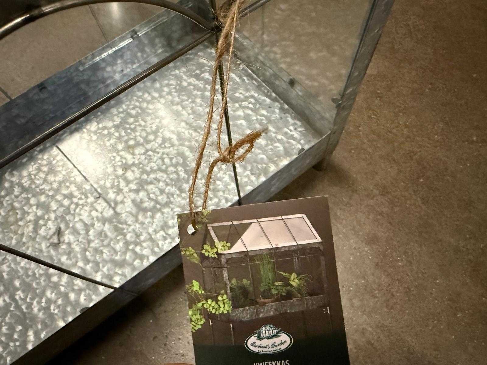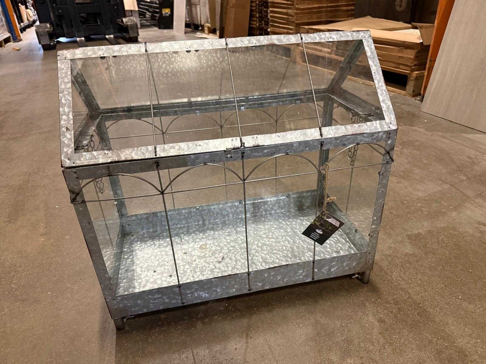 Decoratieve metalen mini-kasje / terrariumkast met glazen panelen, ideaal voor het beschermen of presenteren van planten. De verzinkte metalen constructie zorgt voor een stoere en industriële uitstraling. De bovenkant is openklapbaar voor makkelijke toegang en goede ventilatie. Perfect voor op balkon, terras of binnen als decoratiestuk. Een stevig en stijlvol item voor elke plantenliefhebber. Belangrijke eigenschappen: • Materiaal: verzinkt metaal + glas • Bovenkant openklapbaar • Geschikt als kasje, terrarium of displaykast • Stevig en decoratief ontwerp • Voor binnen en overdekt buiten gebruik
