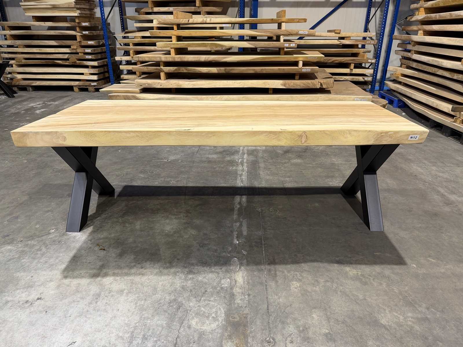 105/95; 8/10cm. dik massief; metalen X poot; onderstel wordt er los bijgeleverd. Zitplaatsen: 6 Lengte: 240cm Hoogte: 77cm Materiaal: suar