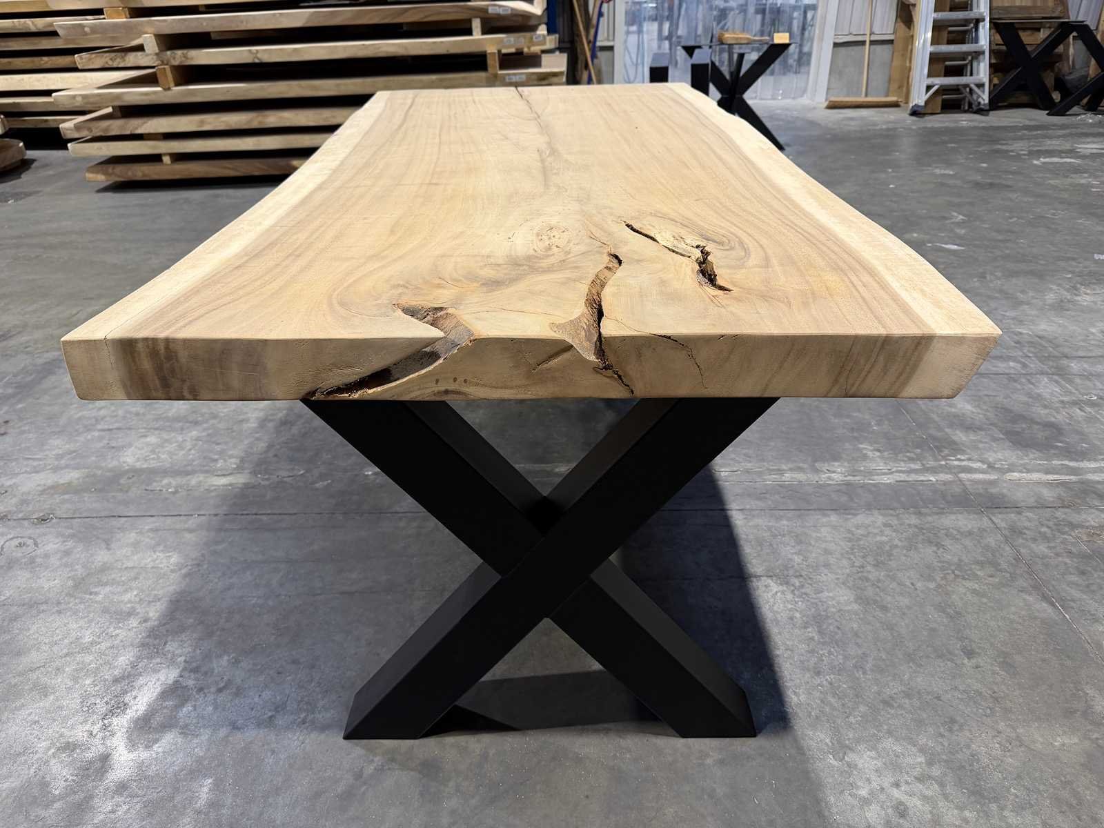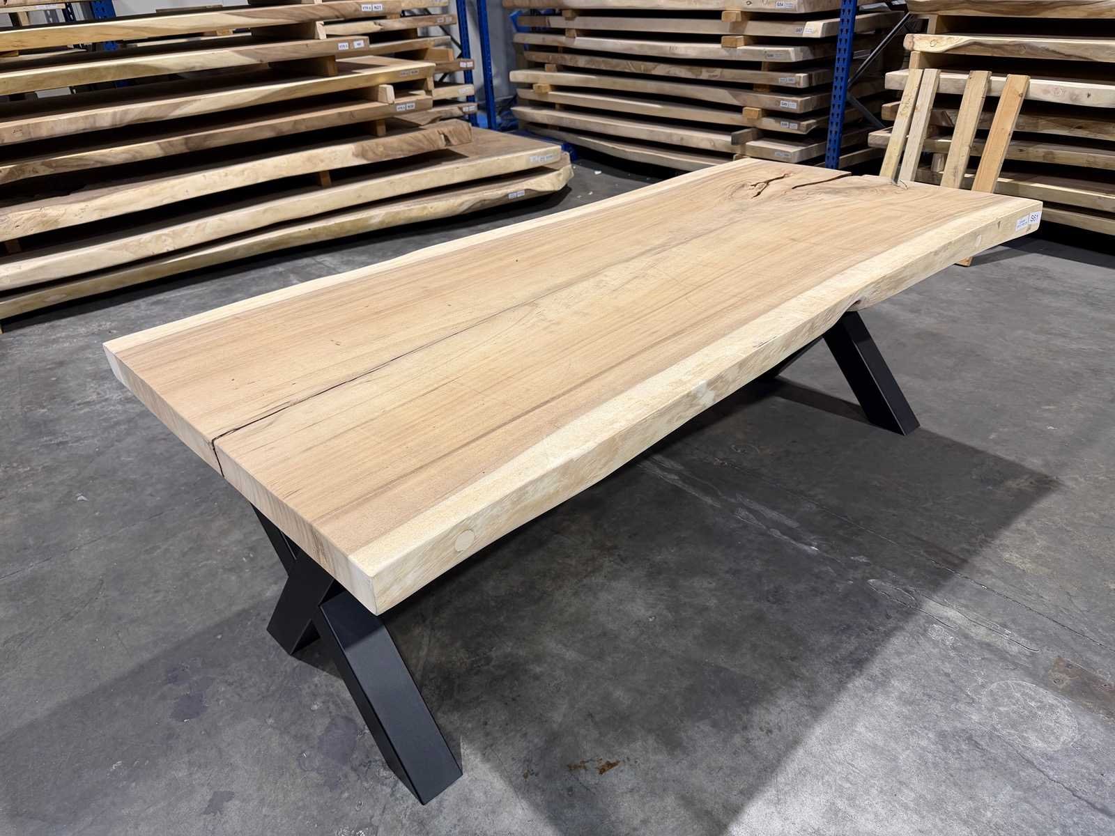 105/109; 8cm. dik massief; metalen X poot; onderstel wordt er los bijgeleverd. Zitplaatsen: 6 Lengte: 220cm Hoogte: 77cm Materiaal: suar