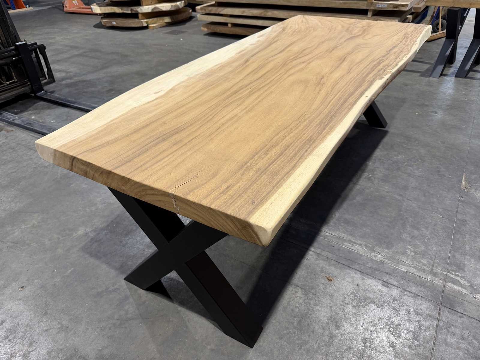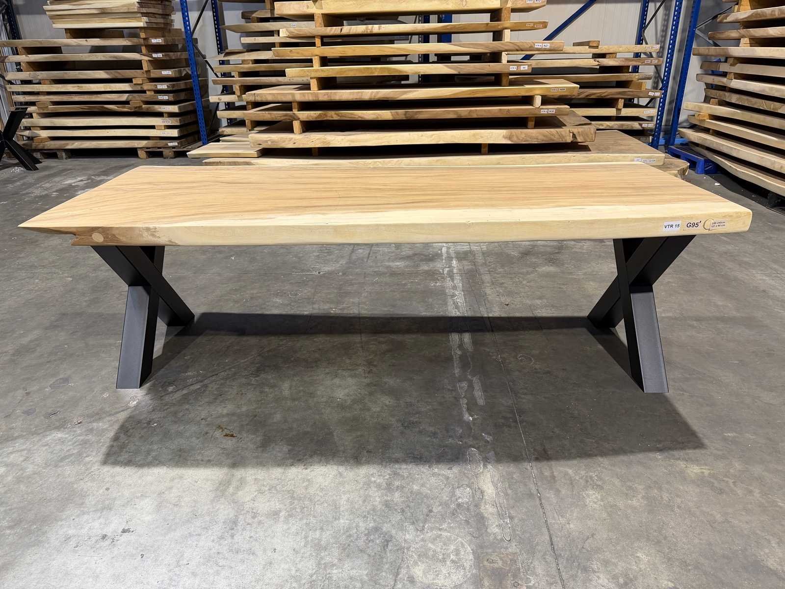 100/91; 8cm. dik massief; metalen X poot; onderstel wordt er los bijgeleverd. Zitplaatsen: 6 Lengte: 240cm Hoogte: 77cm Materiaal: suar