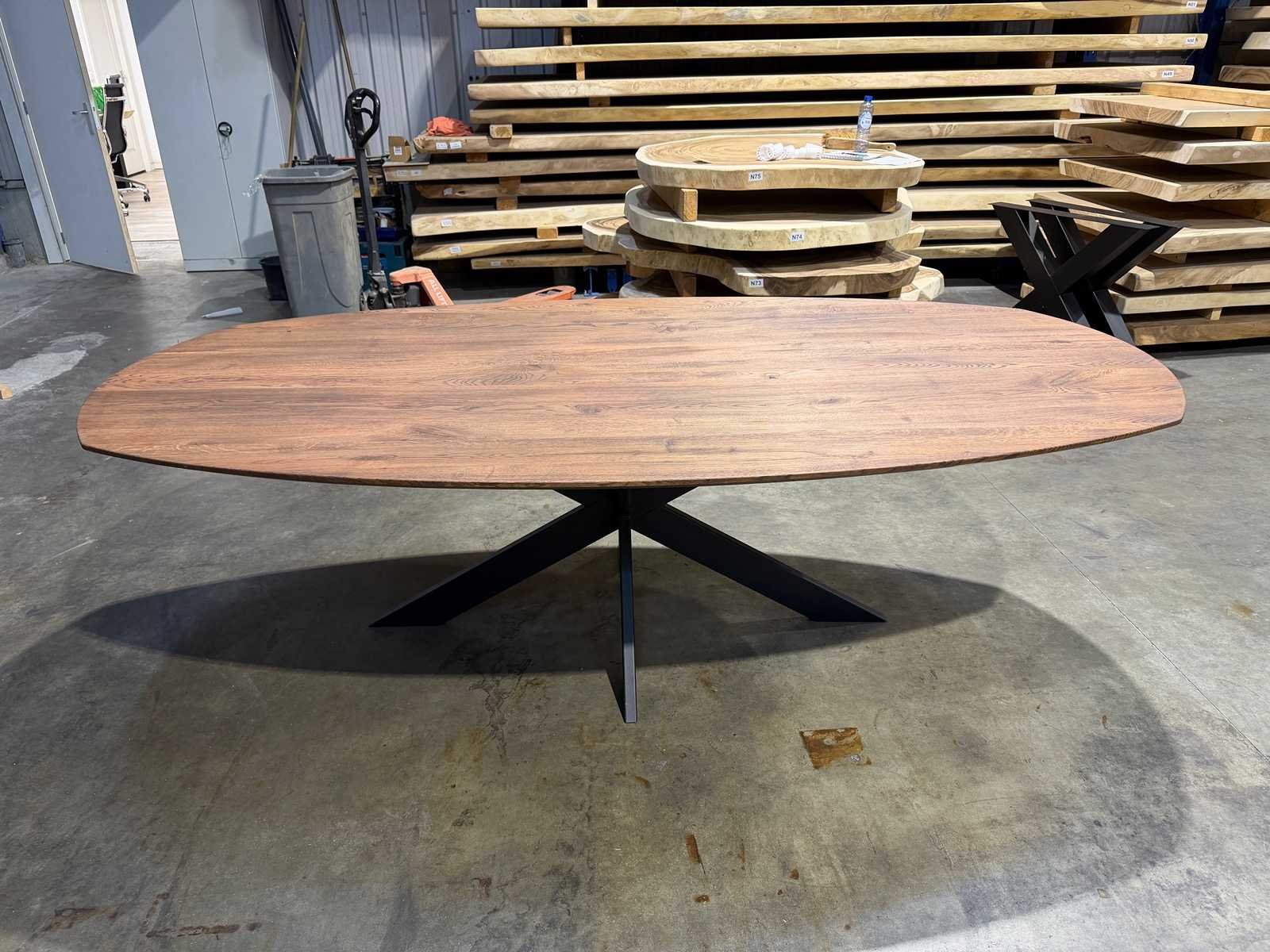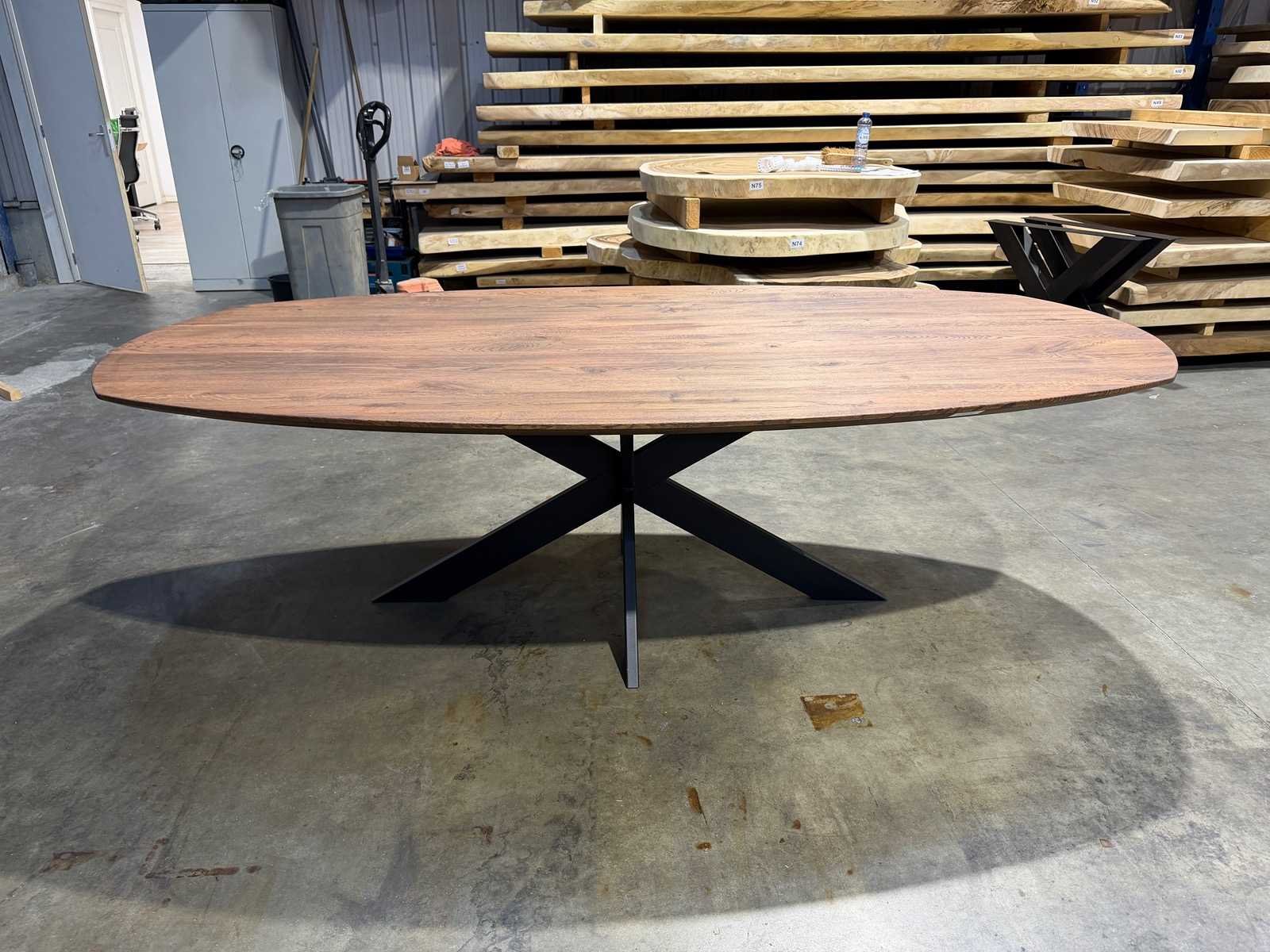 Massief eiken blad 4 cm. dik. 240x120cm; metalen matrix poot; onderstel wordt er los bijgeleverd. Zitplaatsen: 8 Kleur: Chocolate Lengte: 240cm Breedte: 120cm Hoogte: 77cm Materiaal: eiken