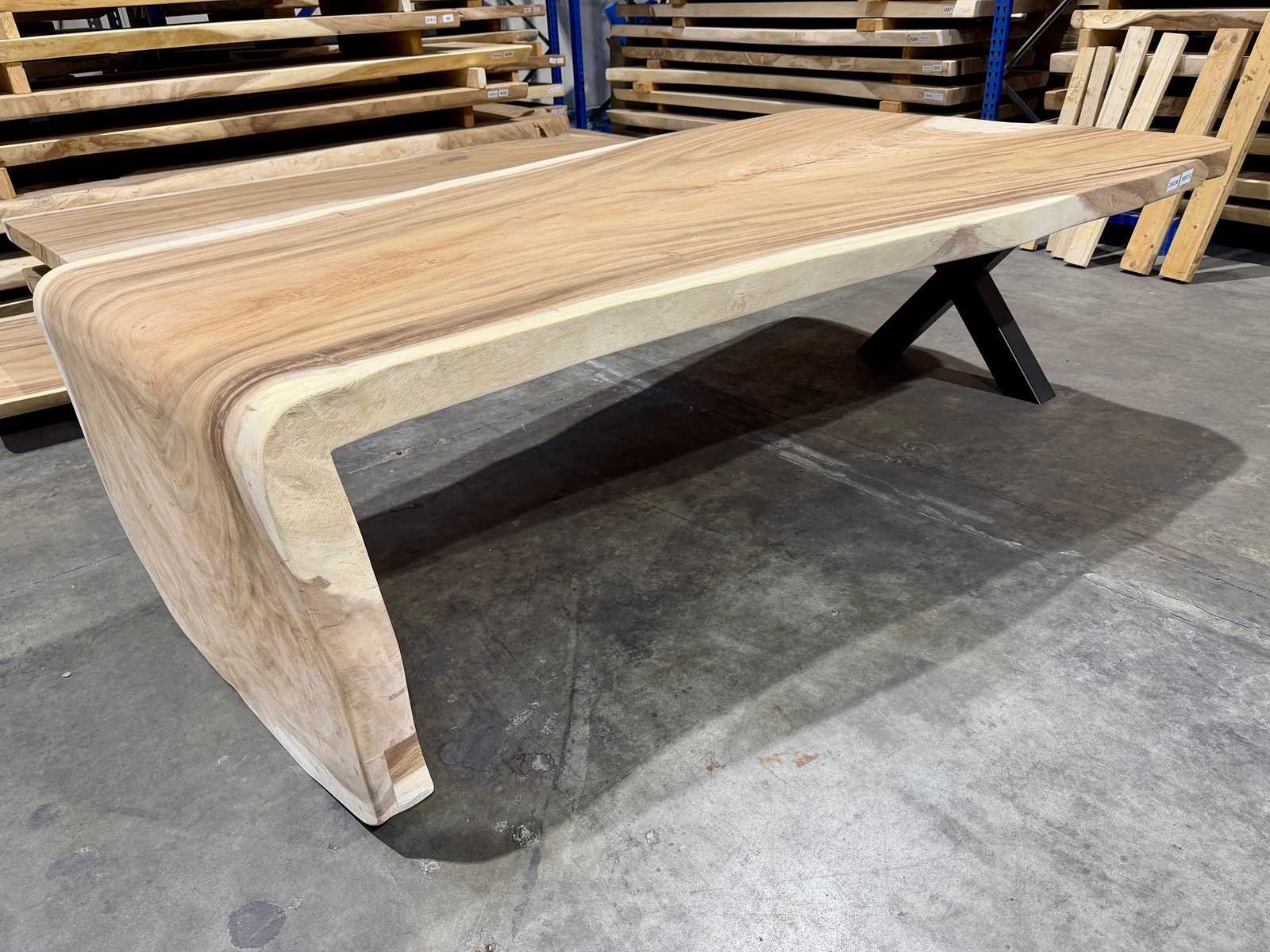 Unieke waterval tafel 8 cm. dik massief uit één stuk; metalen X poot; onderstel wordt er los bijgeleverd; heftruck aanwezig. Zitplaatsen: 6 Lengte: 260cm Hoogte: 77cm Materiaal: suar