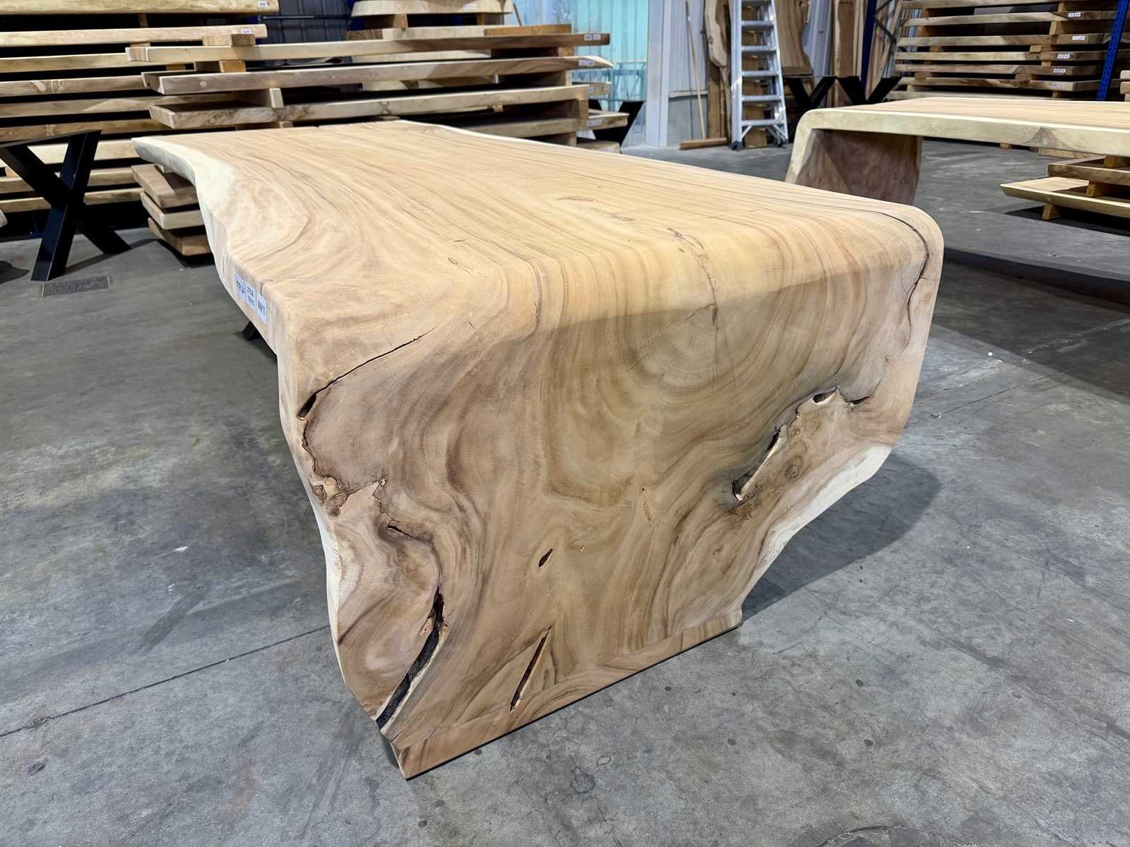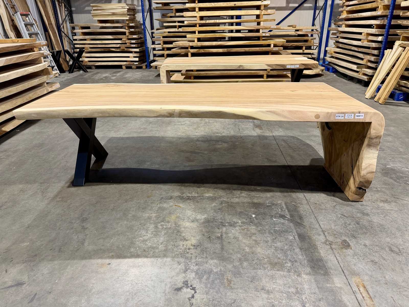 Unieke waterval tafel 8 cm. dik massief uit één stuk; 110/117 cm.; metalen X poot; onderstel wordt er los bijgeleverd; heftruck aanwezig. Zitplaatsen: 8 Lengte: 275cm Hoogte: 77cm Materiaal: suar