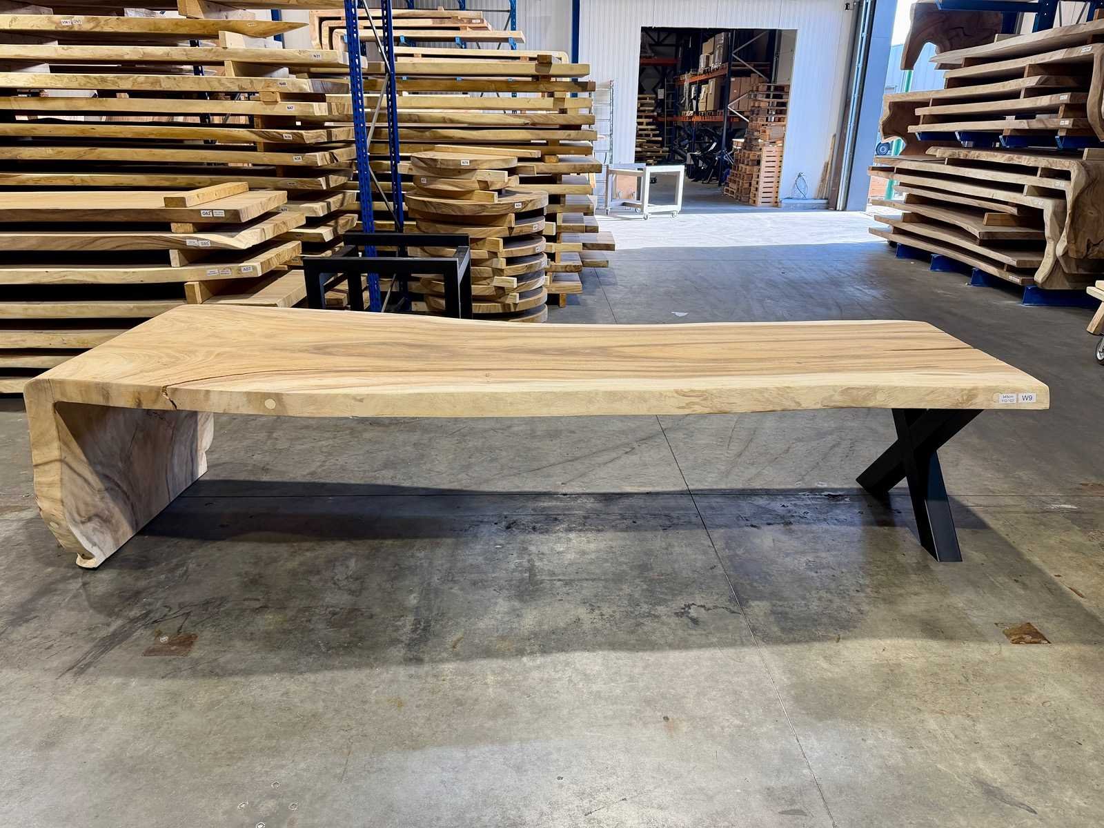 Unieke waterval tafel 8 cm. dik massief uit één stuk; 110/100 cm.; metalen X poot; onderstel wordt er los bijgeleverd; heftruck aanwezig. Zitplaatsen: 10 Lengte: 345cm Hoogte: 77cm Materiaal: suar