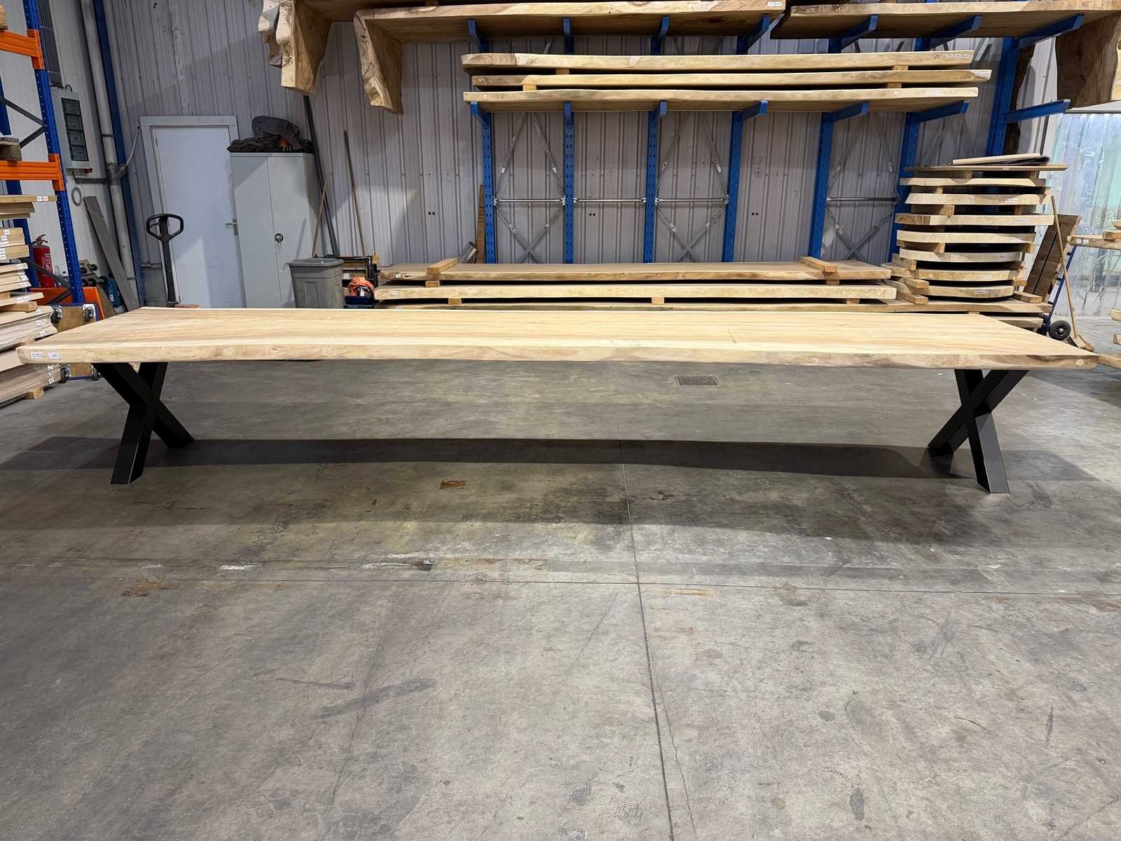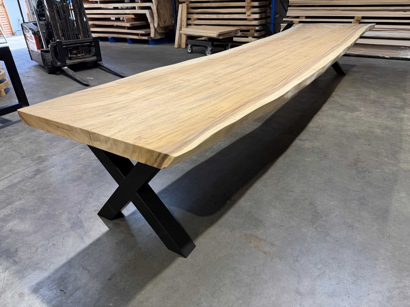 119/113; 8cm. dik massief; metalen X poot; onderstel wordt er los bijgeleverd; heftruck aanwezig. Zitplaatsen: 12 Lengte: 500cm Hoogte: 77cm Materiaal: suar