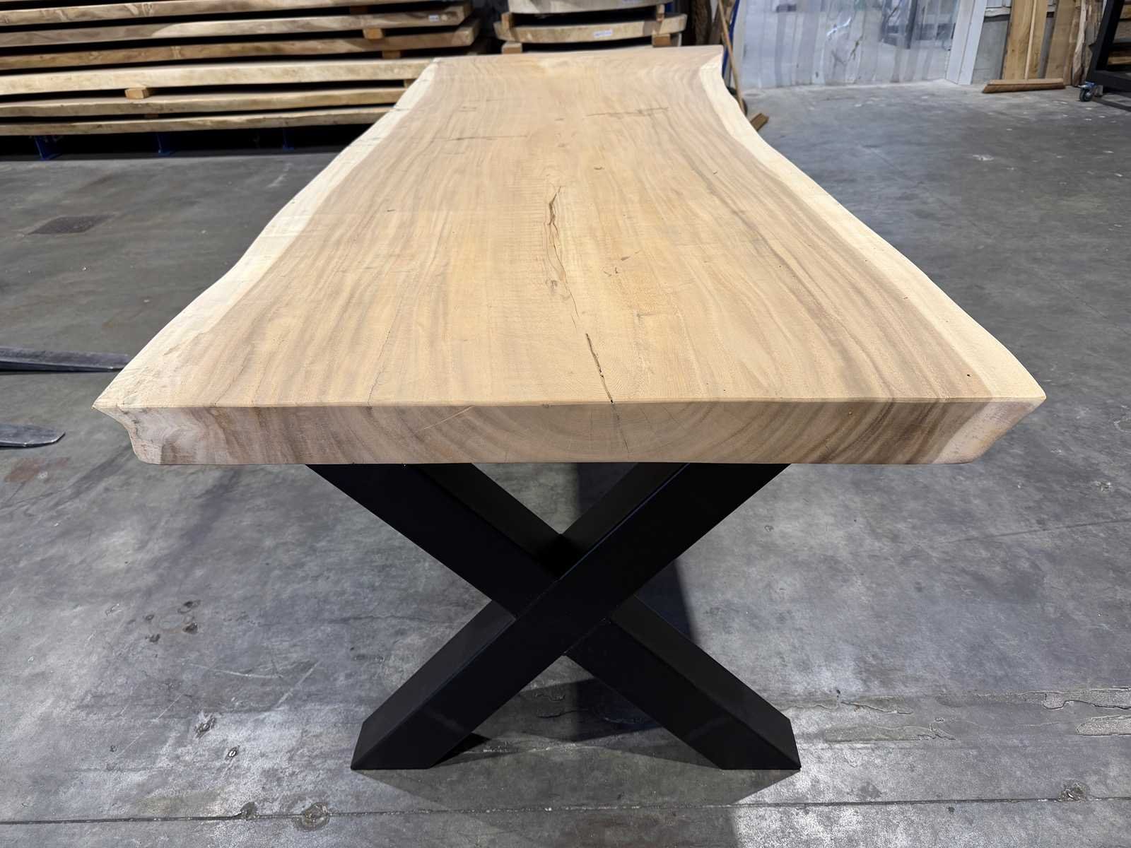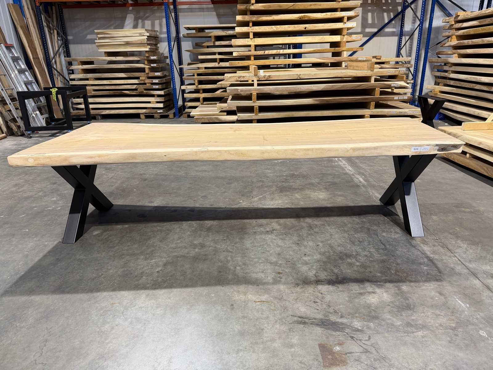 121/101 cm; 8 cm. dik massief; metalen X poot; onderstel wordt los geleverd. Zitplaatsen: 10 Lengte: 300cm Hoogte: 72cm Materiaal: suar