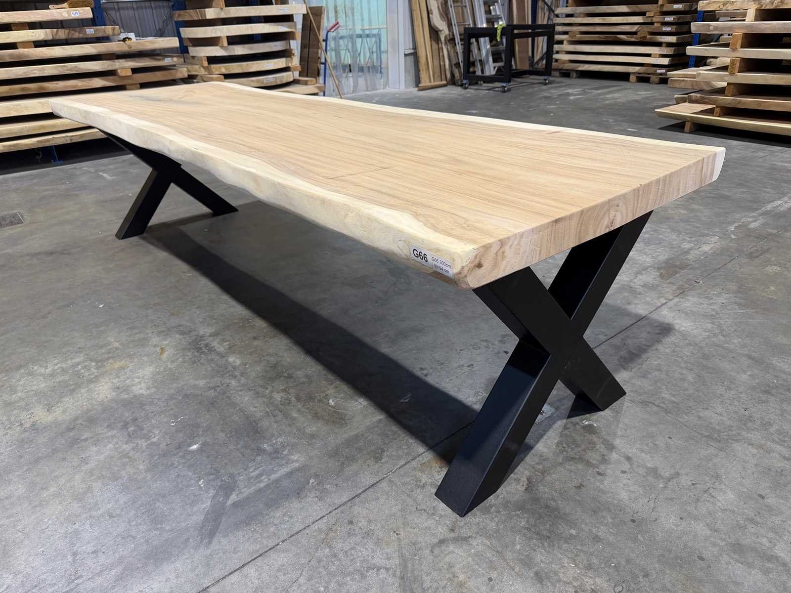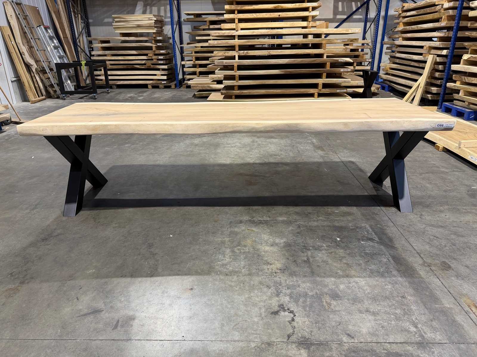 99/94 cm; 8 cm. dik massief; metalen X poot; onderstel wordt los geleverd. Zitplaatsen: 10 Lengte: 300cm Hoogte: 72cm Materiaal: suar