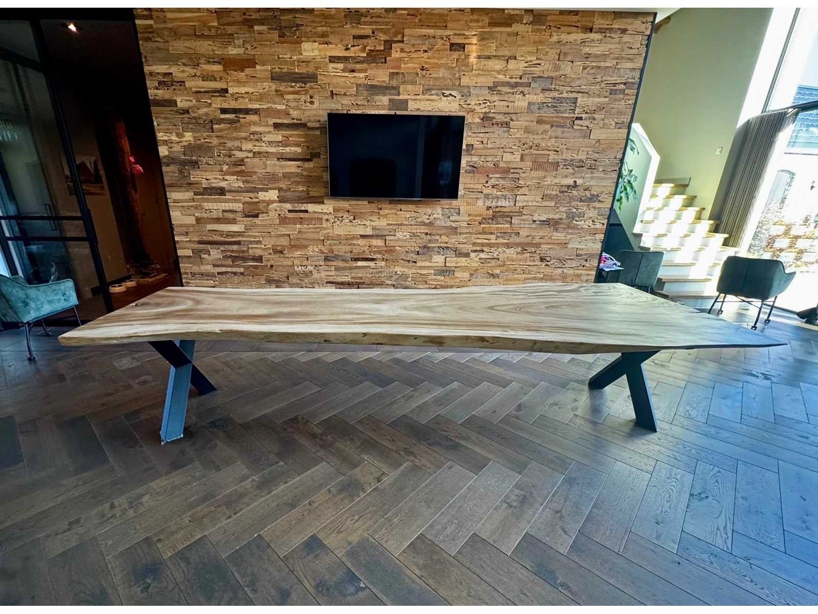 110/134; 8cm. dik massief; metalen diamant X poot; showroommodel; heftruck aanwezig. Zitplaatsen: 10 Lengte: 365cm Materiaal: suar