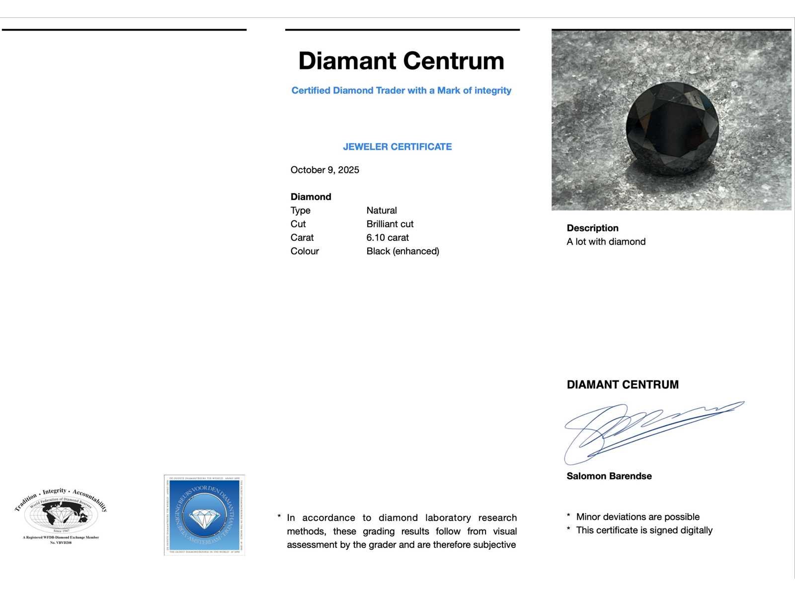Samenvatting van gegevens Diamant - 6.10 carat zwarte natuurlijke diamant Diamant: Natuurlijk; Aantal: 1 stuk; Slijpvorm: Briljant geslepen; Gewicht (carat): 6.10 carat; Kleur: Zwart (enhanced); Conditie: Nieuw; Verpakking: Edelsteendoos; Toelichting: De kwaliteit is overgenomen van het rapport behorend bij item. De waardebepaling is een beoordeling van een gecertificeerde diamantair, gebaseerd op consumentenprijzen.; Consumentenprijs: € 5.000,- Within 14 days Voornaamste diamant: Natuurlijk Kleur diamant: Zwart (enhanced) Gewicht diamant: 6.10ct Slijpvorm diamant: Briljant geslepen