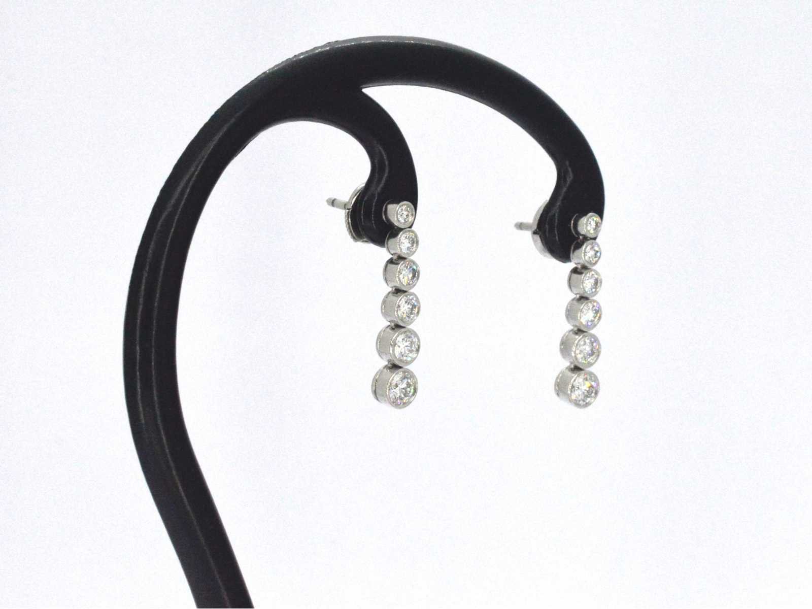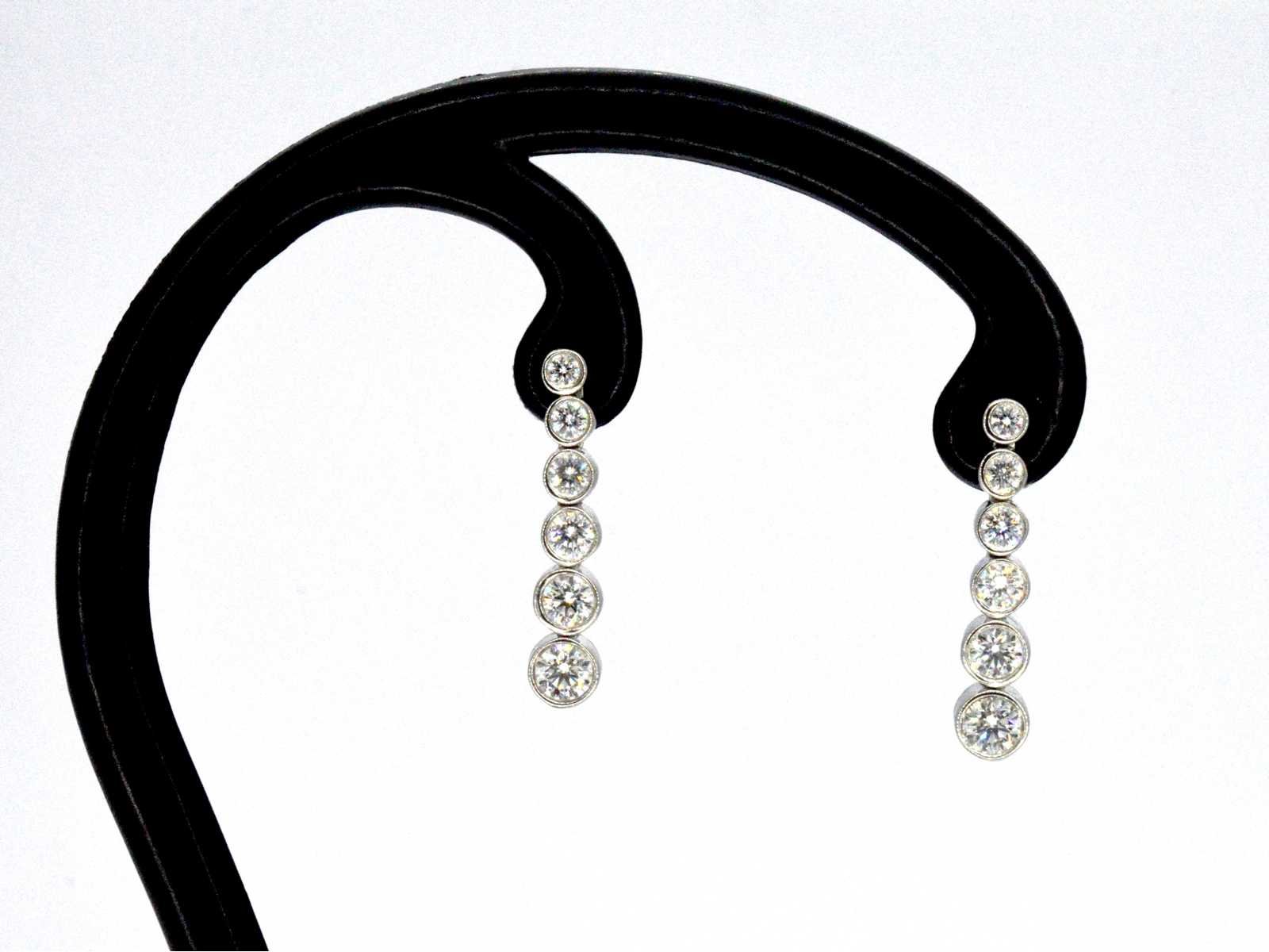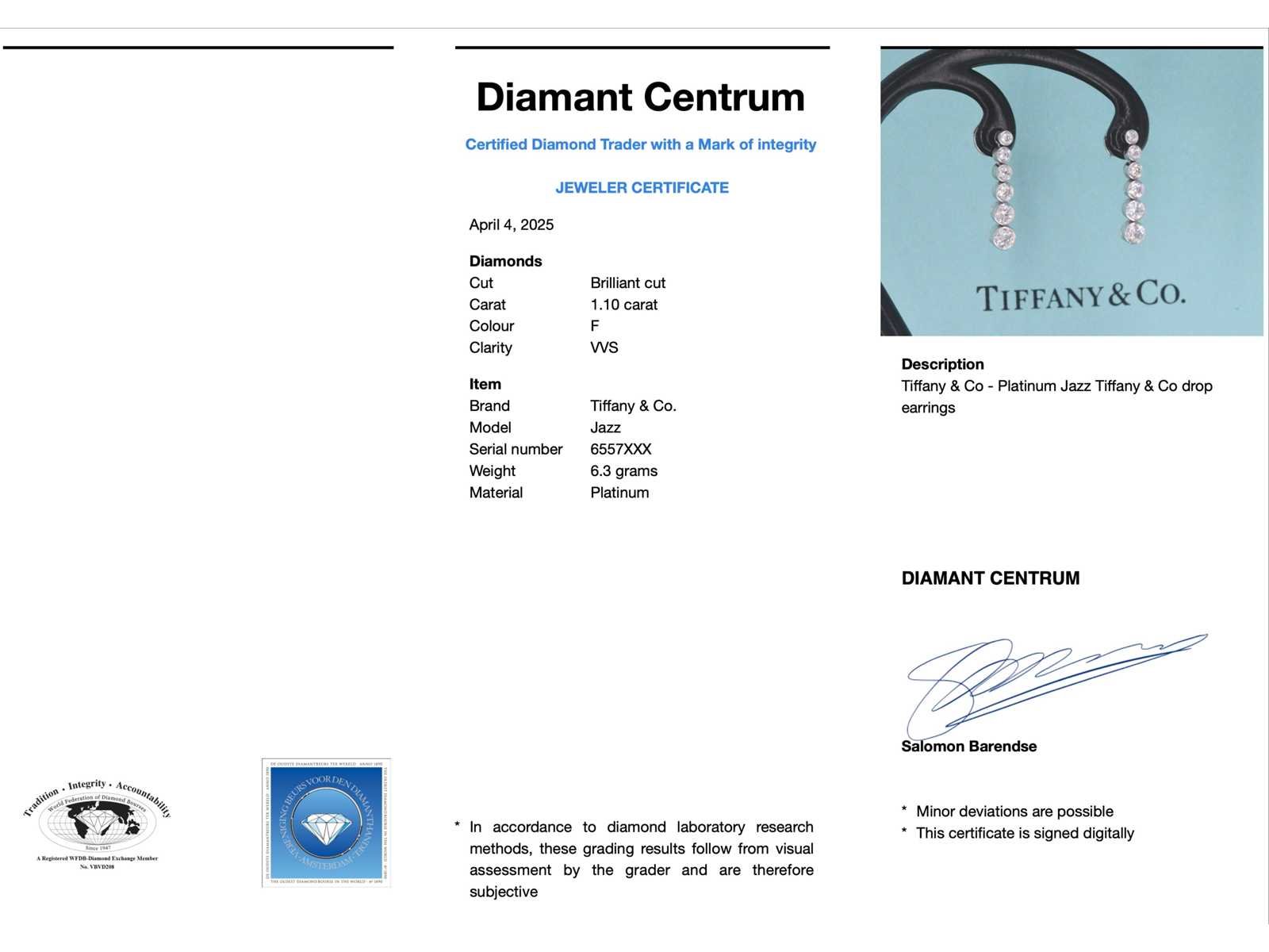 Samenvatting van gegevens Tiffany & Co - Platina Jazz Tiffany & Co druppel oorbellen Diamant: Natuurlijk; Aantal: 12 stuks; Slijpvorm: Briljant geslepen; Gewicht (carat): 1.10 carat; Kleur: F; Zuiverheid: VVS; Extra informatie: Originele Tiffany & Co diamanten; Juweel: Oorbellen; Merk: Tiffany & Co; Model: Jazz; Serienummer: 6557XXX; Gewicht: 6.3 gram; Afmetingen/lengte: 1.3 x 0.5 cm; Materiaal: Platina (950); Conditie: Zo goed als nieuw; Verpakking: Originele sieradendoos; Toelichting: De kwaliteit is overgenomen van het rapport behorend bij item. De waardebepaling is een beoordeling van een gecertificeerde diamantair, gebaseerd op consumentenprijzen.; Consumentenprijs: € 10.500,- Within 14 days Materiaal: Platina Voornaamste diamant: Natuurlijk Kleur diamant: F Gewicht diamant: 1.10ct Slijpvorm diamant: Briljant geslepen Zuiverheidsgraad diamant: VVS Totaal gewicht: 6.3g Keurmerk: 950