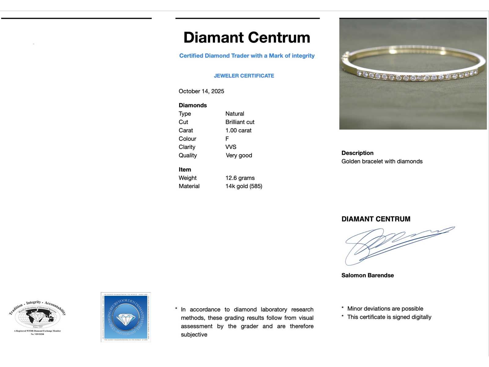 Samenvatting van gegevens Gouden vaste armband met briljant geslepen diamanten Diamant: Natuurlijk; Aantal: 19 stuks; Slijpvorm: Briljant geslepen; Gewicht (carat): 1.00 carat; Kleur: F; Zuiverheid: VVS; Slijpkwaliteit: Zeer mooi; Juweel: Armband; Gewicht: 12.6 gram; Afmetingen/lengte: 60 mm; Materiaal: 14K goud (585); Conditie: Zo goed als nieuw; Verpakking: Luxe sieradendoos; Toelichting: De kwaliteit is overgenomen van het rapport behorend bij item. De waardebepaling is een beoordeling van een gecertificeerde diamantair, gebaseerd op consumentenprijzen.; Consumentenprijs: € 14.400,- Within 14 days Materiaal: Goud Voornaamste diamant: Natuurlijk Kleur diamant: F Gewicht diamant: 1.00ct Slijpvorm diamant: Briljant geslepen Slijpkwaliteit diamant: Zeer mooi Zuiverheidsgraad diamant: VVS Totaal gewicht: 12.6g Keurmerk: 585