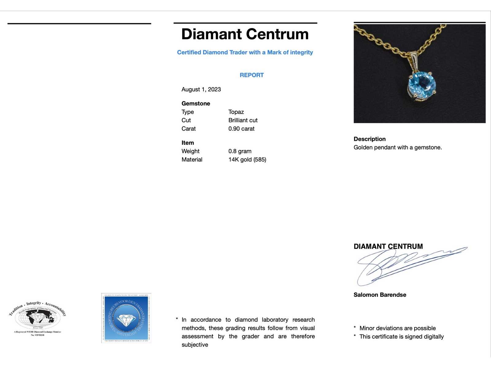 Samenvatting van gegevens Gouden hanger met topaas Edelsteen: Topaas; Slijpvorm: Briljant geslepen; Gewicht (carat): 0.90 carat; Juweel: Hanger (excl. ketting); Gewicht: 1 gram; Materiaal: 14k goud (585); Conditie: Nieuw; Verpakking: Luxe sieradendoos; Toelichting: De kwaliteit is overgenomen van het rapport behorend bij item. De waardebepaling is een beoordeling van een gecertificeerde diamantair, gebaseerd op consumentenprijzen.; Consumentenprijs: € 403,- Within 14 days Materiaal: Goud Edelsteen: Topaas Slijpvorm edelsteen: Briljant geslepen Totaal gewicht: 1g Keurmerk: 585