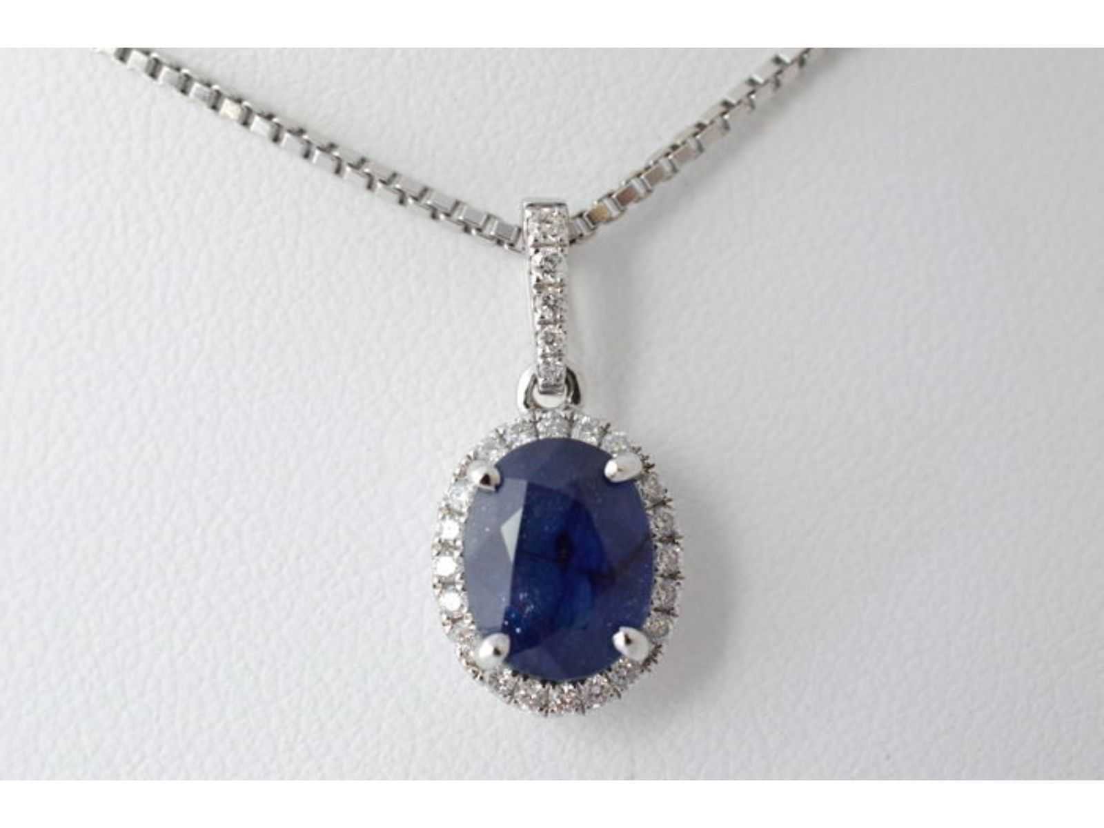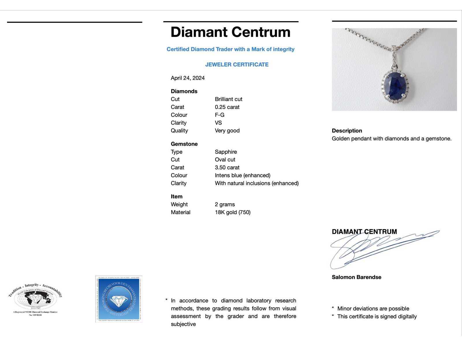 Samenvatting van gegevens 18 carat witgouden hanger met diamanten en saffier Diamant: Natuurlijk; Slijpvorm: Briljant geslepen; Gewicht (carat): 0.25 carat; Kleur: F-G; Zuiverheid: VS; Slijpkwaliteit: Zeer mooi; Edelsteen: Saffier; Slijpvorm: Ovaal; Gewicht (carat): 3.50 carat; Kleur: Royal blue (enhanced); Zuiverheid: Met natuurlijke insluitsels (enhanced); Afmetingen: 9.0 x 7.0 cm; Juweel: Hanger (excl. ketting); Gewicht: 2 gram; Afmetingen/lengte: 1,9 cm; Materiaal: 18K goud (750); Conditie: Nieuw; Verpakking: Luxe sieradendoos; Toelichting: De kwaliteit is overgenomen van het rapport behorend bij item. De waardebepaling is een beoordeling van een gecertificeerde diamantair, gebaseerd op consumentenprijzen.; Consumentenprijs: € 3.010,- Within 14 days Materiaal: Goud Voornaamste diamant: Natuurlijk Kleur diamant: F-G Gewicht diamant: 0.25ct Slijpvorm diamant: Briljant geslepen Slijpkwaliteit diamant: Zeer mooi Zuiverheidsgraad diamant: VS Edelsteen: Saffier Kleur edelsteen: Royal blue (enhanced) Slijpvorm edelsteen: Ovaal Zuiverheidsgraad edelsteen: Met natuurlijke insluitsels (enhanced) Totaal gewicht: 2g Keurmerk: 750