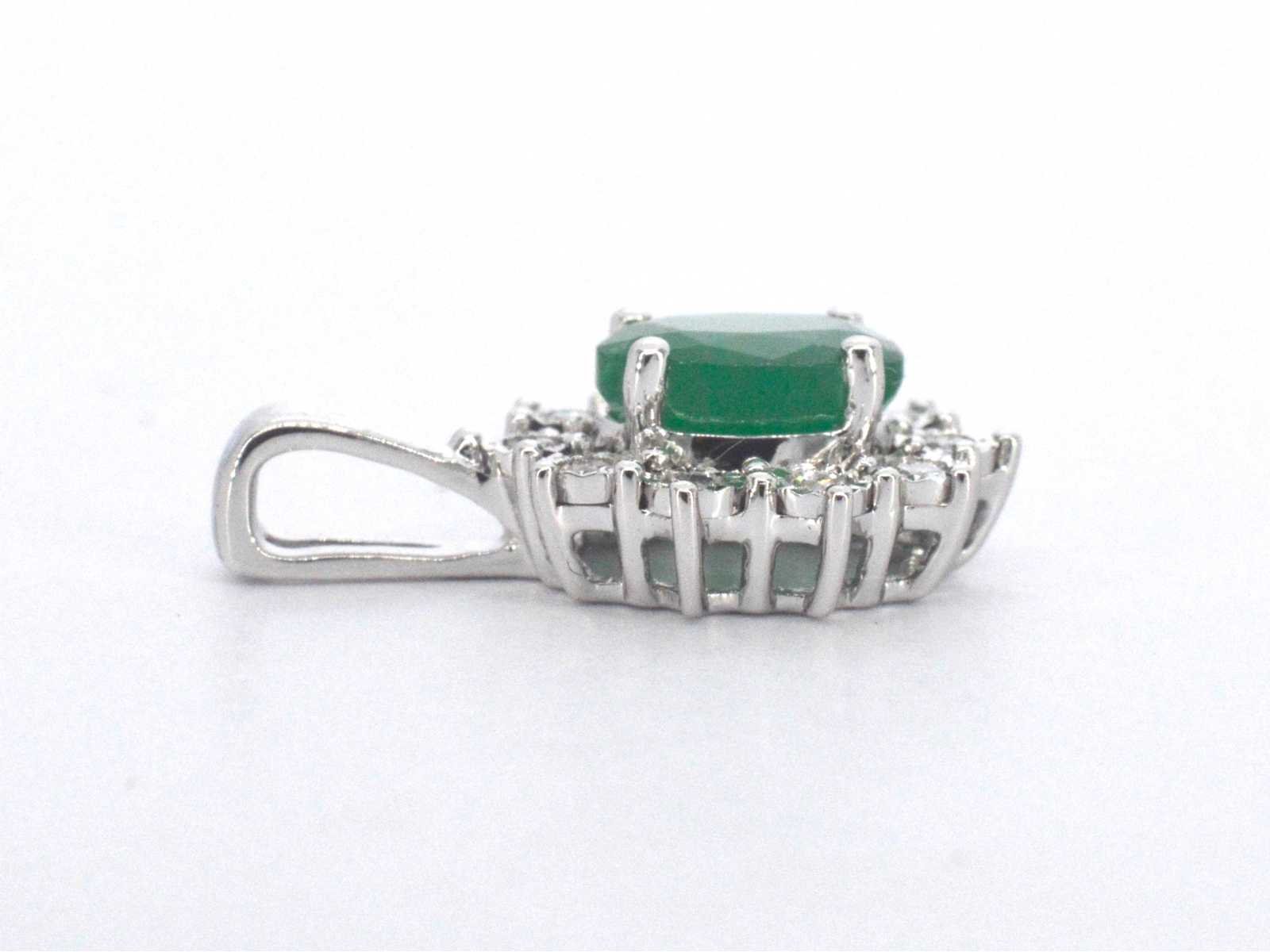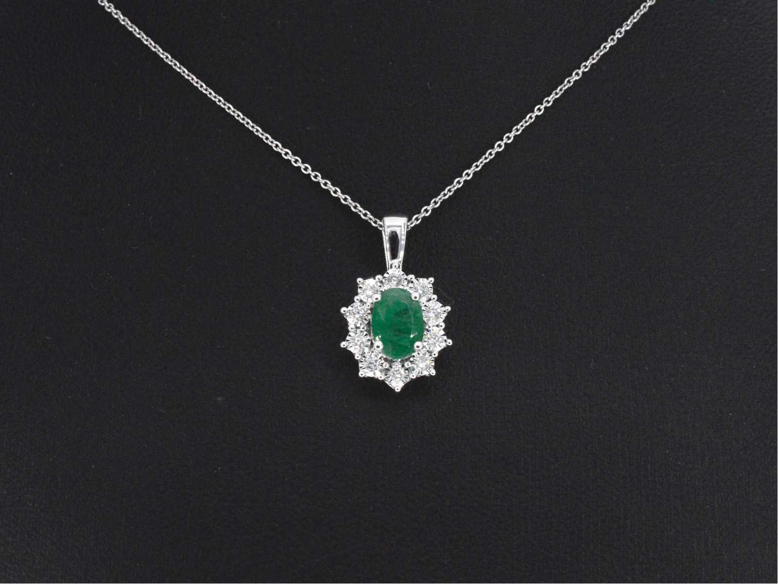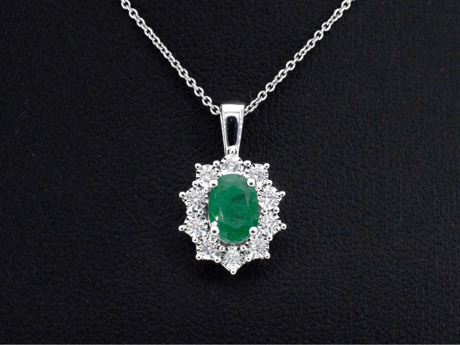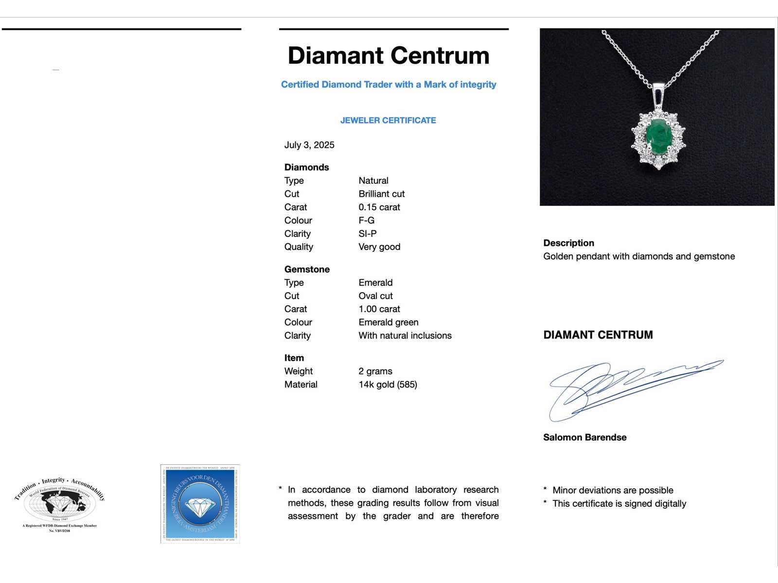 Samenvatting van gegevens Witgouden hanger met natuurlijke diamanten en smaragd Diamant: Natuurlijk; Aantal: 10 stuks; Slijpvorm: Briljant geslepen; Gewicht (carat): 0.15 carat; Kleur: F-G; Zuiverheid: SI-P; Slijpkwaliteit: Zeer mooi; Edelsteen: Smaragd; Aantal: 1 stuk; Slijpvorm: Ovaal geslepen; Gewicht (carat): 1.00 carat; Kleur: Smaragd groen; Zuiverheid: Met natuurlijke insluitsels; Juweel: Hanger (excl. ketting); Gewicht: 2 gram; Materiaal: 14k goud (585); Conditie: Nieuw; Verpakking: Luxe sieradendoos; Toelichting: De kwaliteit is overgenomen van het rapport behorend bij item. De waardebepaling is een beoordeling van een gecertificeerde diamantair, gebaseerd op consumentenprijzen.; Consumentenprijs: € 1.540,- Within 14 days Materiaal: Goud Voornaamste diamant: Natuurlijk Kleur diamant: F-G Gewicht diamant: 0.15ct Slijpvorm diamant: Briljant geslepen Slijpkwaliteit diamant: Zeer mooi Zuiverheidsgraad diamant: SI-P Edelsteen: Smaragd Kleur edelsteen: Smaragd groen Slijpvorm edelsteen: Ovaal geslepen Zuiverheidsgraad edelsteen: Met natuurlijke insluitsels Totaal gewicht: 2g Keurmerk: 585