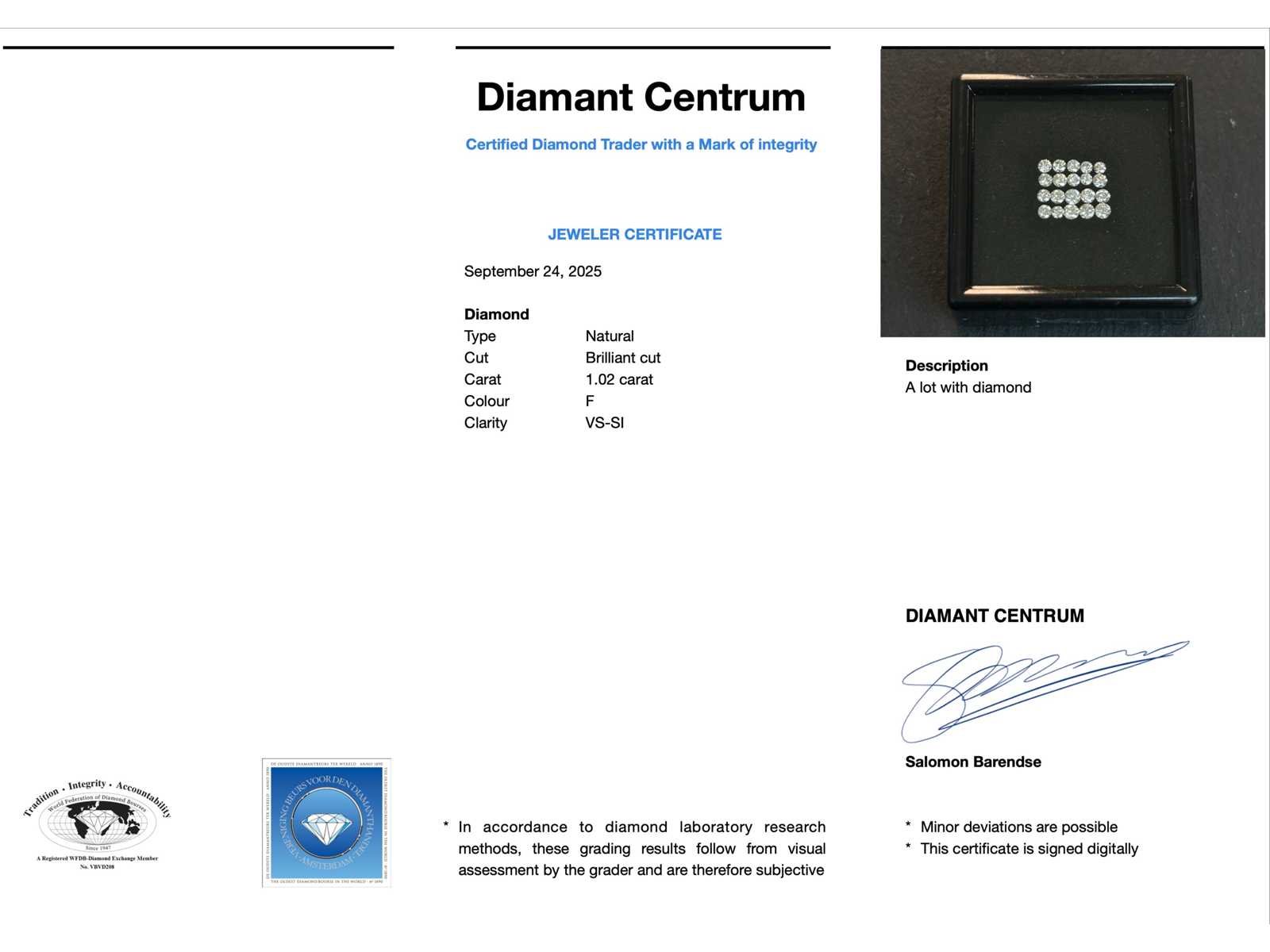 Samenvatting van gegevens Diamant - 1.02 carat echte natuurlijke diamant Diamant: Natuurlijk; Aantal: 20 stuks; Slijpvorm: Briljant geslepen; Gewicht (carat): 1.02 carat; Kleur: F; Zuiverheid: VS-SI; Conditie: Nieuw; Verpakking: Edelsteendoos; Toelichting: De kwaliteit is overgenomen van het rapport behorend bij item. De waardebepaling is een beoordeling van een gecertificeerde diamantair, gebaseerd op consumentenprijzen.; Consumentenprijs: € 3.000,- Within 14 days Voornaamste diamant: Natuurlijk Kleur diamant: F Gewicht diamant: 1.02ct Slijpvorm diamant: Briljant geslepen Zuiverheidsgraad diamant: VS-SI