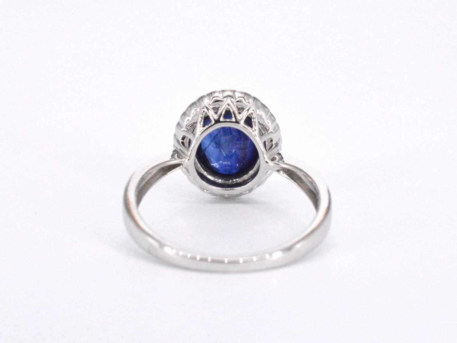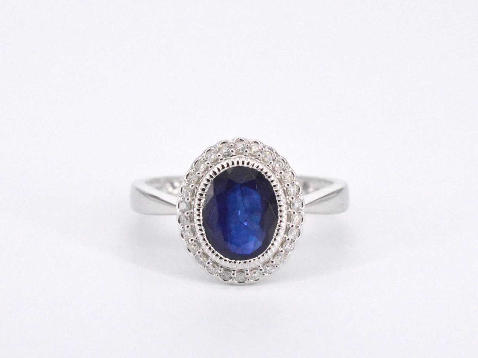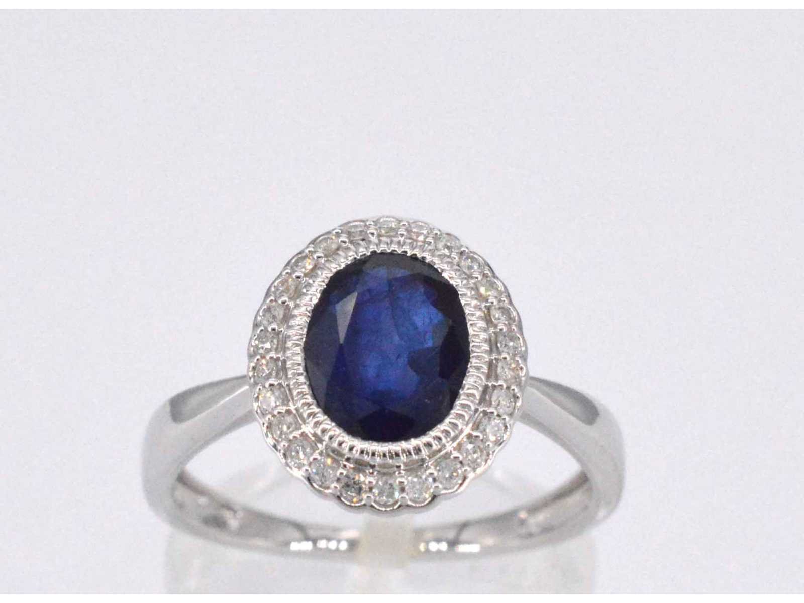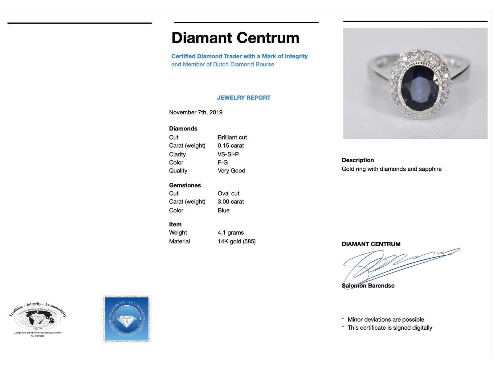 Samenvatting van gegevens Witgouden entourage ring met diamanten en saffier Diamant: Natuurlijk; Slijpvorm: Briljant geslepen; Gewicht (carat): 0.15 carat; Kleur: F-G; Zuiverheid: SI-P; Slijpkwaliteit: Zeer mooi; Edelsteen: Saffier; Slijpvorm: Ovaal; Gewicht (carat): 3.00 carat; Juweel: Ring; Gewicht: 4.1 gram; Ringmaat (op maat gemaakt*): 54 (17.25 mm); Materiaal: 14 karaat (585); Conditie: Nieuw; Verpakking: Luxe sieradendoos; Toelichting: De kwaliteit is overgenomen van het rapport behorend bij item. De waardebepaling is een beoordeling van een gecertificeerde diamantair, gebaseerd op consumentenprijzen.; Consumentenprijs: € 2.468,- Within 14 days Voornaamste diamant: Natuurlijk Gewicht diamant: 0.15ct Edelsteen: Saffier Totaal gewicht: 4.1g Keurmerk: 585 Kleur diamant: F-G Slijpvorm diamant: Briljant geslepen Slijpkwaliteit diamant: Zeer mooi Zuiverheidsgraad diamant: SI-P Slijpvorm edelsteen: Ovaal