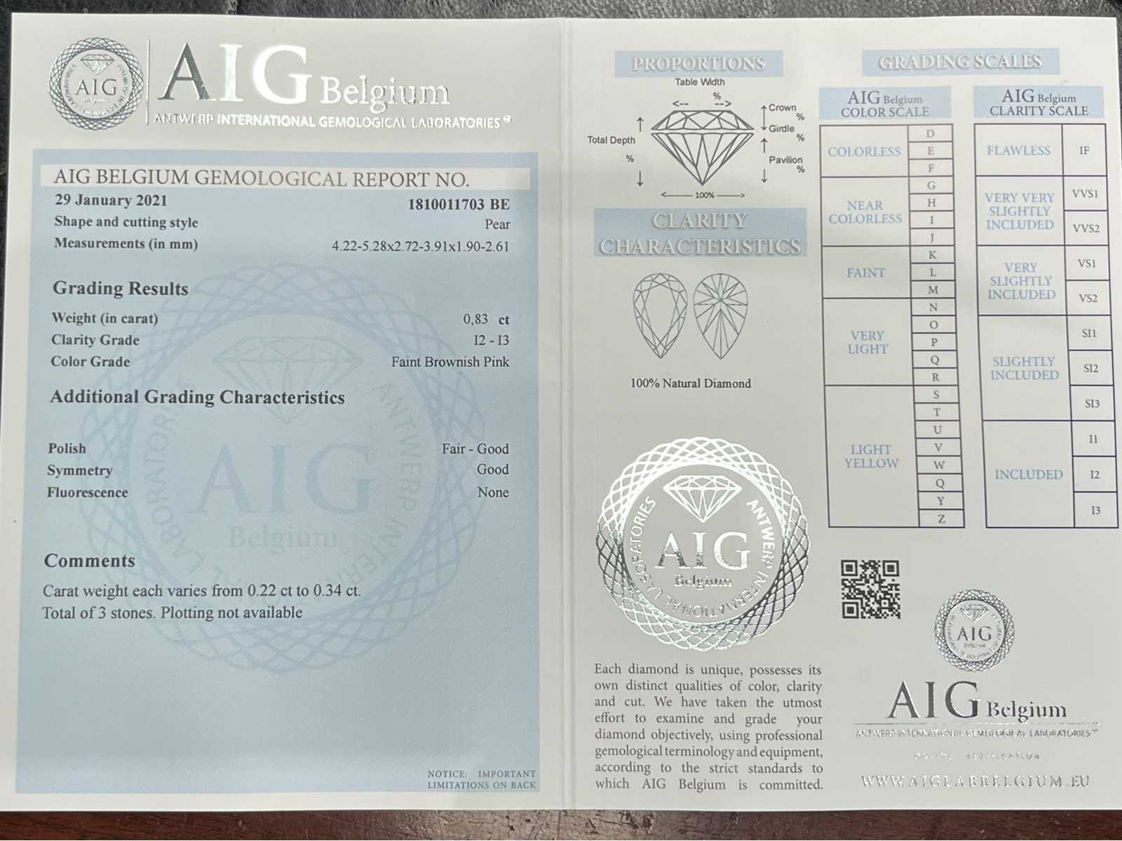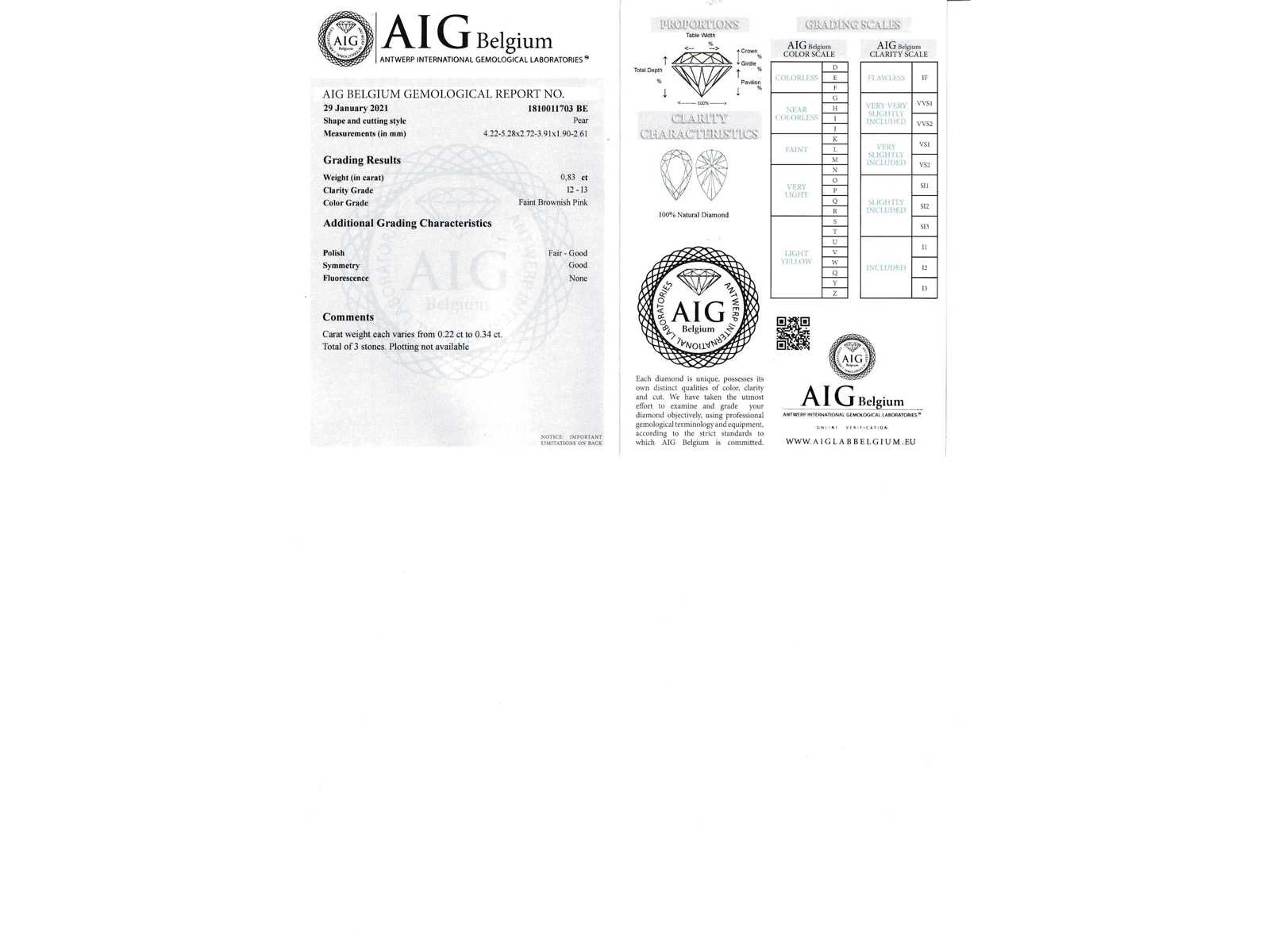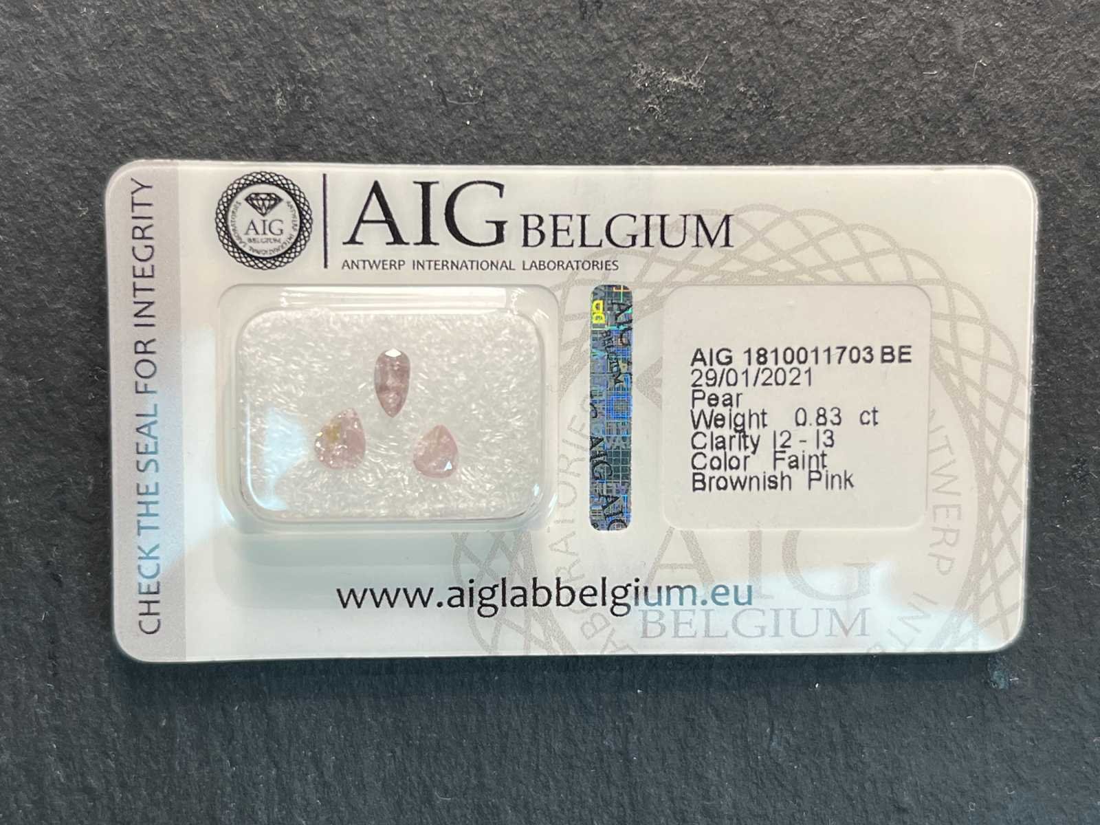 Samenvatting van gegevens Diamant - 0.83 carat natuurlijk roze diamant (gecertificeerd) Diamant: Natuurlijk; Aantal: 3 stuks; Slijpvorm: druppelvorm geslepen; Gewicht (carat): 0.83 carat; Kleur: Faint brownish pink; Zuiverheid: I2-I3; Certificaat: AIG; Certificaat nummer: 1810011703; Conditie: Nieuw; Verpakking: Edelsteendoos; Toelichting: De kwaliteit is overgenomen van het rapport behorend bij item. De waardebepaling is een beoordeling van een gecertificeerde diamantair, gebaseerd op consumentenprijzen.; Consumentenprijs: € 1.980,- Within 14 days Voornaamste diamant: Natuurlijk Kleur diamant: Faint brownish pink Gewicht diamant: 0.83ct Slijpvorm diamant: druppelvorm geslepen Zuiverheidsgraad diamant: I2-I3 Certificaat: AIG