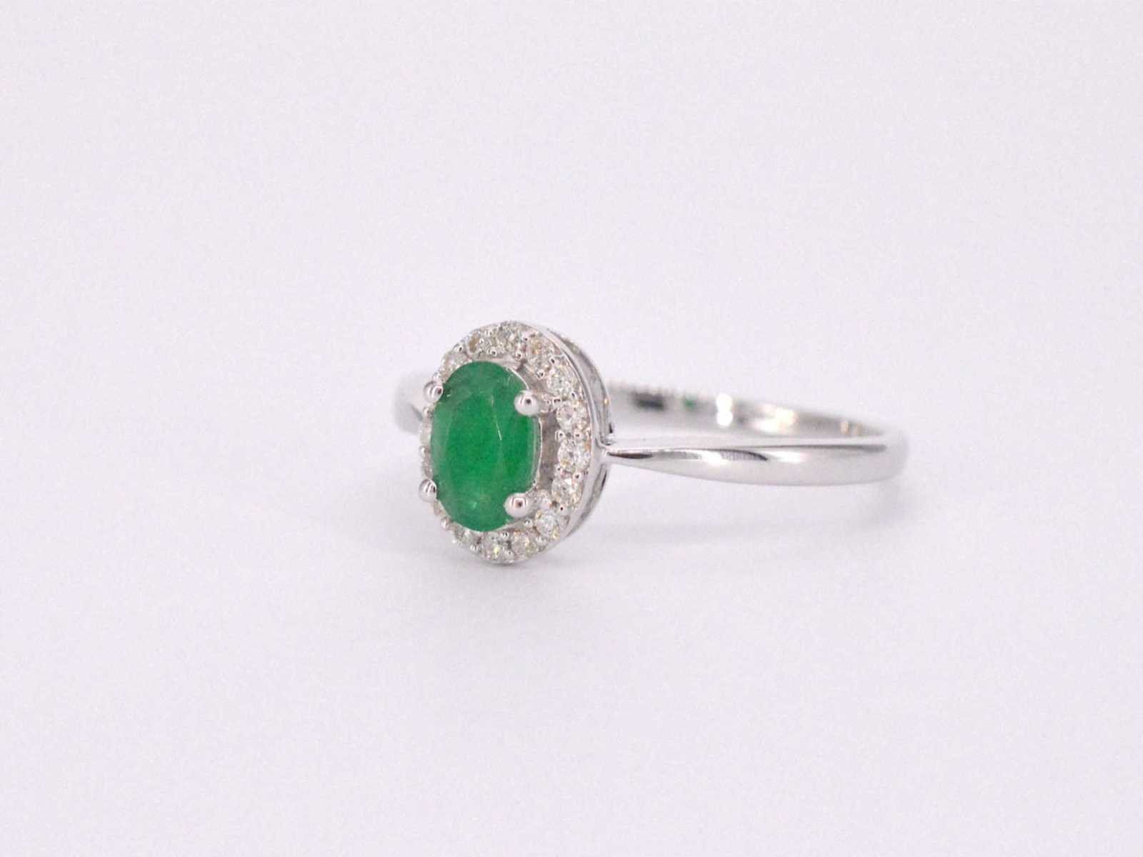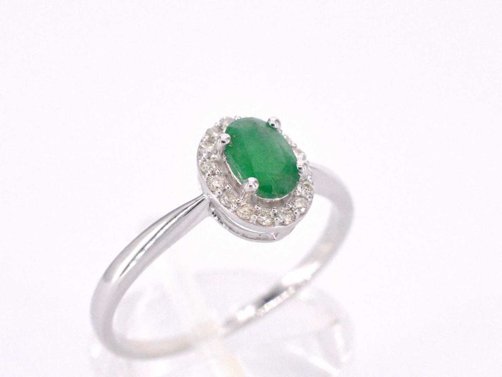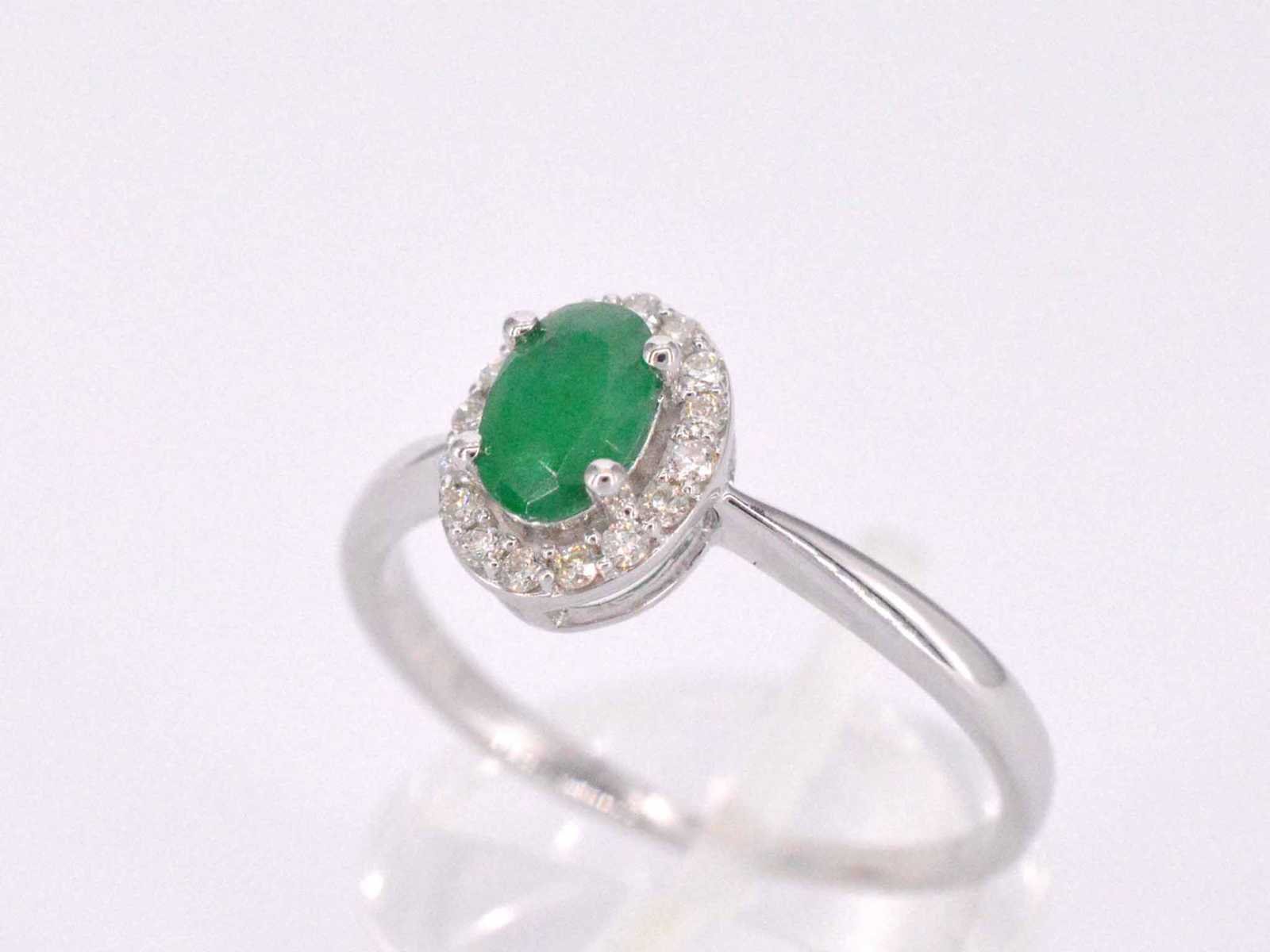 Samenvatting van gegevens Witgouden entourage ring met diamanten en smaragd Diamant: Natuurlijk; Slijpvorm: Briljant geslepen; Gewicht (carat): 0.12 carat; Kleur: F-G; Zuiverheid: SI-P; Slijpkwaliteit: Zeer mooi; Edelsteen: Smaragd; Slijpvorm: Ovaal; Gewicht (carat): 0.55 carat; Juweel: Ring; Gewicht: 2.2 gram; Ringmaat (op maat gemaakt*): 54 (17.25 mm); Materiaal: 14k goud (585); Conditie: Nieuw; Verpakking: Luxe sieradendoos; Toelichting: De kwaliteit is overgenomen van het rapport behorend bij item. De waardebepaling is een beoordeling van een gecertificeerde diamantair, gebaseerd op consumentenprijzen.; Consumentenprijs: € 1.348,- Within 14 days Materiaal: Goud Voornaamste diamant: Natuurlijk Gewicht diamant: 0.12ct Edelsteen: Smaragd Totaal gewicht: 2.2g Keurmerk: 585 Kleur diamant: F-G Slijpvorm diamant: Briljant geslepen Slijpkwaliteit diamant: Zeer mooi Zuiverheidsgraad diamant: SI-P Slijpvorm edelsteen: Ovaal