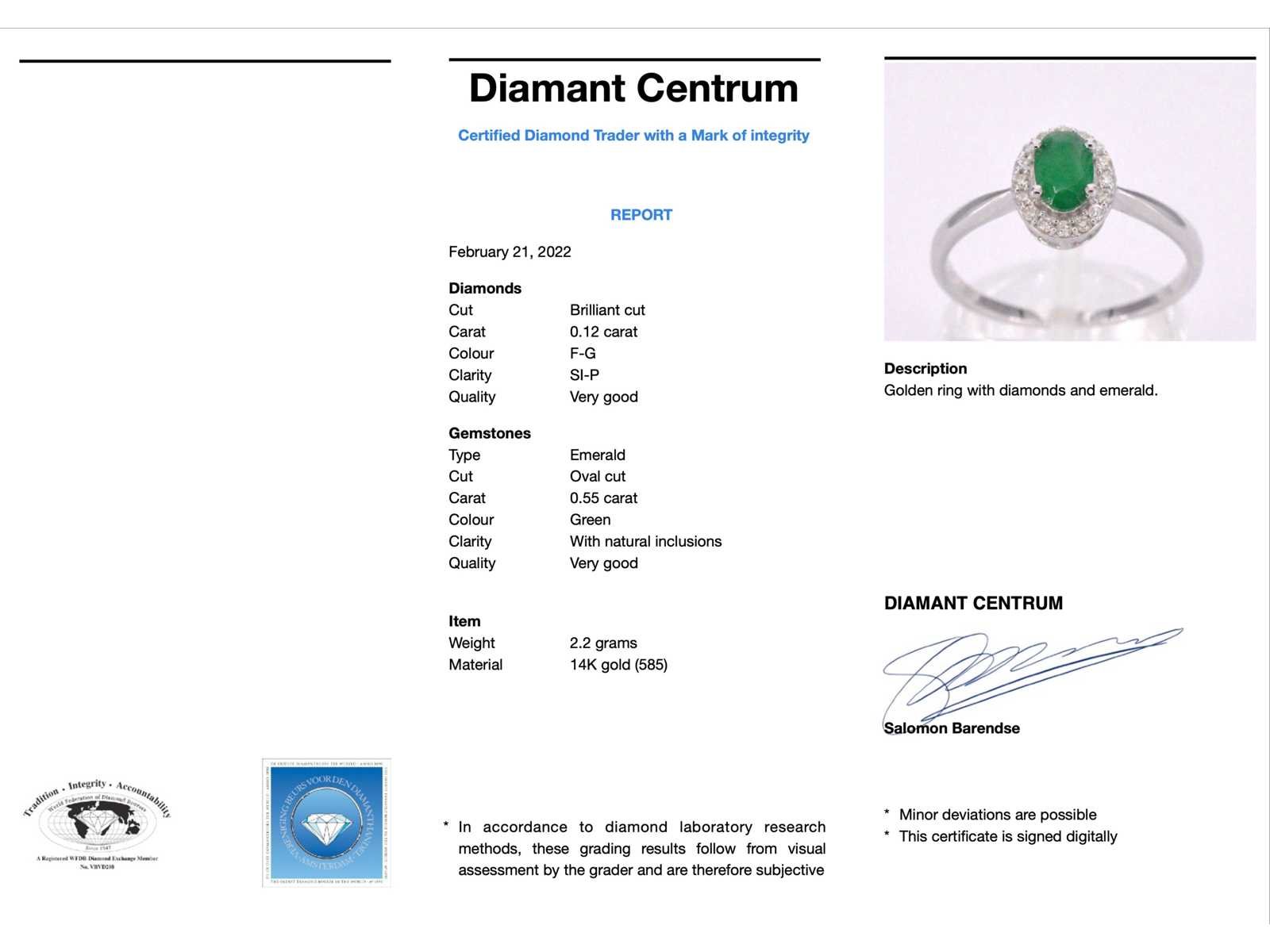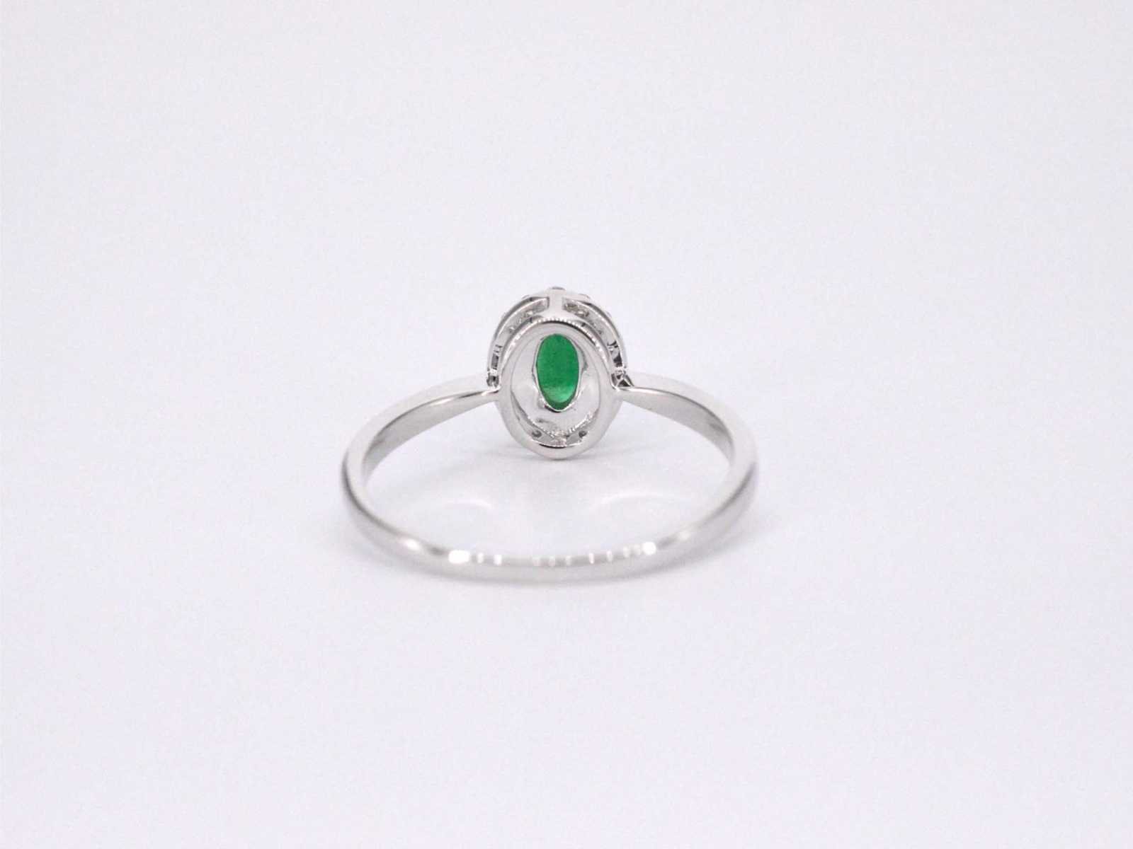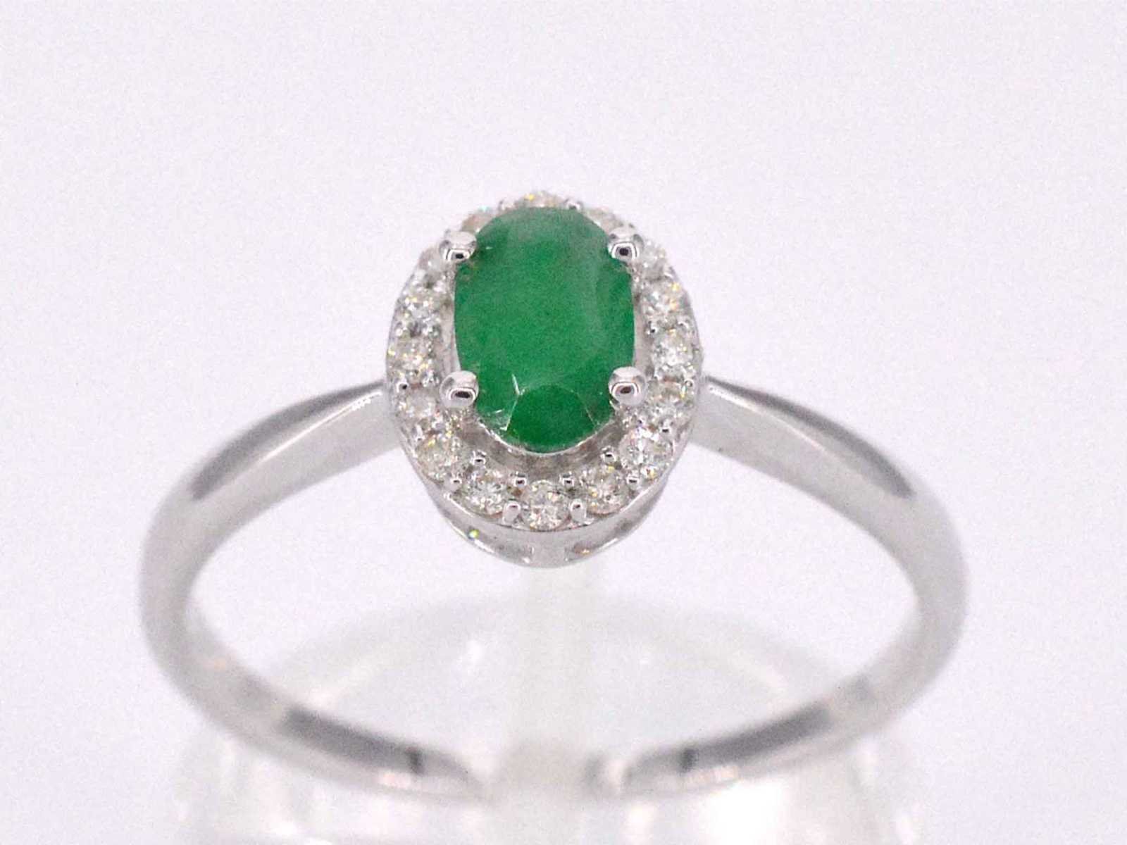 Samenvatting van gegevens Witgouden entourage ring met diamanten en smaragd Diamant: Natuurlijk; Slijpvorm: Briljant geslepen; Gewicht (carat): 0.12 carat; Kleur: F-G; Zuiverheid: SI-P; Slijpkwaliteit: Zeer mooi; Edelsteen: Smaragd; Slijpvorm: Ovaal; Gewicht (carat): 0.55 carat; Juweel: Ring; Gewicht: 2.2 gram; Ringmaat (op maat gemaakt*): 54 (17.25 mm); Materiaal: 14k goud (585); Conditie: Nieuw; Verpakking: Luxe sieradendoos; Toelichting: De kwaliteit is overgenomen van het rapport behorend bij item. De waardebepaling is een beoordeling van een gecertificeerde diamantair, gebaseerd op consumentenprijzen.; Consumentenprijs: € 1.348,- Within 14 days Materiaal: Goud Voornaamste diamant: Natuurlijk Gewicht diamant: 0.12ct Edelsteen: Smaragd Totaal gewicht: 2.2g Keurmerk: 585 Kleur diamant: F-G Slijpvorm diamant: Briljant geslepen Slijpkwaliteit diamant: Zeer mooi Zuiverheidsgraad diamant: SI-P Slijpvorm edelsteen: Ovaal