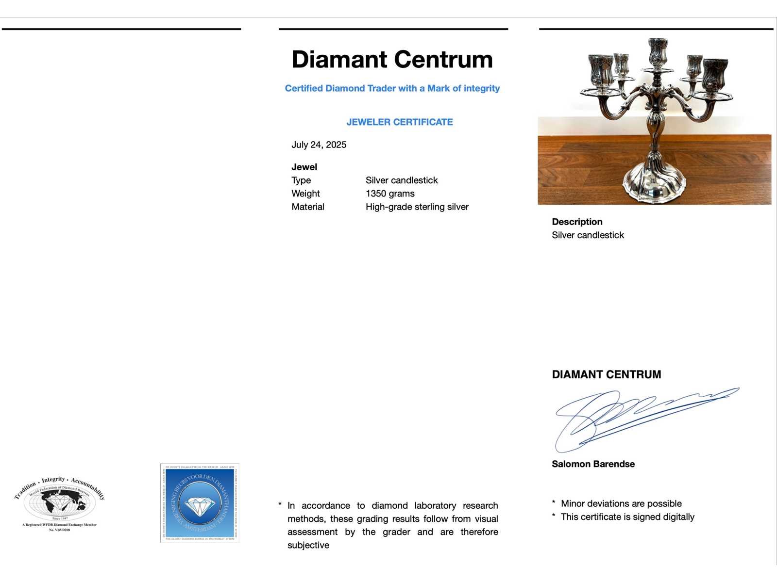 Samenvatting van gegevens ZIlveren kandelaar Juweel: Zilveren kandelaar; Gewicht: 1350 gram; Materiaal: Hoog gehalte sterling zilver; Conditie: Vintage; Toelichting: De kwaliteit is overgenomen van het rapport behorend bij item. De waardebepaling is een beoordeling van een gecertificeerde diamantair, gebaseerd op consumentenprijzen.; Consumentenprijs: € 14.000,- Within 14 days Materiaal: Zilver