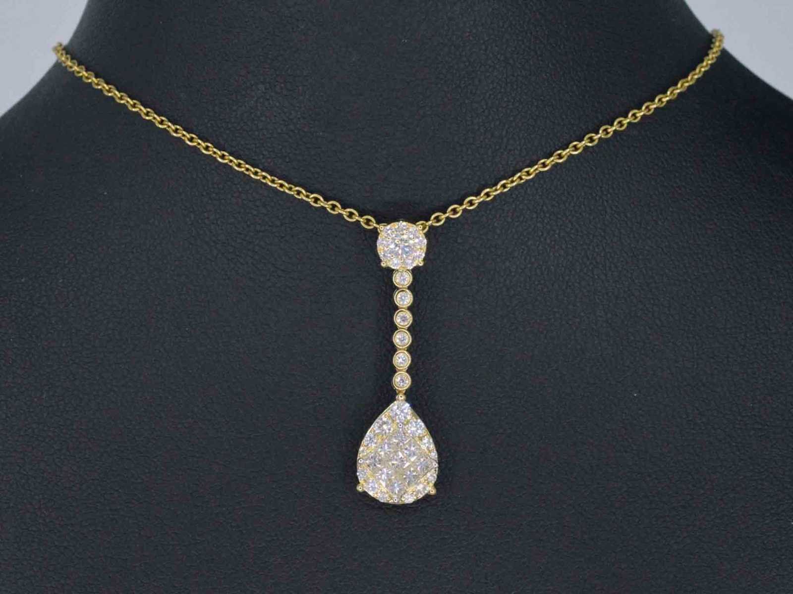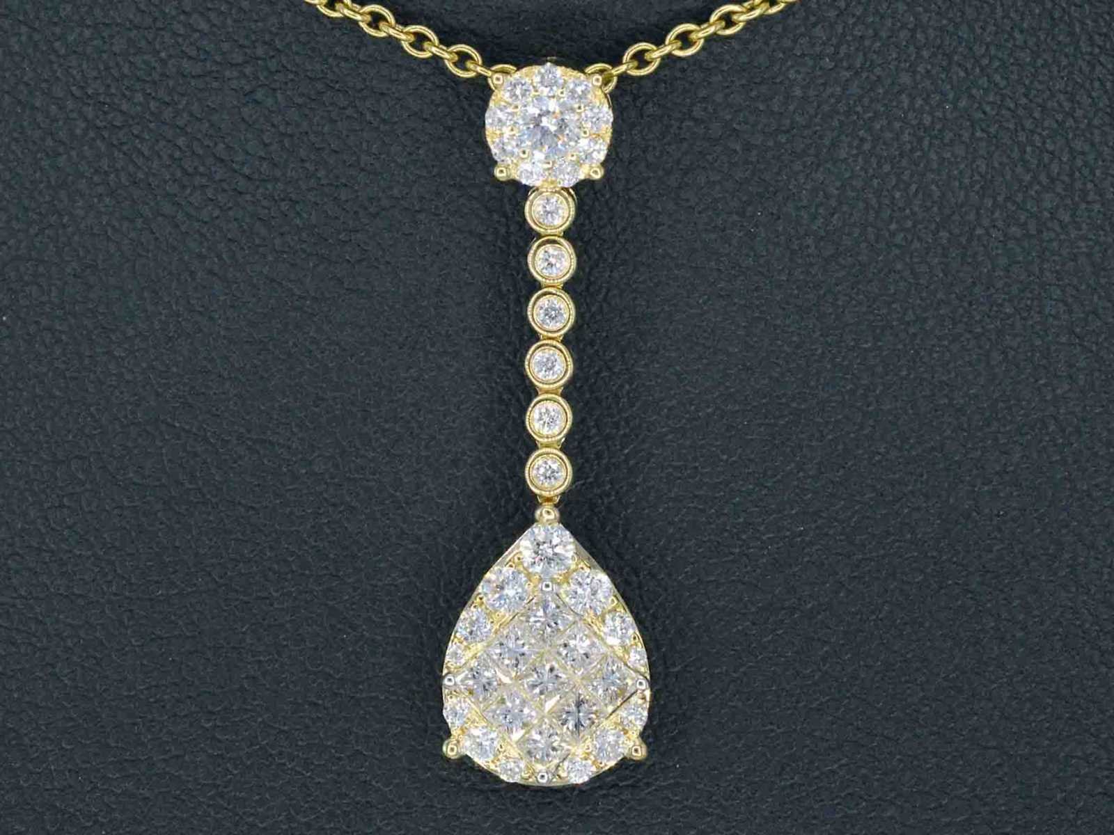 Samenvatting van gegevens Gouden druppelvormige hanger met briljant en princess geslepen diamanten Diamant: Natuurlijk; Slijpvorm: Briljant en prinses geslepen; Gewicht (carat): 1.00 carat; Kleur: F-G; Zuiverheid: VS; Slijpkwaliteit: Zeer mooi; Juweel: Hanger (excl. ketting); Gewicht: 2.3 gram; Afmetingen/lengte: 3 cm; Materiaal: 18K goud (750); Conditie: Nieuw; Verpakking: Luxe sieradendoos; Toelichting: De kwaliteit is overgenomen van het rapport behorend bij item. De waardebepaling is een beoordeling van een gecertificeerde diamantair, gebaseerd op consumentenprijzen.; Consumentenprijs: € 6.930,- Within 14 days Materiaal: Goud Voornaamste diamant: Natuurlijk Kleur diamant: F-G Gewicht diamant: 1.00ct Slijpvorm diamant: Briljant en prinses geslepen Slijpkwaliteit diamant: Zeer mooi Zuiverheidsgraad diamant: VS Totaal gewicht: 2.3g Keurmerk: 750