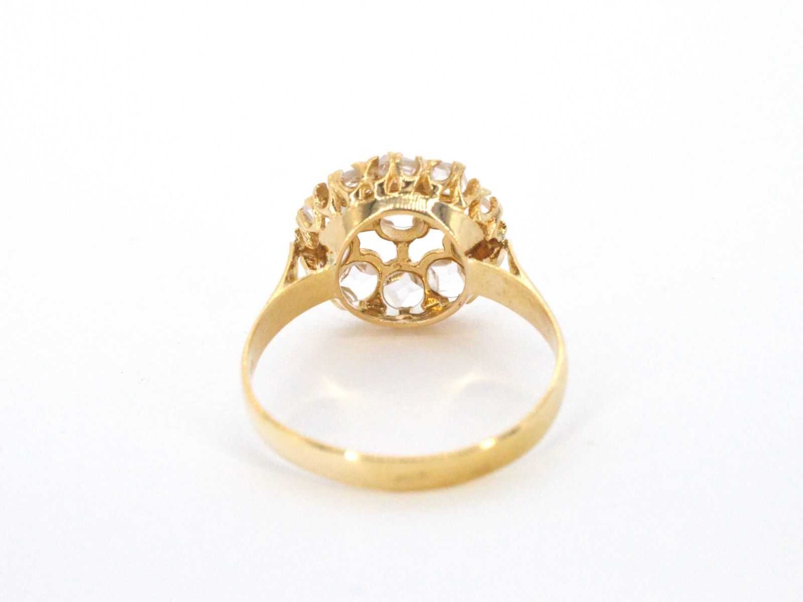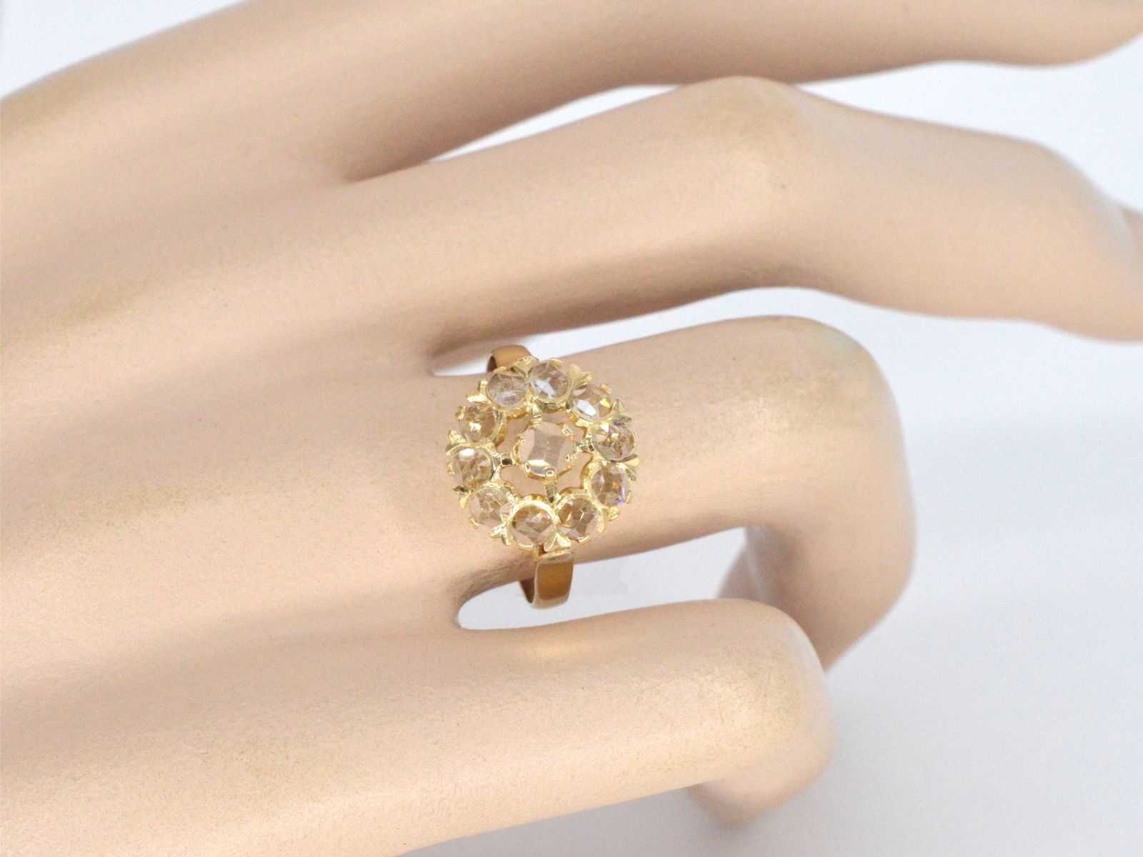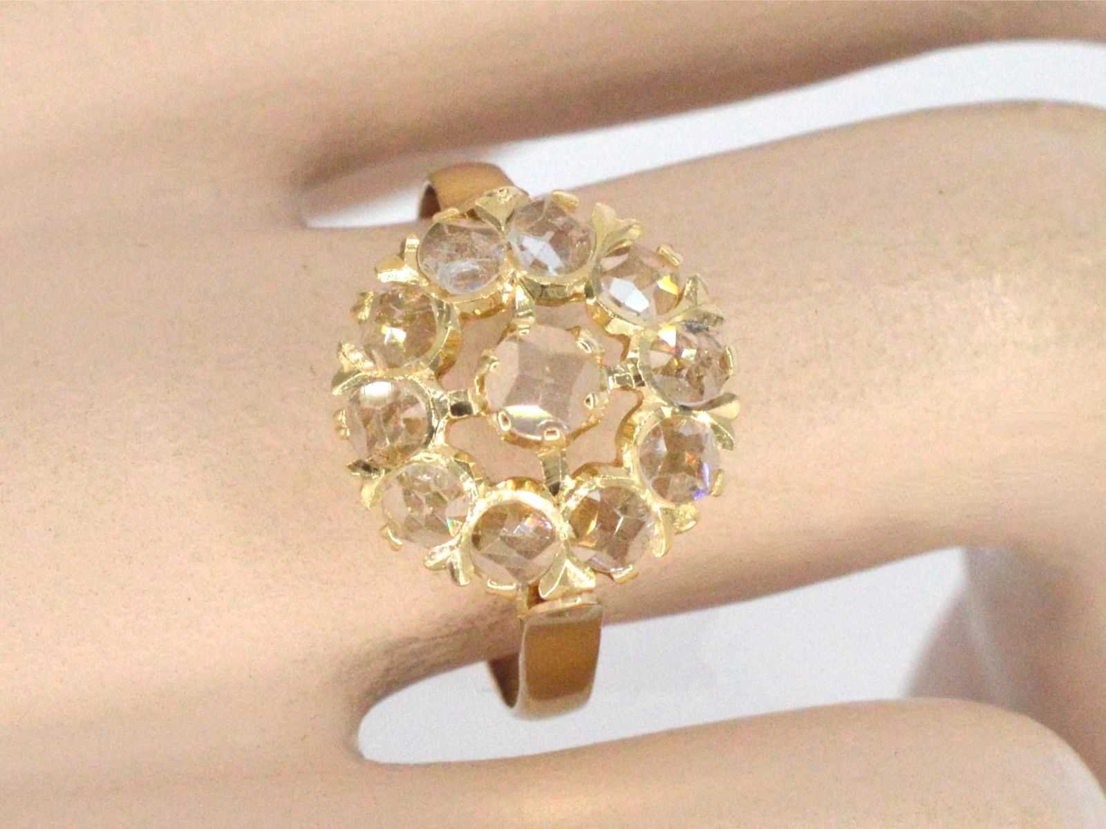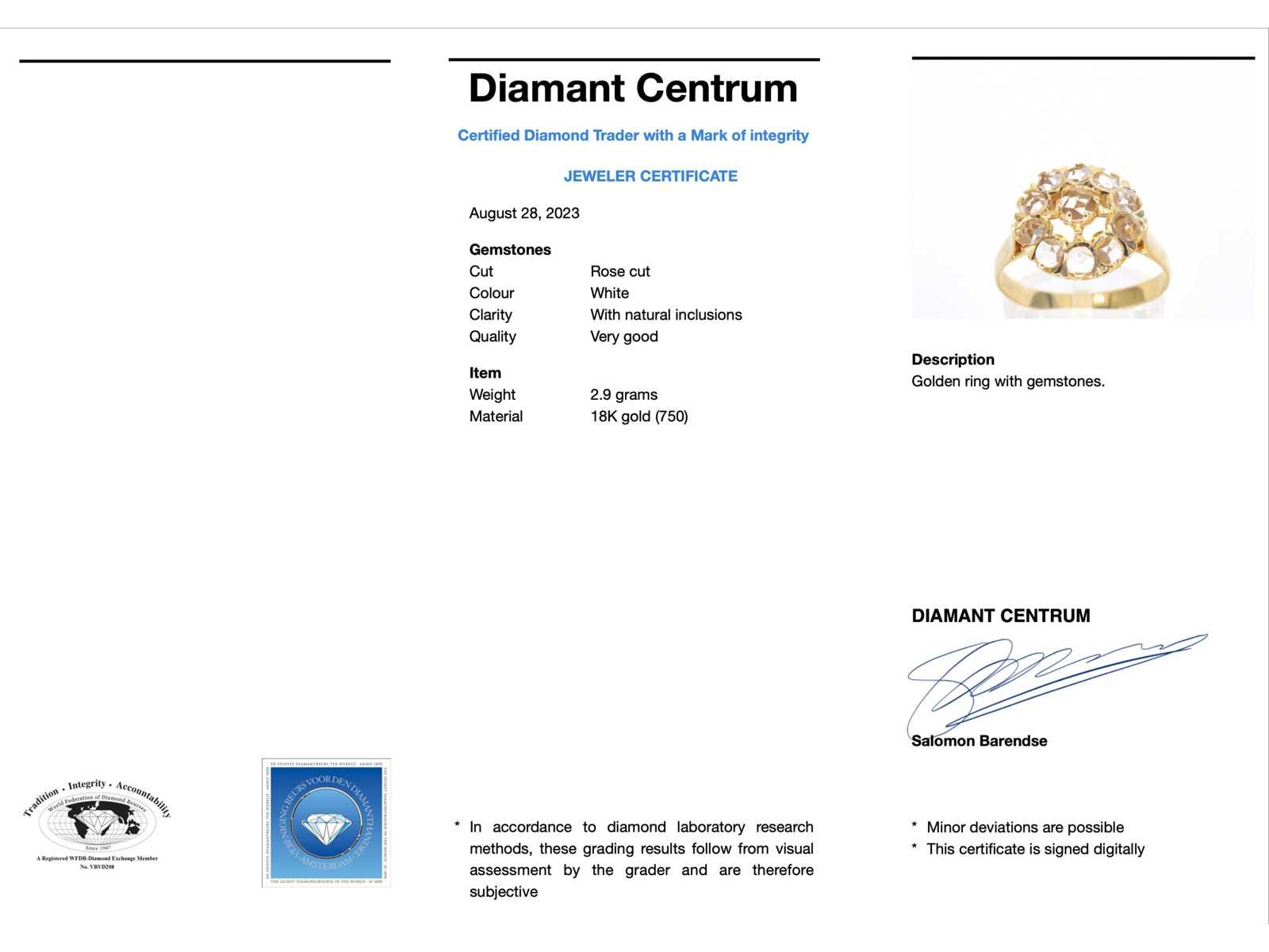 Samenvatting van gegevens Gouden ring met edelstenen Edelsteen: Natuurlijk; Aantal: 1 stuk; Slijpvorm: Roos geslepen; Kleur: wit; Zuiverheid: Met natuurlijke insluitsels; Slijpkwaliteit: Zeer mooi; Juweel: Ring; Gewicht: 2.9 gram; Ringmaat (op maat gemaakt*): 57 (18 mm); Materiaal: 18k goud (750); Conditie: Zo goed als nieuw; Verpakking: Luxe sieradendoos; Toelichting: De kwaliteit is overgenomen van het rapport behorend bij item. De waardebepaling is een beoordeling van een gecertificeerde diamantair, gebaseerd op consumentenprijzen.; Consumentenprijs: € 1.960,- Within 14 days Materiaal: Goud Edelsteen: Natuurlijk Totaal gewicht: 2.9g Keurmerk: 750 Kleur edelsteen: wit Slijpvorm edelsteen: Roos geslepen Slijpkwaliteit edelsteen: Zeer mooi Zuiverheidsgraad edelsteen: Met natuurlijke insluitsels