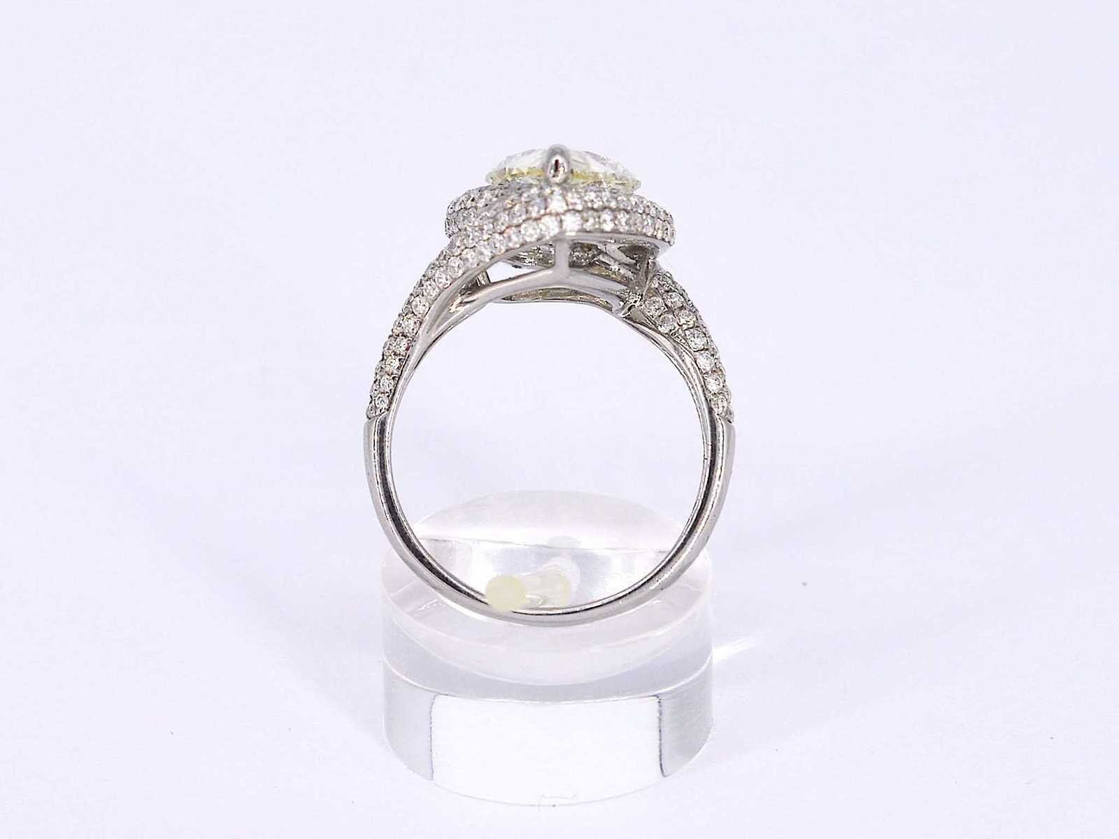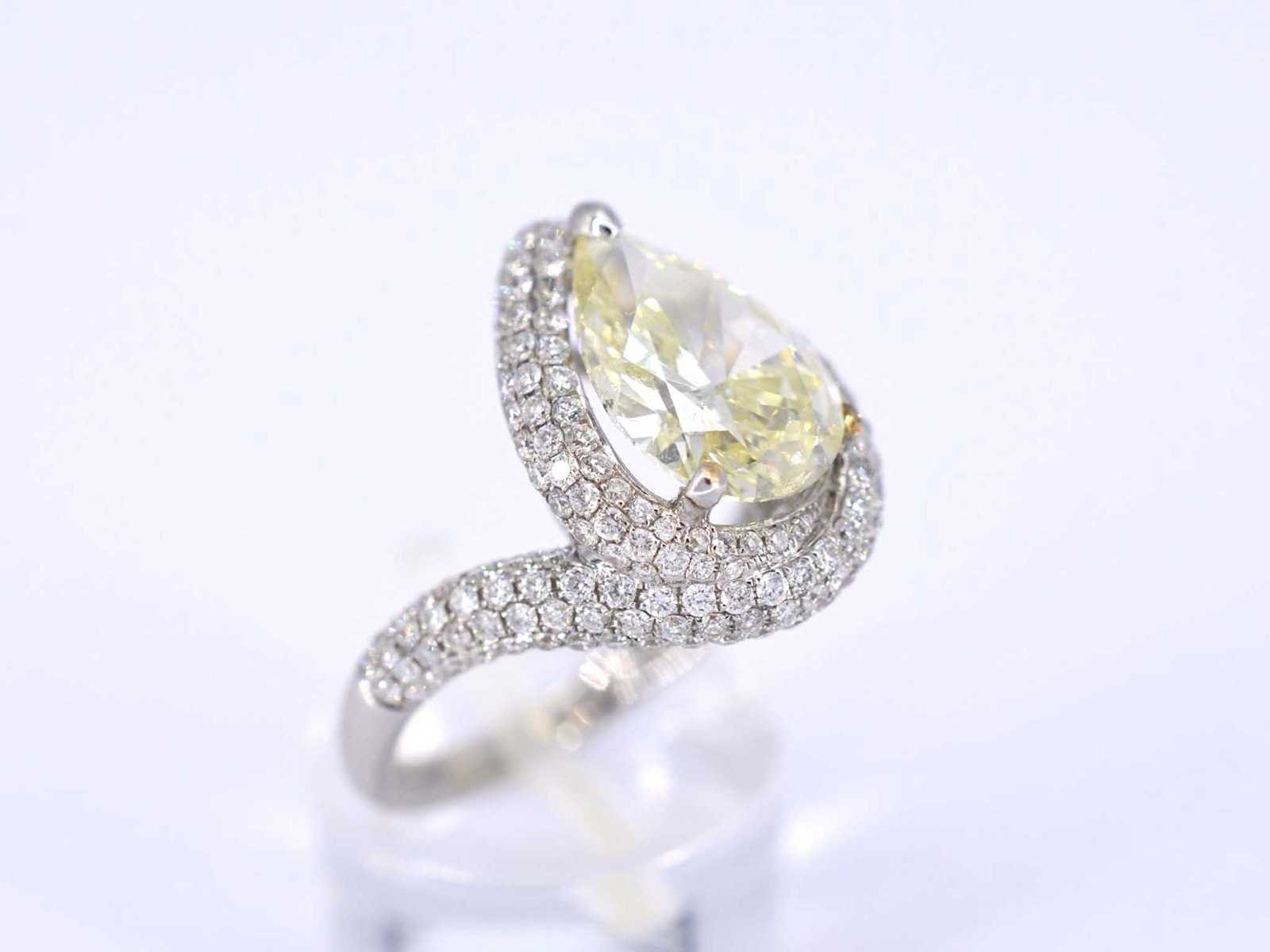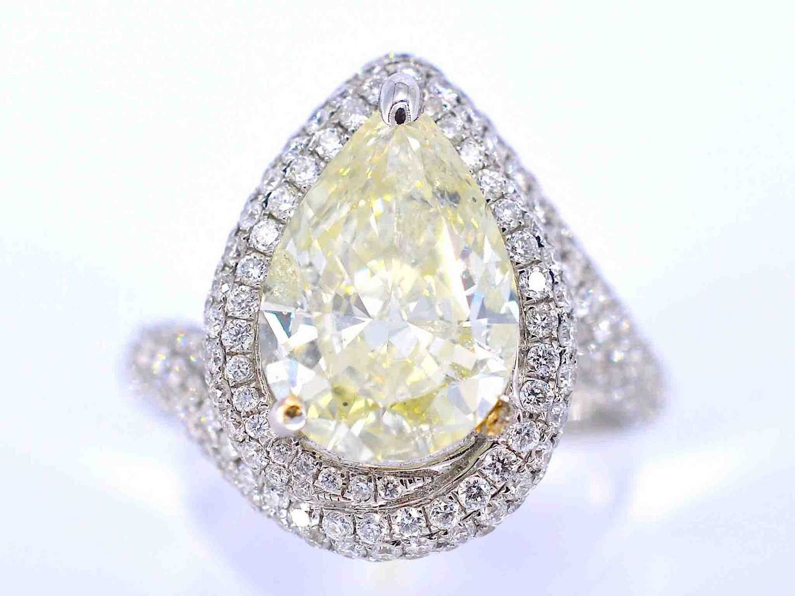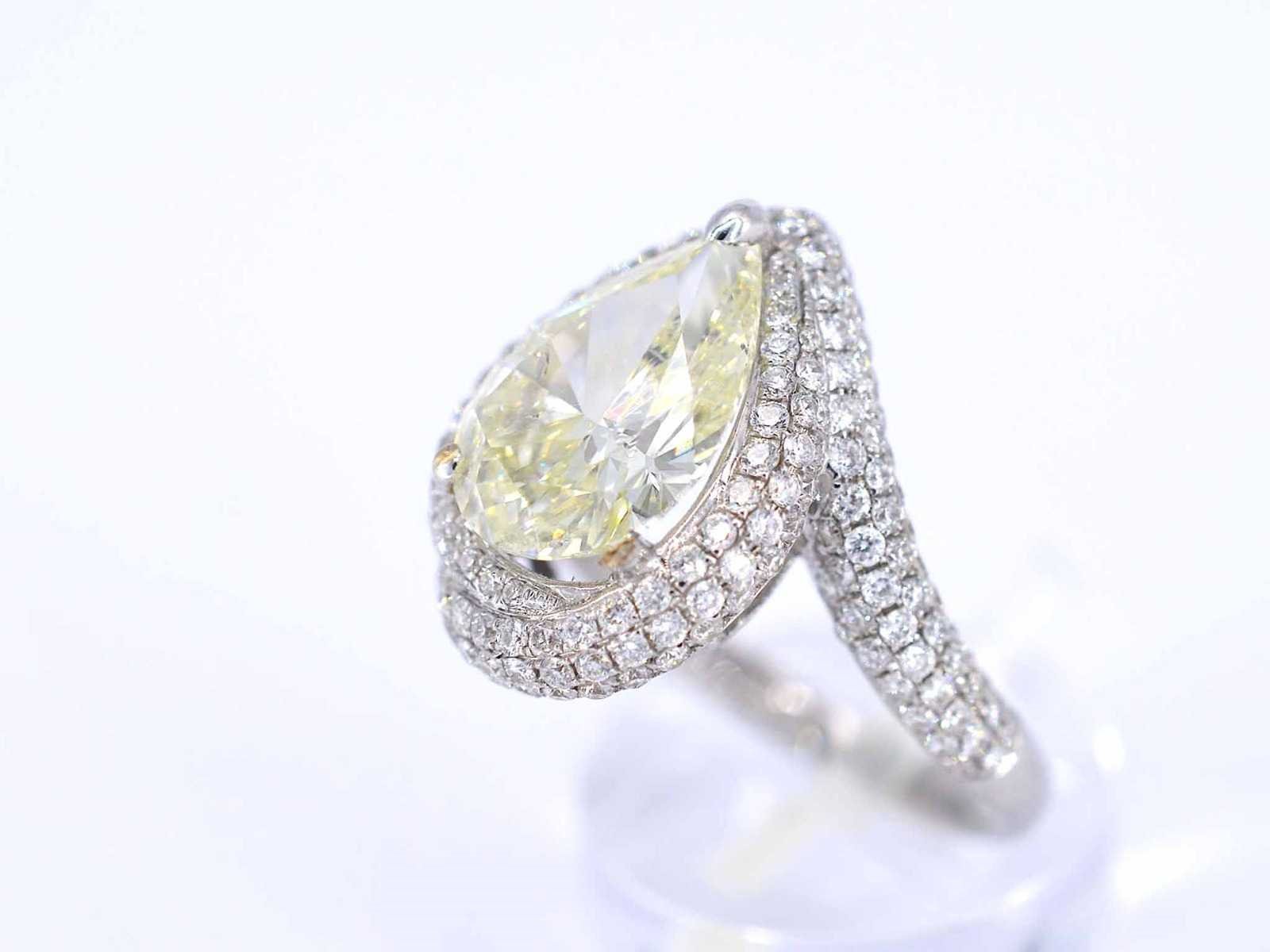 Samenvatting van gegevens Witgouden bijzondere diamanten ring met een pear shape diamant van 3.00 carat Diamant: Natuurlijk; Aantal: 1 stuk; Slijpvorm: Pear shape; Gewicht (carat): 3.00 carat; Kleur: Warm getint; Zuiverheid: SI2; Slijpkwaliteit: Zeer mooi; Diamant (secundair): Entourage; Slijpvorm: Briljant geslepen; Gewicht (carat): 1.00 carat totaal; Kleur: F-G; Zuiverheid: VS; Juweel: Ring; Gewicht: 4.6 gram; Ringmaat (op maat gemaakt*): 54 (17.25 mm); Materiaal: 18K goud (750); Conditie: Zo goed als nieuw; Verpakking: Luxe sieradendoos; Toelichting: De kwaliteit is overgenomen van het rapport behorend bij item. De waardebepaling is een beoordeling van een gecertificeerde diamantair, gebaseerd op consumentenprijzen.; Consumentenprijs: € 45.000,- Within 14 days Voornaamste diamant: Natuurlijk Kleur diamant: Warm getint Gewicht diamant: 3.00ct Slijpvorm diamant: Pear shape Slijpkwaliteit diamant: Zeer mooi Zuiverheidsgraad diamant: SI2 Totaal gewicht: 4.6g Keurmerk: 750 Materiaal: Goud