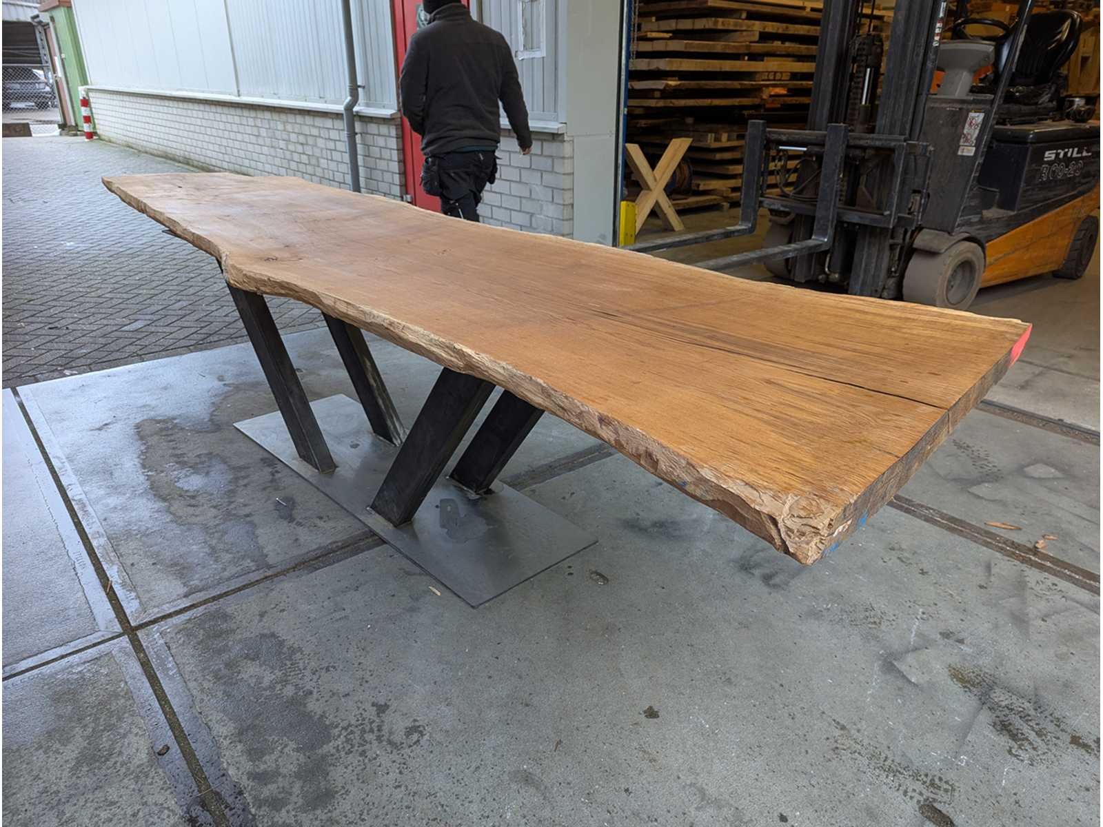 Blad dikte 6cm Met zwaar metaal onderstel Lengte: 370cm Breedte: 80cm Hoogte: 78cm Materiaal: eiken