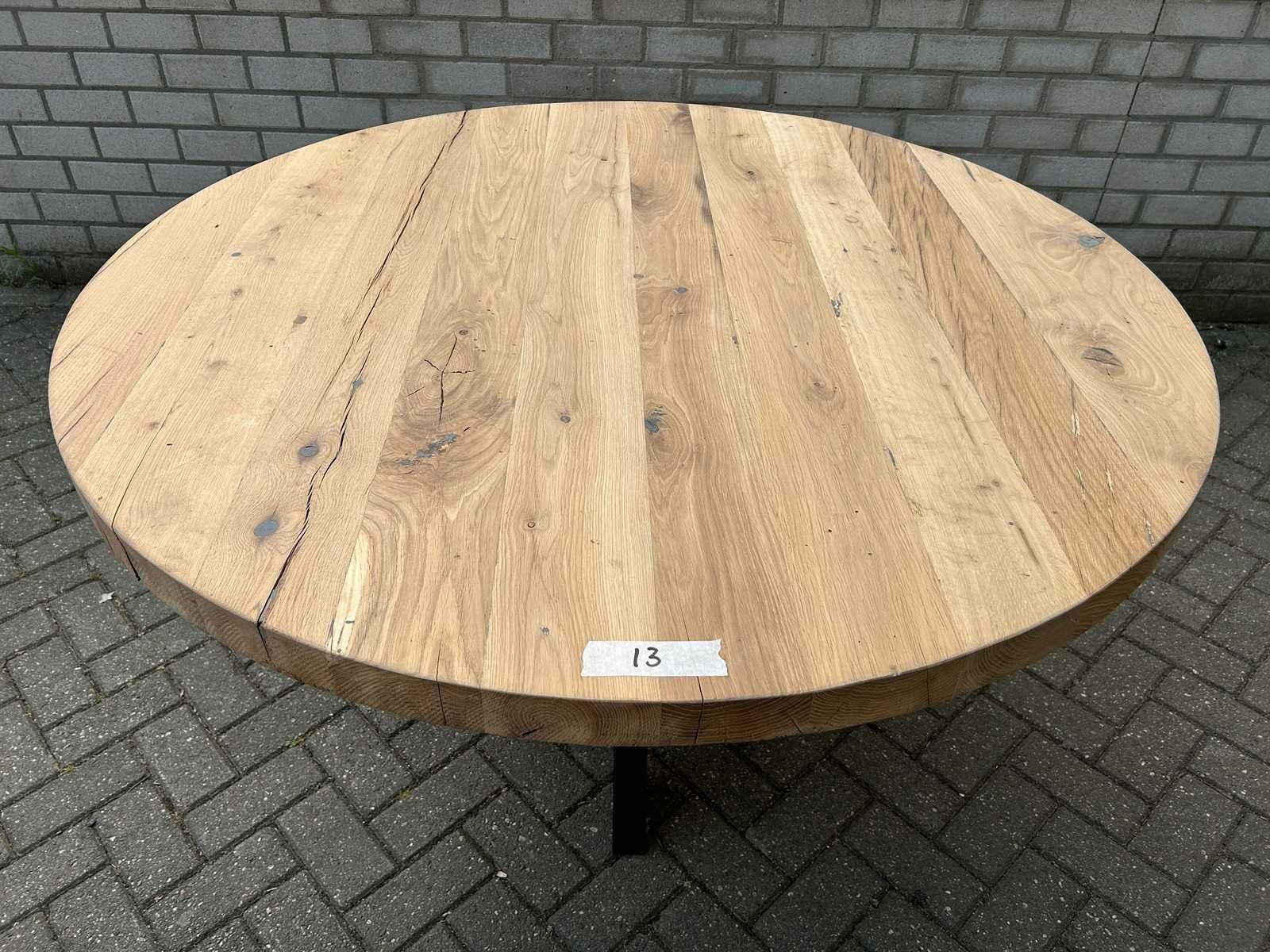 Blad dikte 60 mm. Metalen onderstel Lengte: 140cm Breedte: 140cm Hoogte: 78cm Materiaal: Eiken