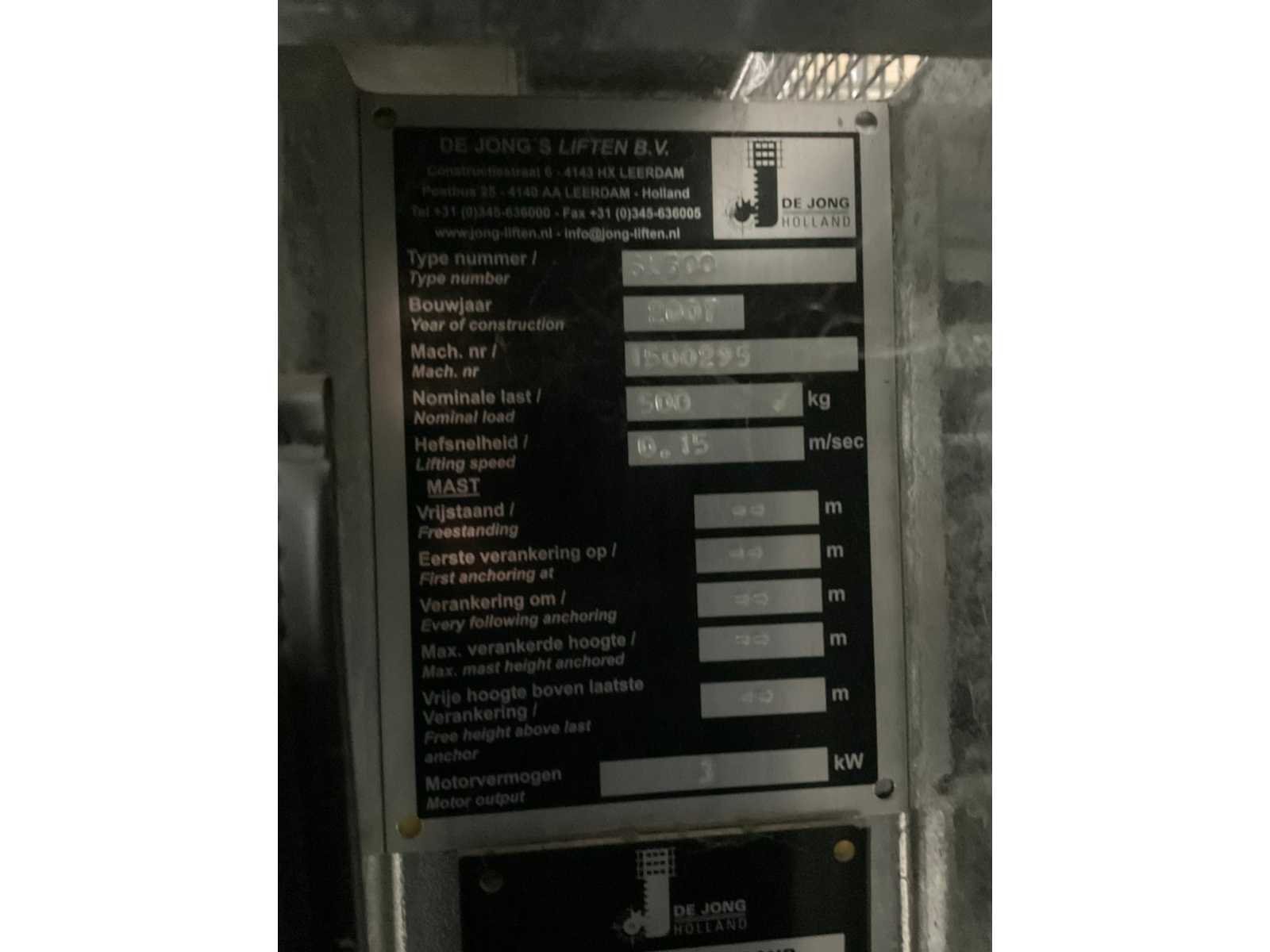 Merk: De Jong Type: SL500 Bouwjaar: 2007 Serienummer: 1500295 Hefvermogen: 500kg Plaatafmeting l: 3000mm Plaatafmeting b: 1450mm Aansluiting: 400V Totale afmeting L: 2500mm Totale afmeting Breedte: 3300mm Totale afmeting Hoogte: 8600mm