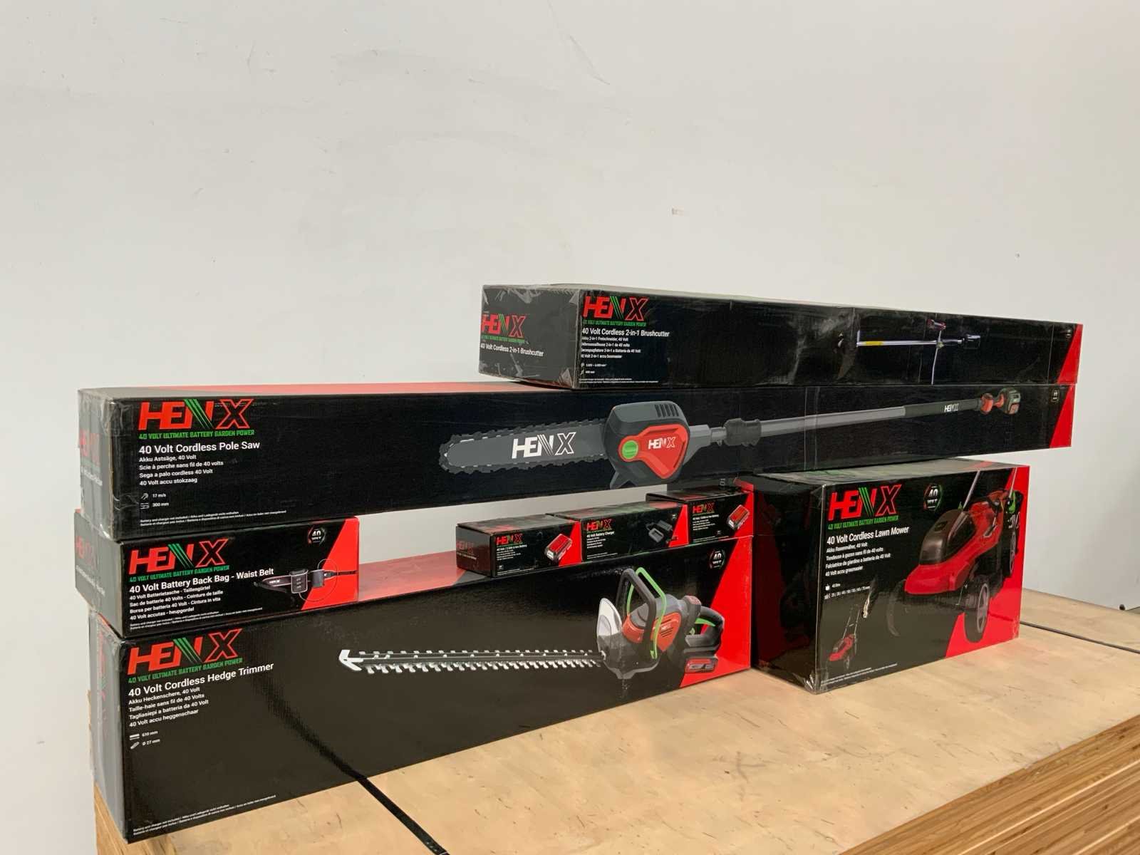 2 accu’s; 2.5AH & 5.0AH; 1x grasmaaier; 1x heggenschaar; 1x kettingzaag; 1x 2in1 bruschcutter; 40V batterij waist belt; Merk: Henx