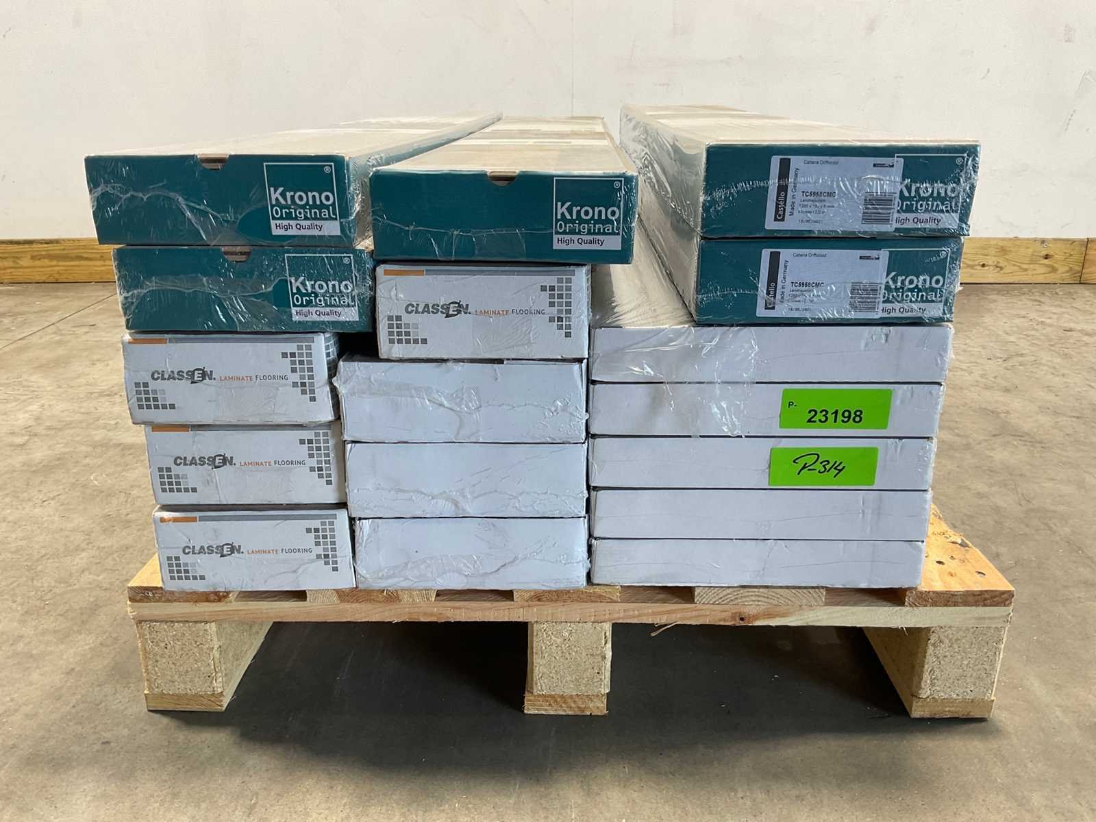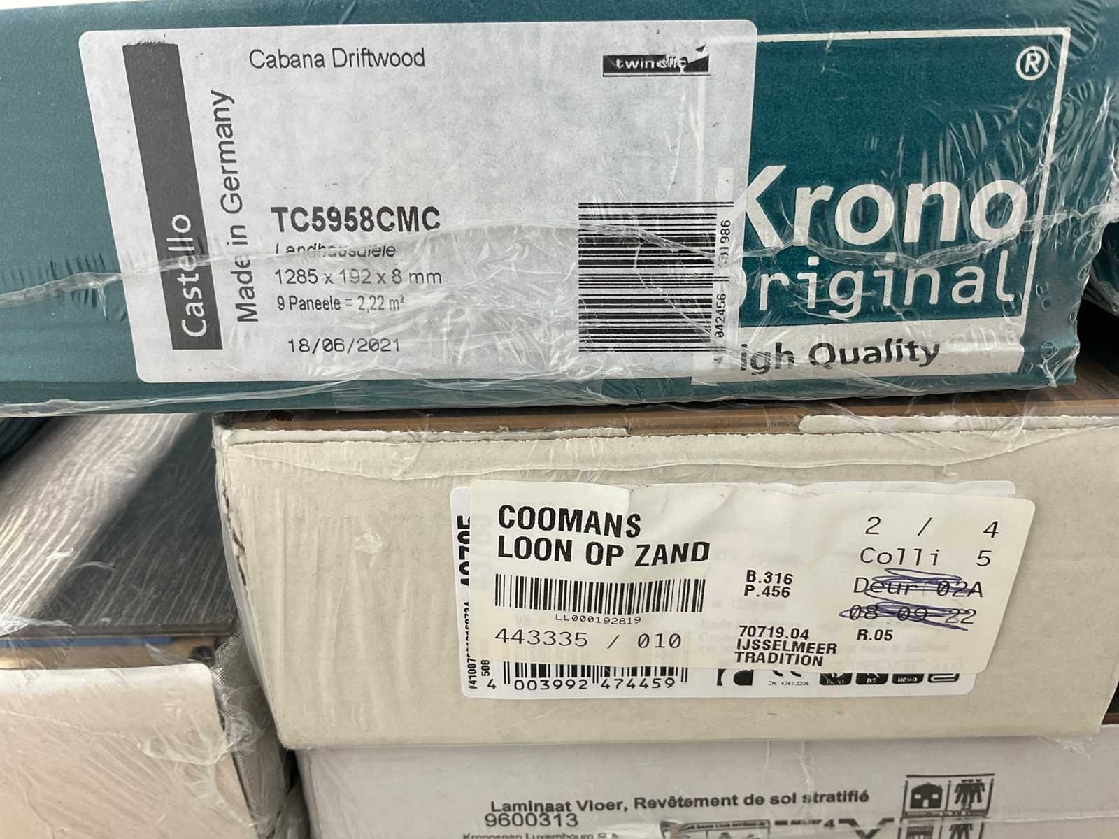 Mixpallet met diverse soorten laminaat – ongeveer 17 pakken, goed voor circa 38 m². Bekijk de foto’s voor specificaties en details.