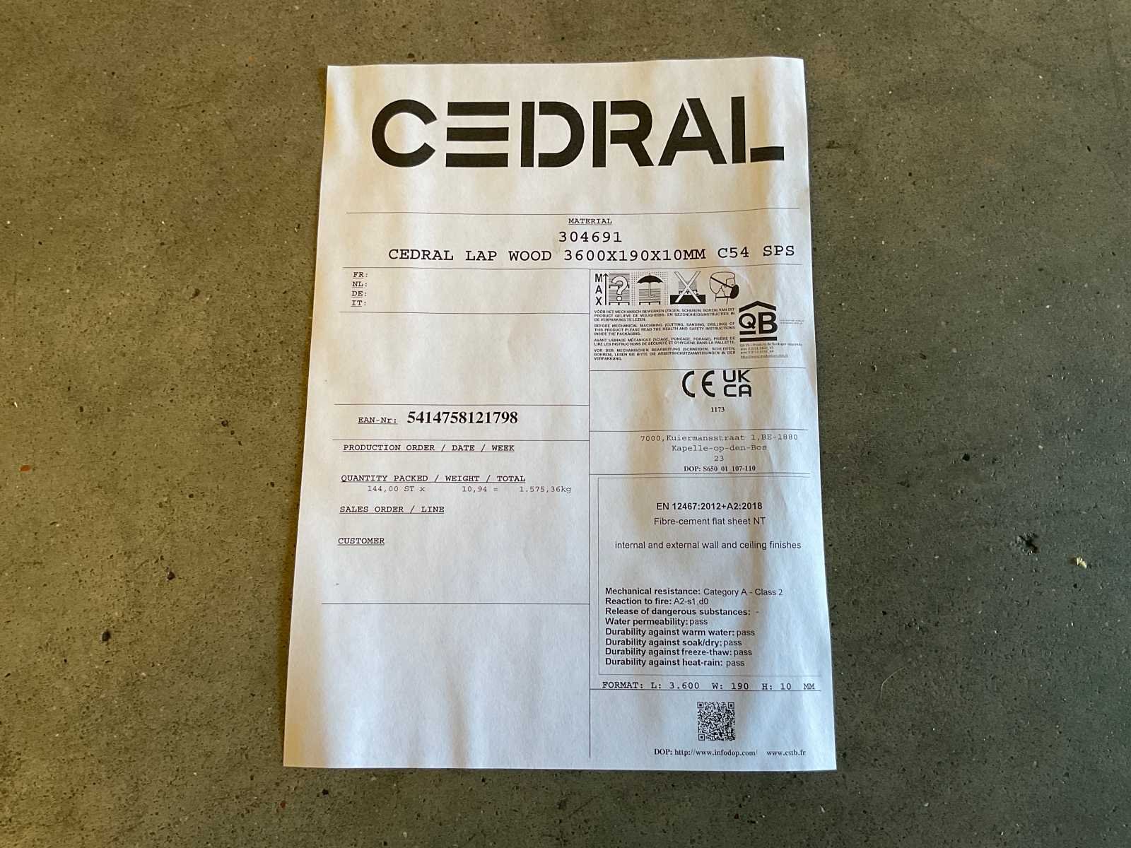 Technische specificaties: Gewicht per gevelstrook: 11.20 kg Brandklasse: A2-s1,d0 Afmetingen pakket: 360x116x36cm, 1.615 kg Merk: Cedral Model: Lap Wood Kleur: Tingrijs Gewicht: 11.2kg Lengte: 360cm Breedte: 19cm Hoogte: 1cm Materiaal: Cementvezel