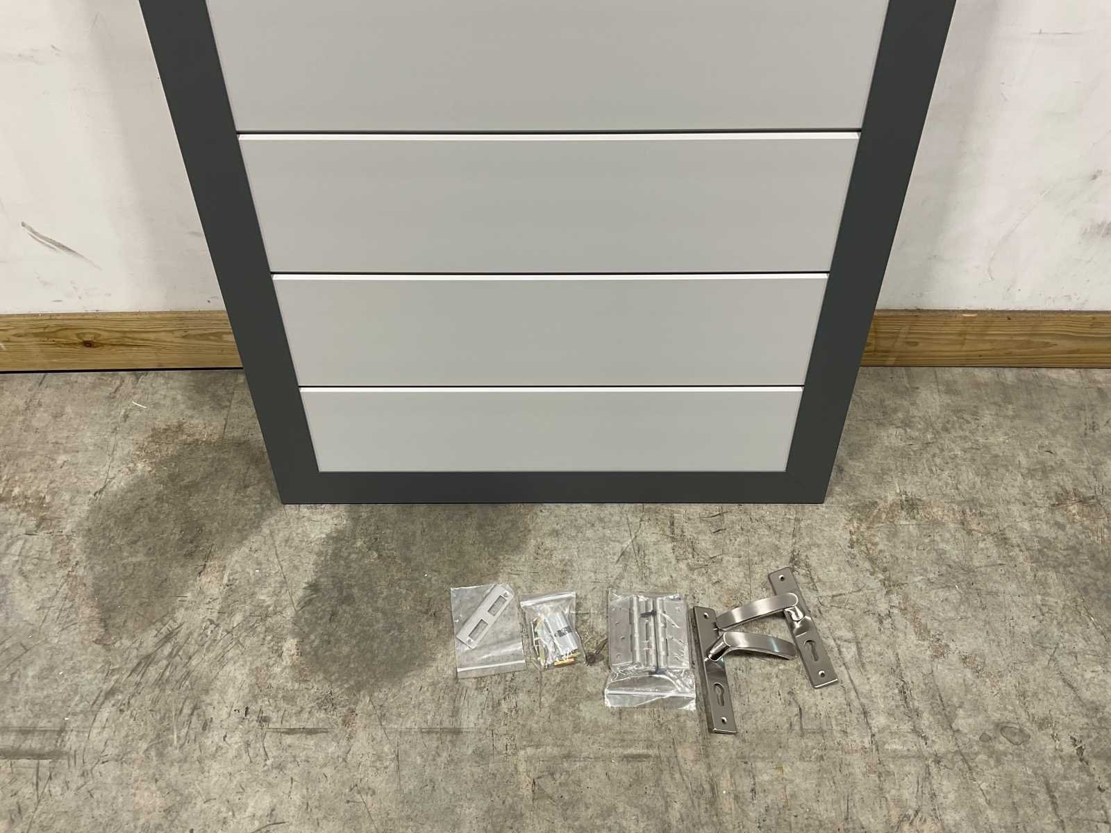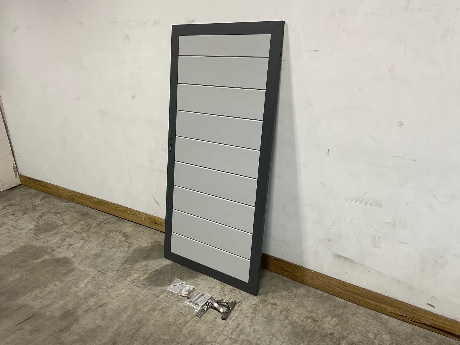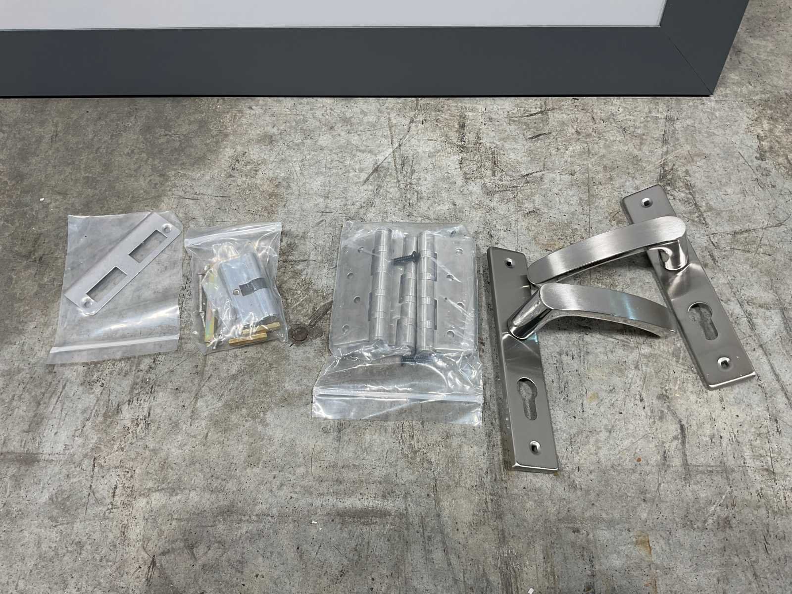 Kavel bevat: 1x Aluminium deur in aluminium frame (183 x 90 cm) 1x Hang- en sluitwerk Let op: Wordt geleverd ZONDER palen. Buitendeur: true Stomp: true Afmeting h: 1830mm Afmeting b: 930mm Aluminium: true Kleur: Lichtgrijs