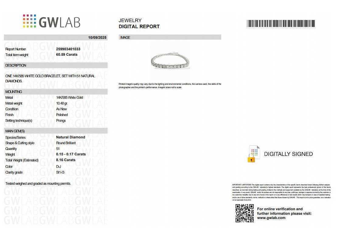 Ongebruikt Slijpvorm: Rond Briljant Carat: 8,16 crt Kleur: D-J Bezichtiging op afspraak Materiaal: Wit goud Gewicht edelsteen: 8,16 Slijpvorm edelsteen: Briljant Lengte: 18cm Totaal gewicht: 12.11g Lage schatting: 12500€