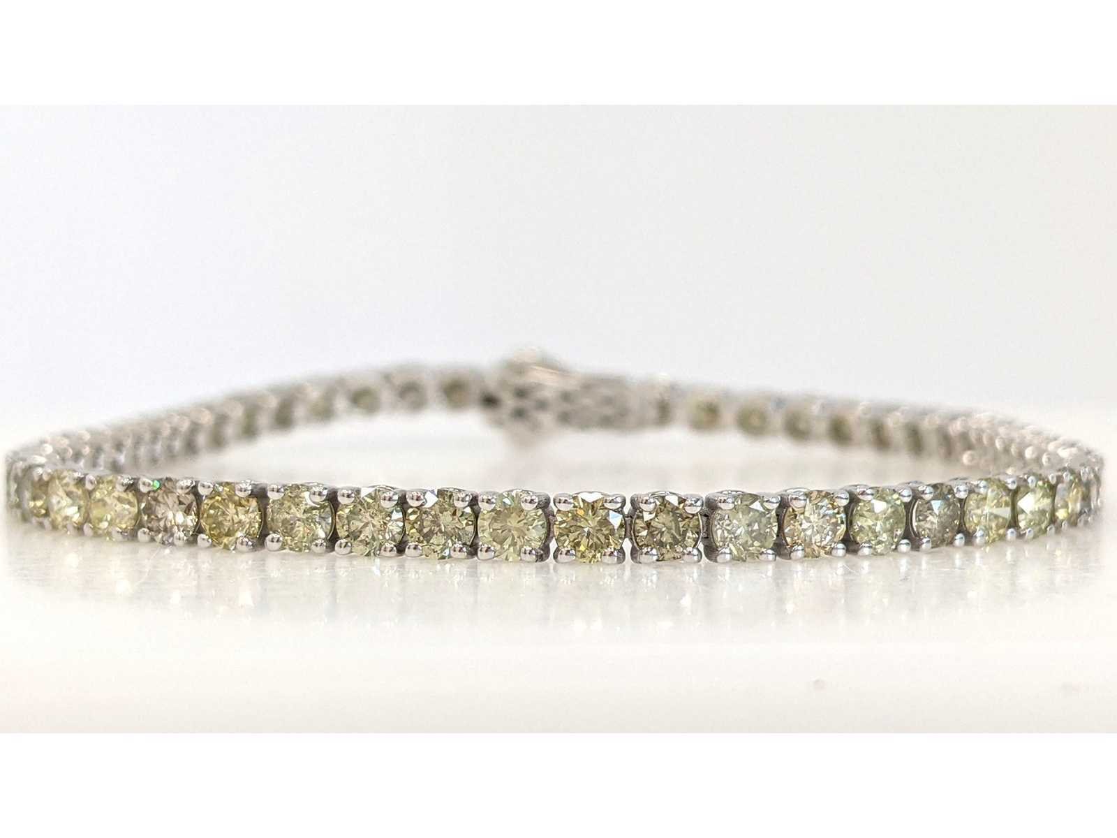 Witgouden tennisarmband met natuurlijke diamanten Geslepen: Rond Brilliant Karaat: 6,29 cttw / 55 stenen Kleur: Natuurlijk gekleurd Clarity: SI - I1 Grootte: 18 cm Bezichtiging op afspraak Materiaal: Witgoud Lengte: 18cm Certificaat: ja Lage schatting: 9800€