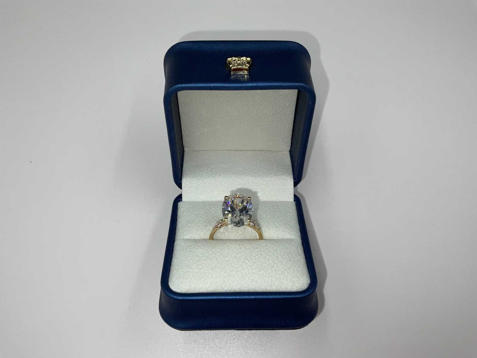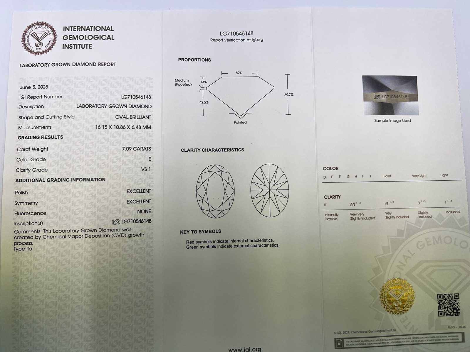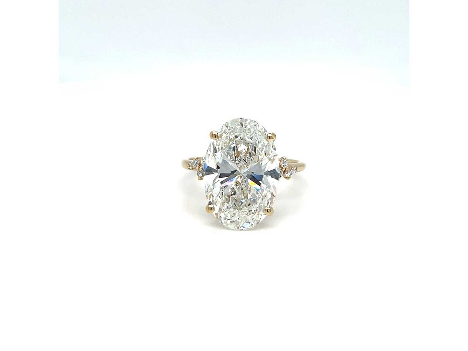 Vorm: ovaal Gewicht: 7,09 CT Kleur: E Helderheid: VS1 Symmetrie: uitstekend Fluorescentie: geen Bijstenen: 10 stuks van 0,20 ct rond Bezichtiging op afspraak. Materiaal: Geelgoud Ringmaat : 55 Certificaat: ja Lage schatting: 18900€