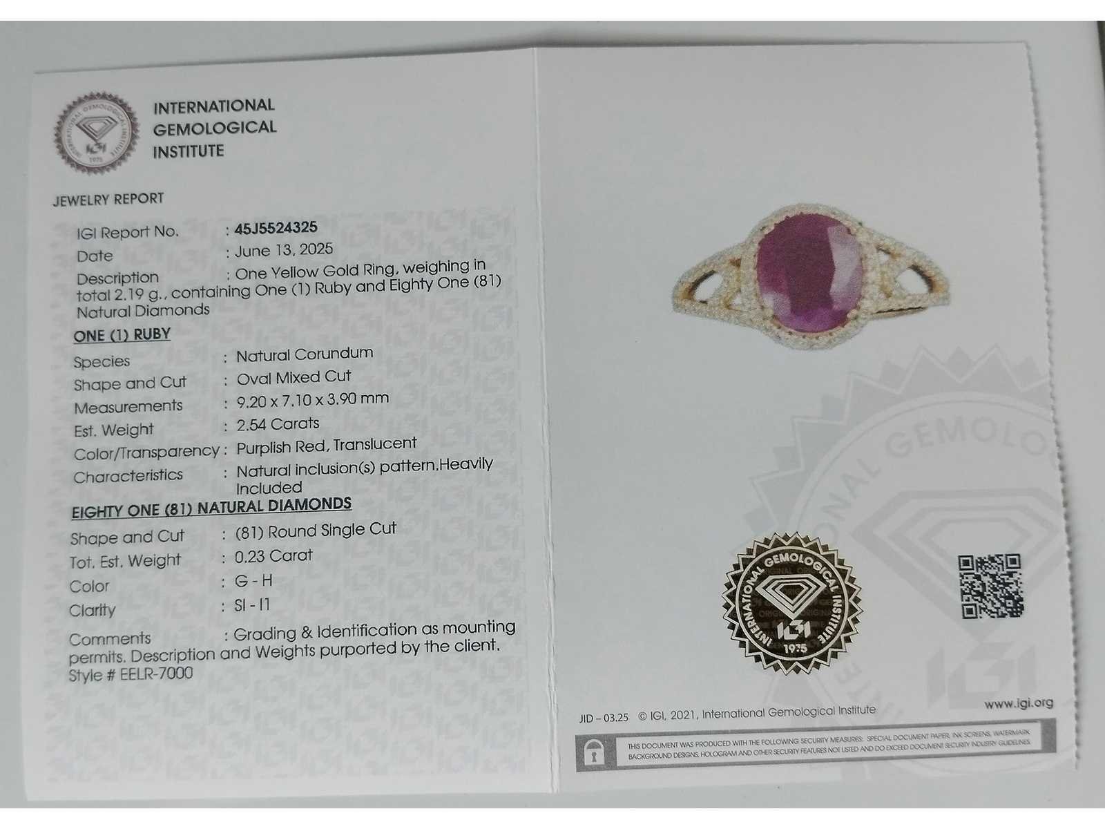 2,77 totale karaat natuurlijke robijnenring van saffier met 14 karaats goud Totaal gewicht 2.189 g - Midden edelsteen natuurlijke korund robijn Edelsteen karaatgewicht: 2,54 karaat Edelsteenafmetingen 9,20X7,10X3,90 mm - Extra edelstenen Natuurlijke diamant - Extra edelsteengewicht 0,23 karaat - Ringmaat (VS): 7/55 Bezichtiging op afspraak Materiaal: Geelgoud Ringmaat : 54 Certificaat: Ja