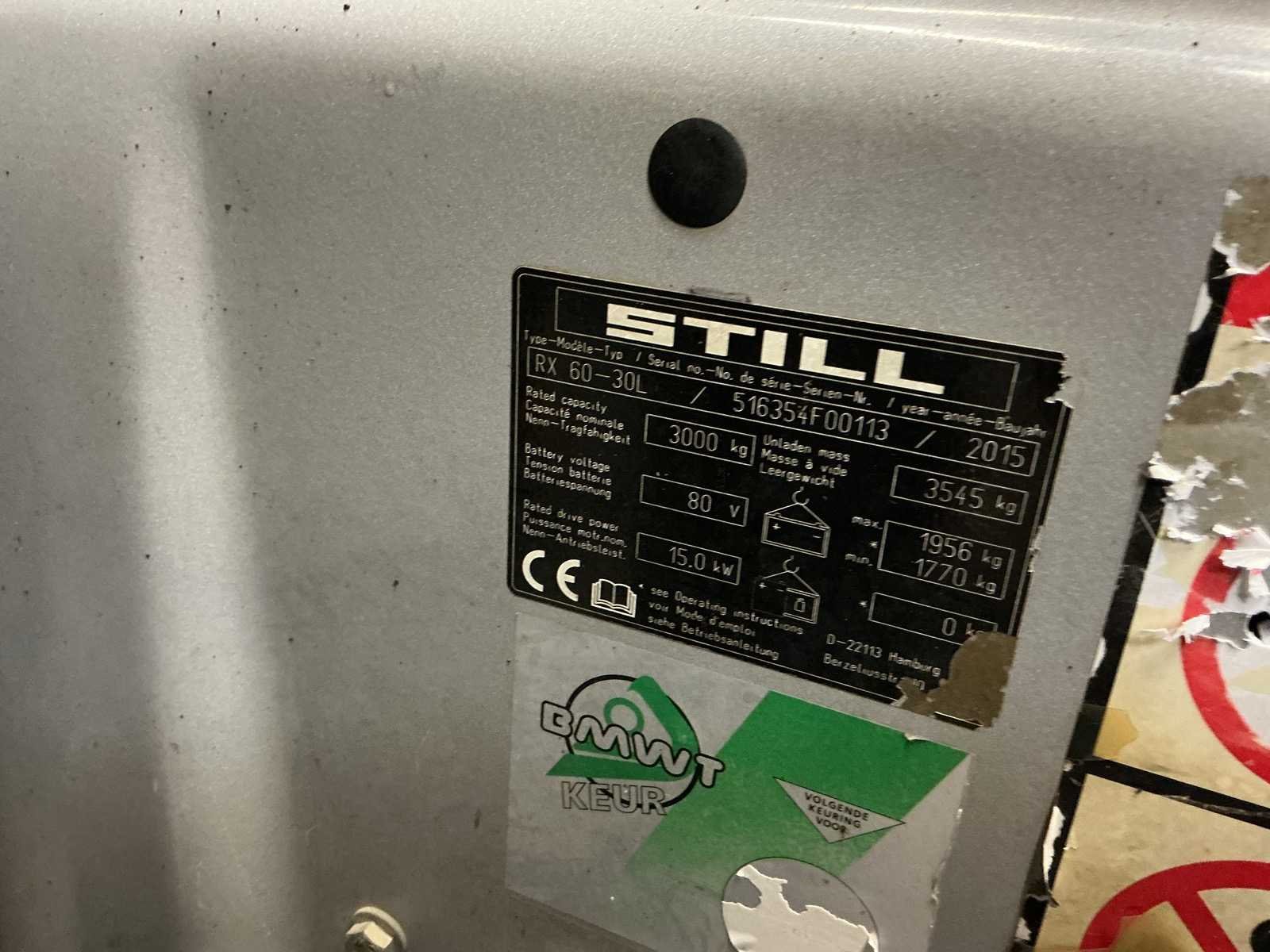 Merk: STILL Type: RX60-30 Bouwjaar: 2015 Serienummer: 516354F00113 Mast: Triplex Aantal wielen: 4 Afgelezen urenstand: 12409 Free-lift: true Side-shift: true Hefvermogen: 3000kg Lepellengte: 1200mm Hefhoogte: 5390mm Minimale doorrijhoogte: 2475mm