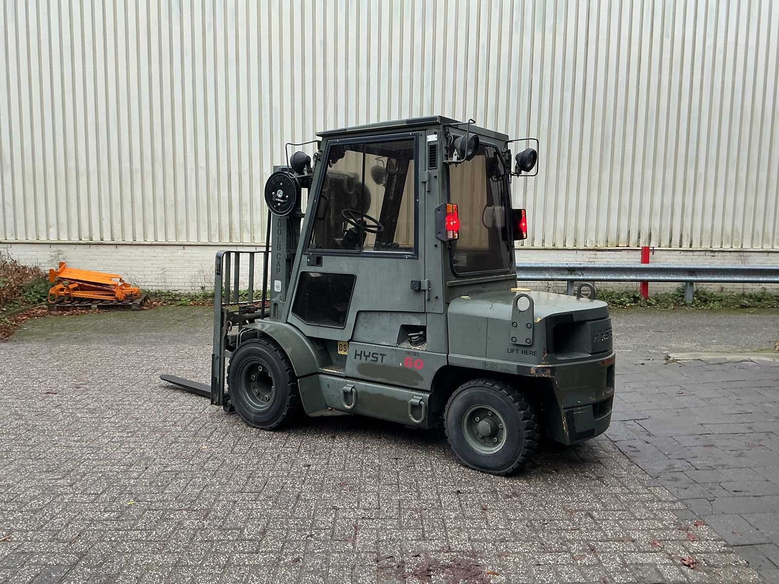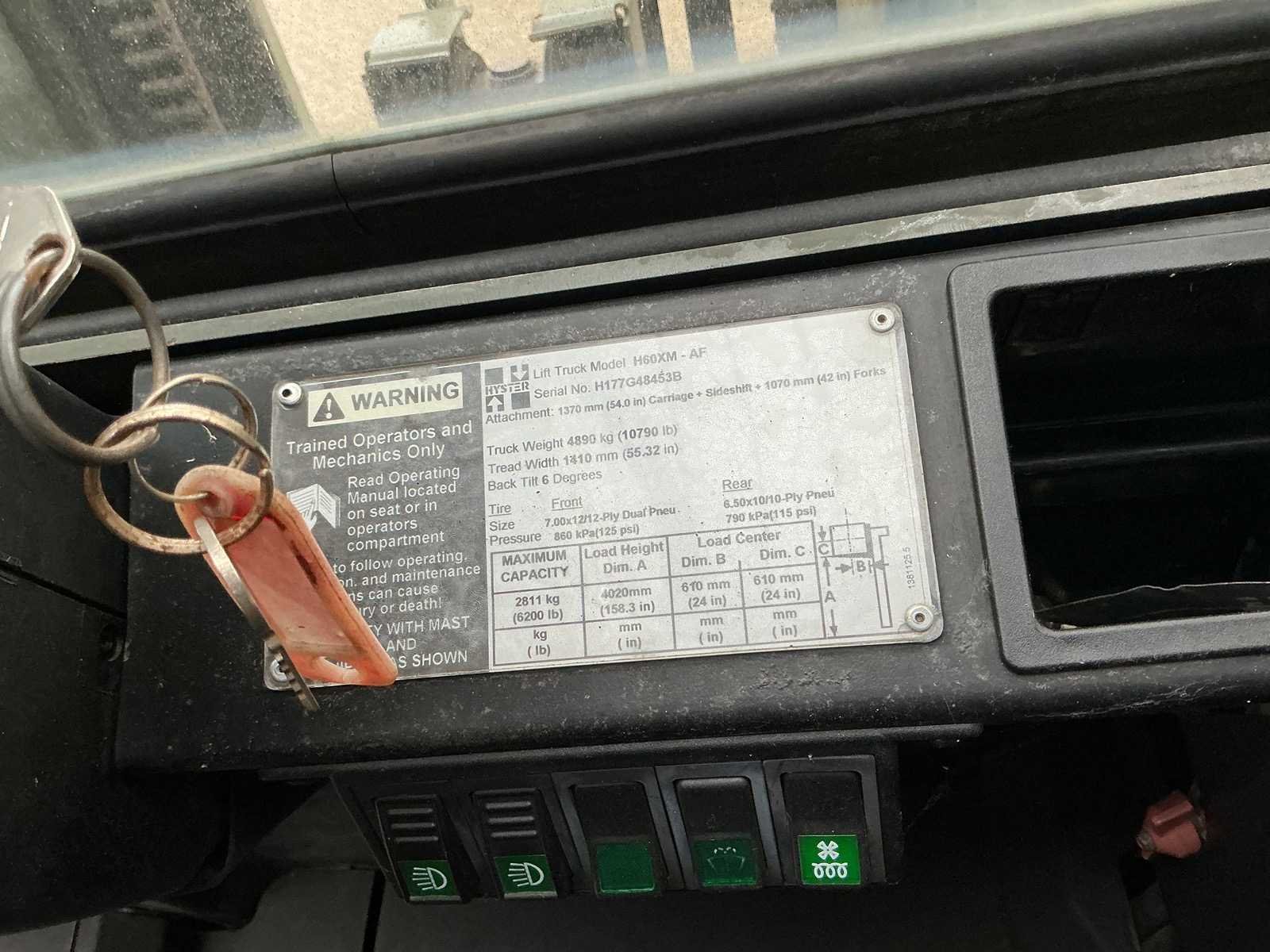 Perkins 4 cilinder 6000 pond Merk: Hyster Type: H60XM Bouwjaar: 2001 Serienummer: H177G48453B Brandstof: diesel Mast: Triplex Aantal wielen: 6 Afgelezen urenstand: 212 Free-lift: true Side-shift: true Hydraulisch verstelbare lepels: true Lepellengte: 1050mm Hefhoogte: 3900mm Minimale doorrijhoogte: 2250mm Diesel: true