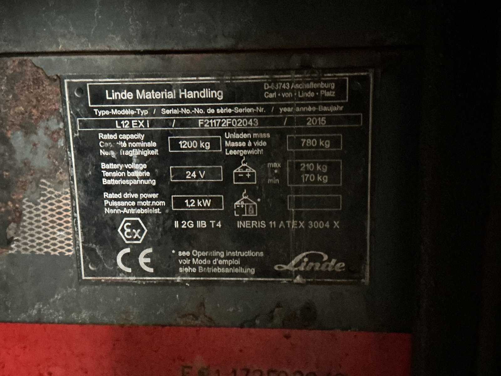 Merk: Linde Type: L12 EX i Bouwjaar: 2015 Serienummer: F2117F02043 Hefvermogen: 1200kg Hefhoogte: 3009mm Lepellengte: 1150mm Afgelezen urenstand: 641 Minimale doorrijhoogte: 1700mm