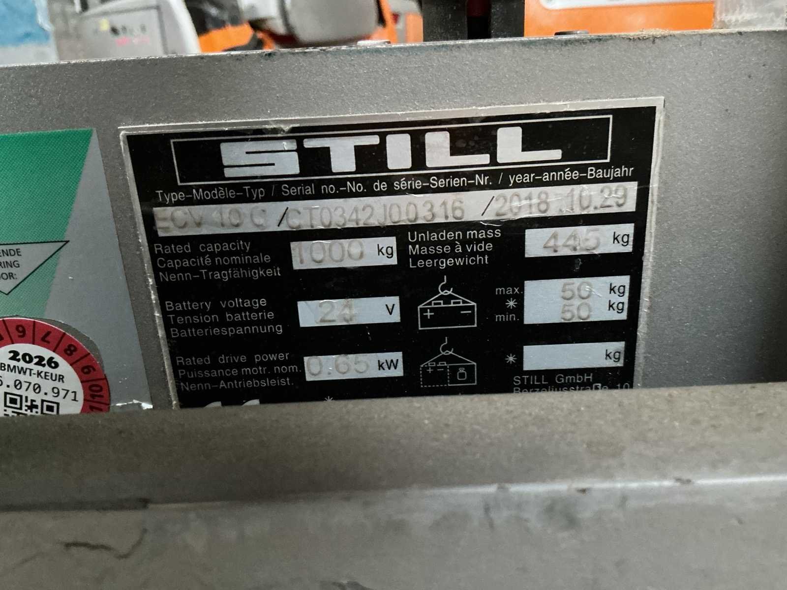 Merk: STILL Type: ECV 10 C Bouwjaar: 2018 Serienummer: CT0342J00316 Hefvermogen: 1000kg Hefhoogte: 1600mm Lepellengte: 1150mm Afgelezen urenstand: 670 Minimale doorrijhoogte: 2000mm Accu lader: true