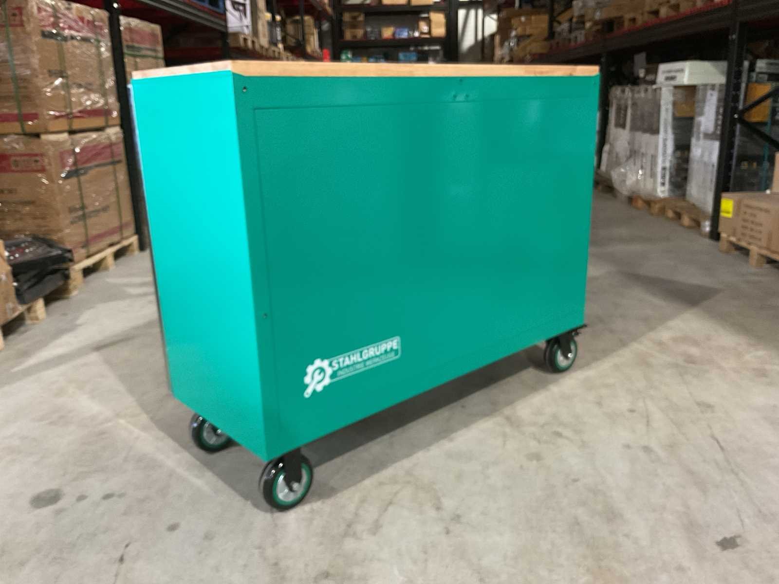 Voorzien van 11 lades waarvan 9 gevuld met gereedschap; professioneel chroom-vanadium gereedschap; heavy duty gereedschapswagen; houten werkblad; 4 wielen; stevig handvat; ongebruikt in doos (transport afmetingen 140x60x115 cm) Merk: Stahlgruppe Type: SG56 Bouwjaar: 2025 Aantal laden: 11 Met inhoud: true Eigen gewicht: 200kg Totale afmeting L: 1400mm Totale afmeting Breedte: 600mm Totale afmeting Hoogte: 1150mm