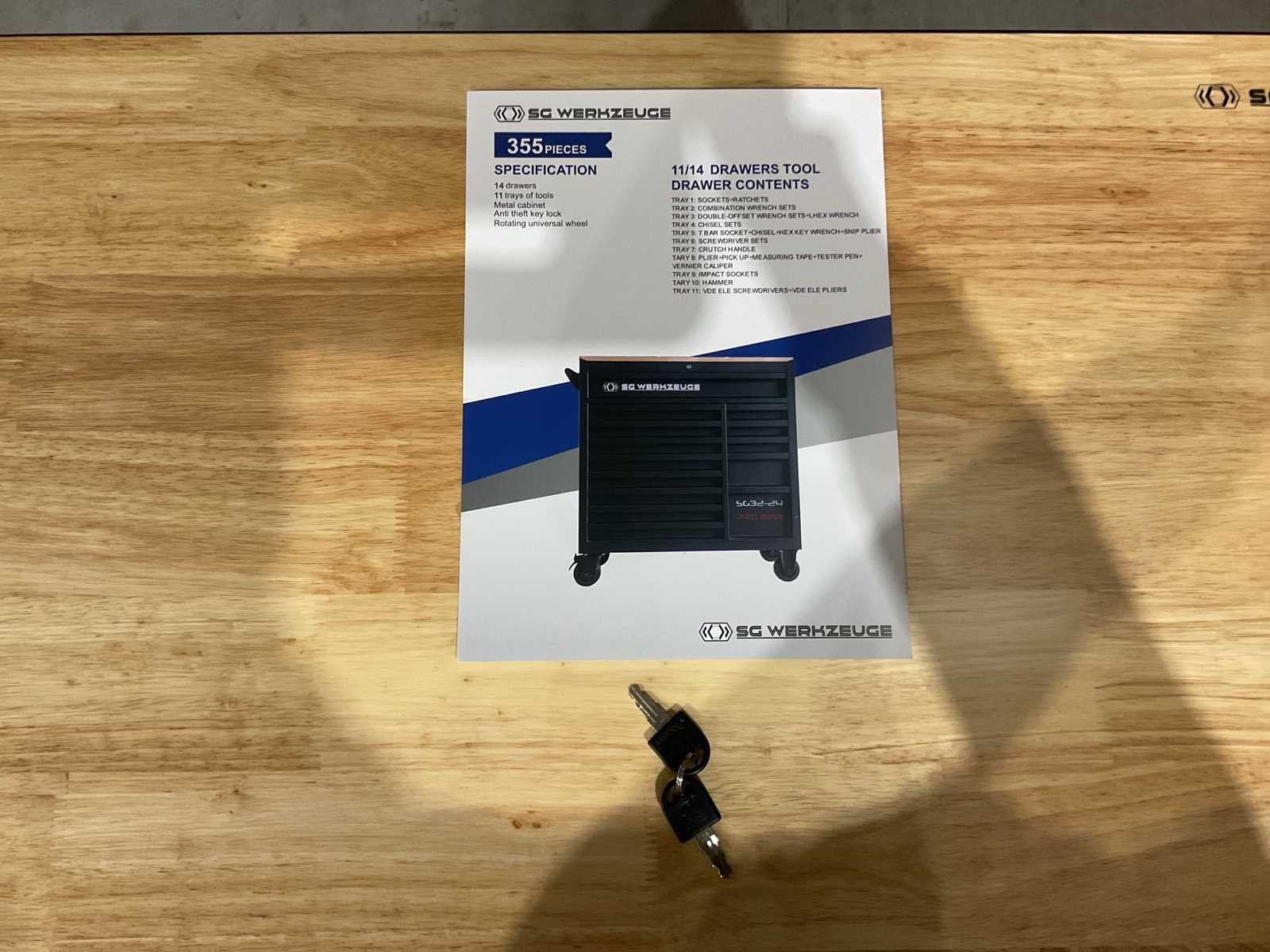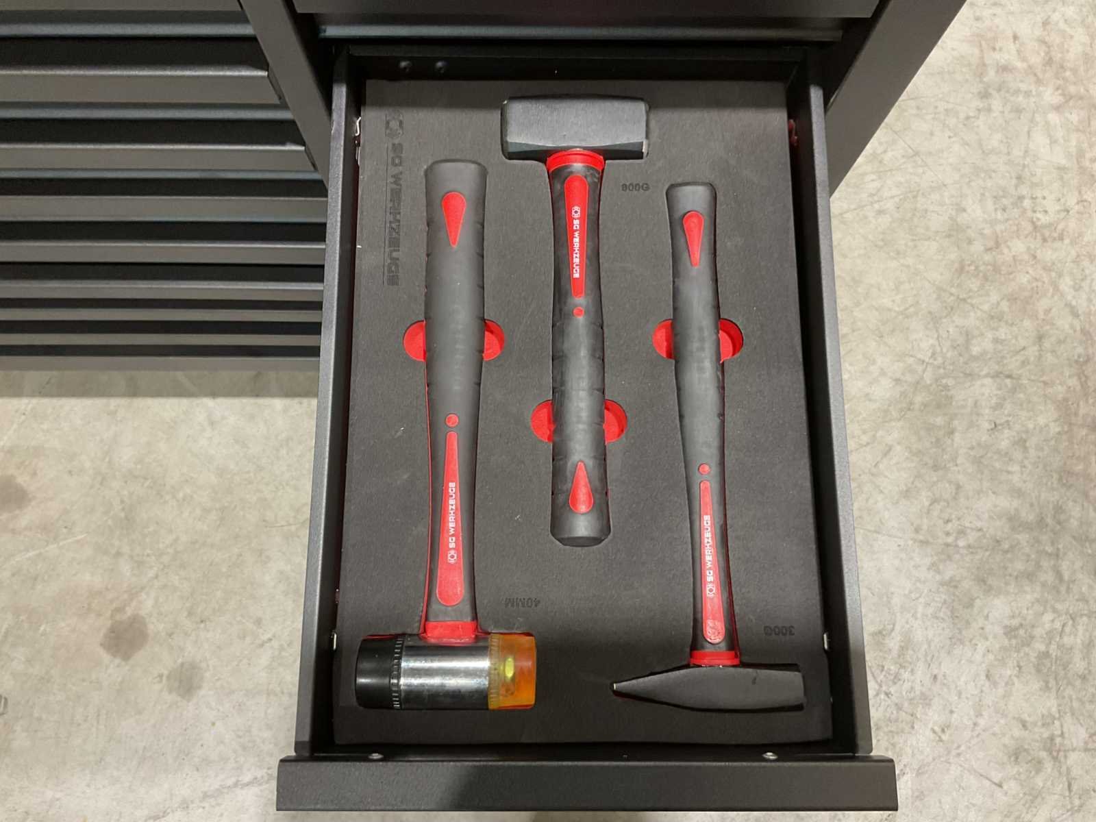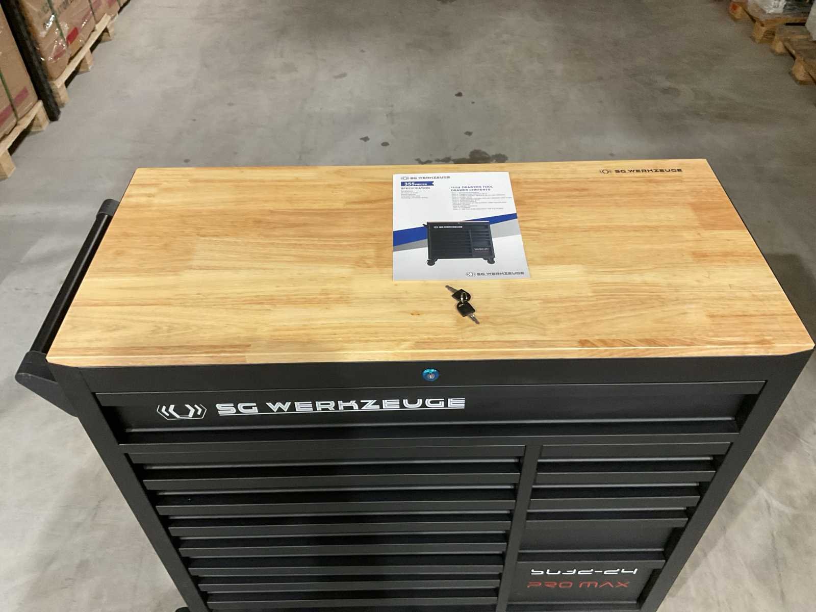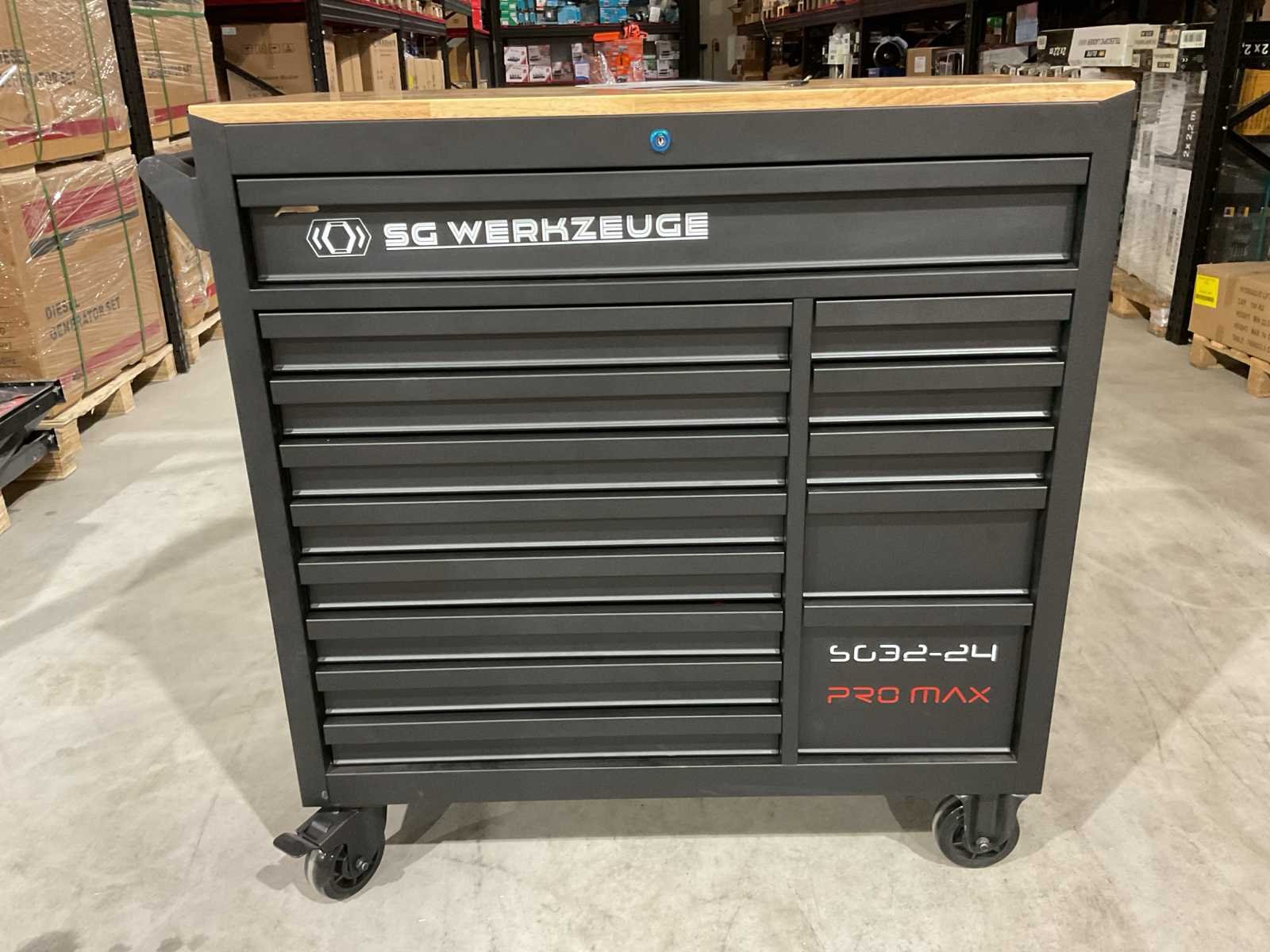 Voorzien van 14 lades waarvan 11 gevuld met gereedschap; professioneel chroom-vanadium gereedschap; heavy duty gereedschapswagen; houten werkblad; 4 wielen; stevig handvat; ongebruikt in doos (transport afmetingen 110x50x100 cm) Merk: SG Werkzeuge Type: SG32-24 Pro Max Bouwjaar: 2025 Aantal laden: 14 Met inhoud: true Eigen gewicht: 159kg Totale afmeting L: 1100mm Totale afmeting Breedte: 500mm Totale afmeting Hoogte: 1000mm