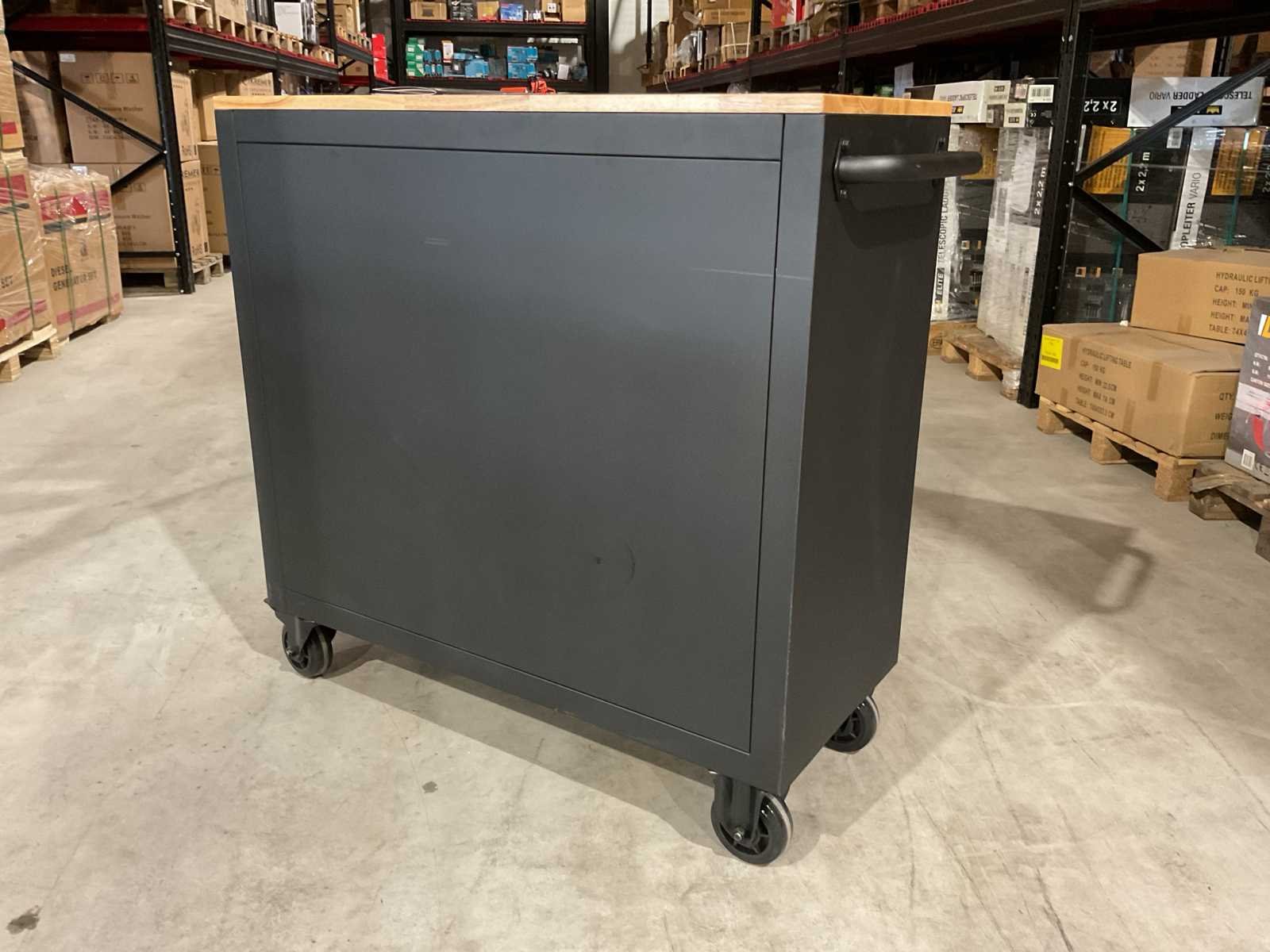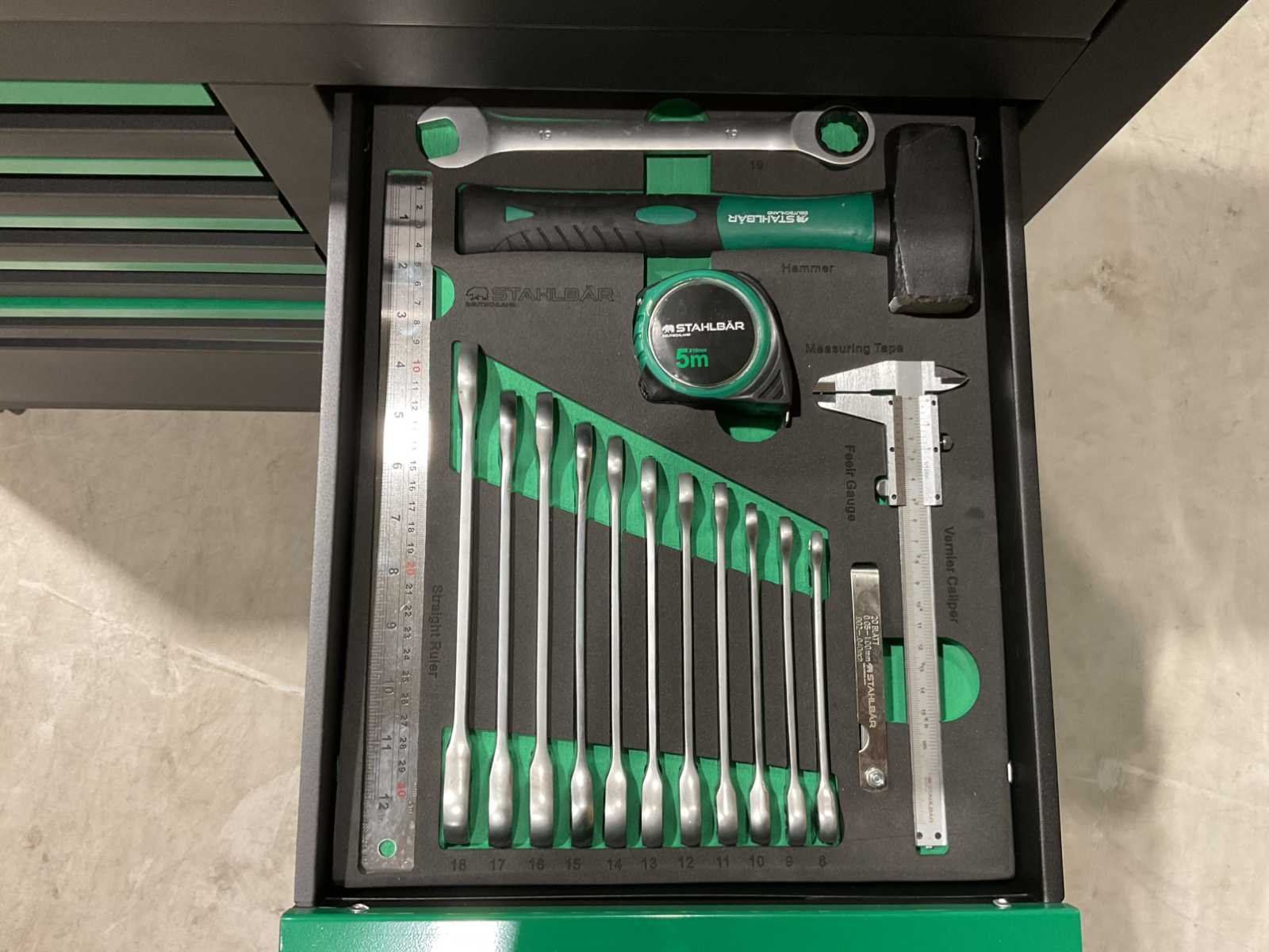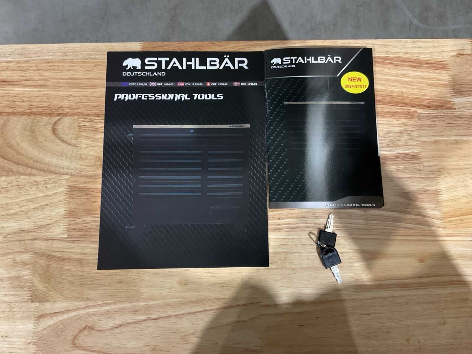 Voorzien van 13 lades waarvan 10 gevuld met gereedschap; professioneel chroom-vanadium gereedschap; heavy duty gereedschapswagen; houten werkblad; 4 wielen; stevig handvat; ongebruikt in doos (transport afmetingen 115x50x100 cm) Merk: Stahlbär Type: Deutschland Bouwjaar: 2025 Aantal laden: 13 Met inhoud: true Eigen gewicht: 134kg Totale afmeting L: 1150mm Totale afmeting Breedte: 500mm Totale afmeting Hoogte: 1000mm