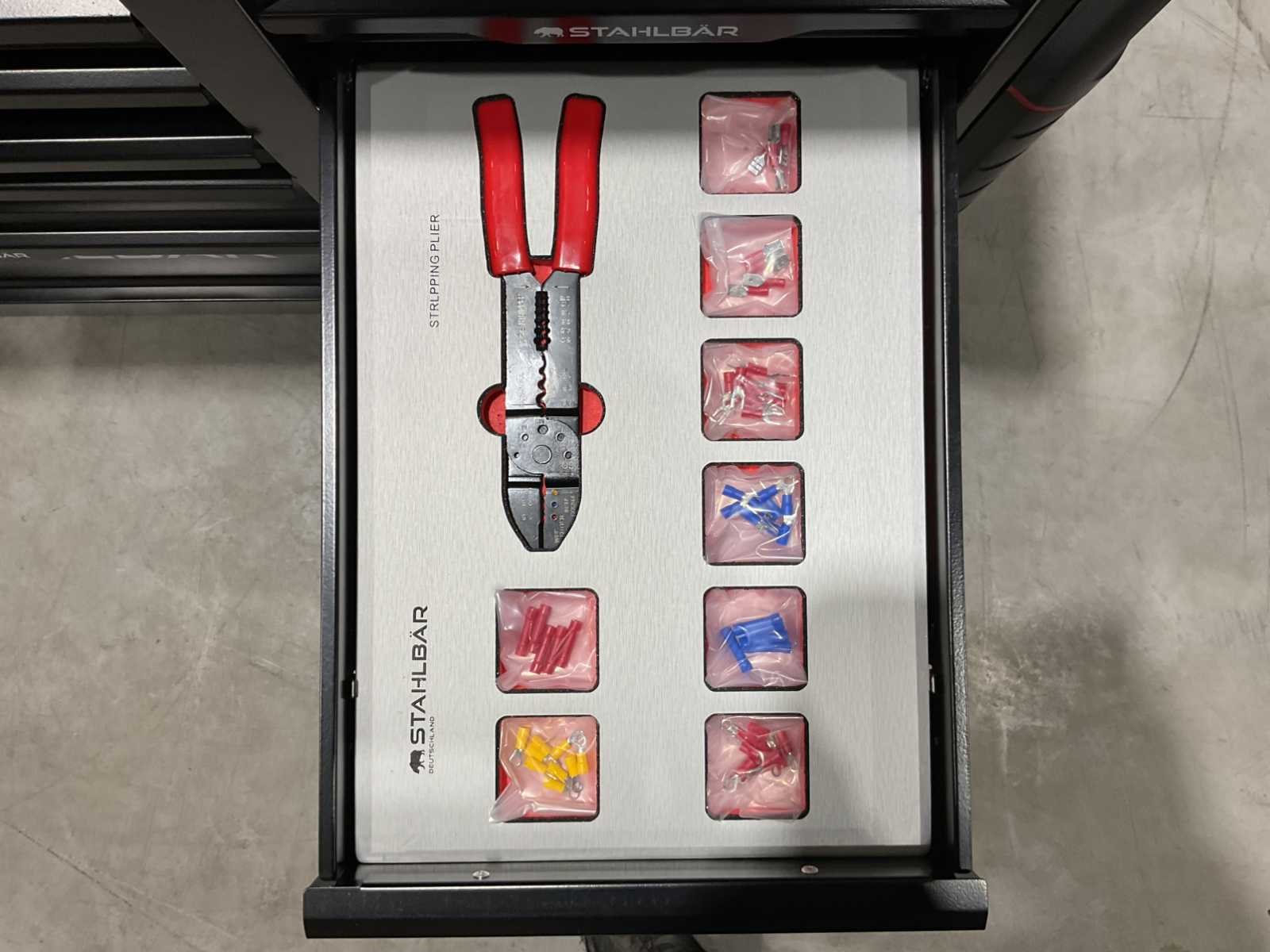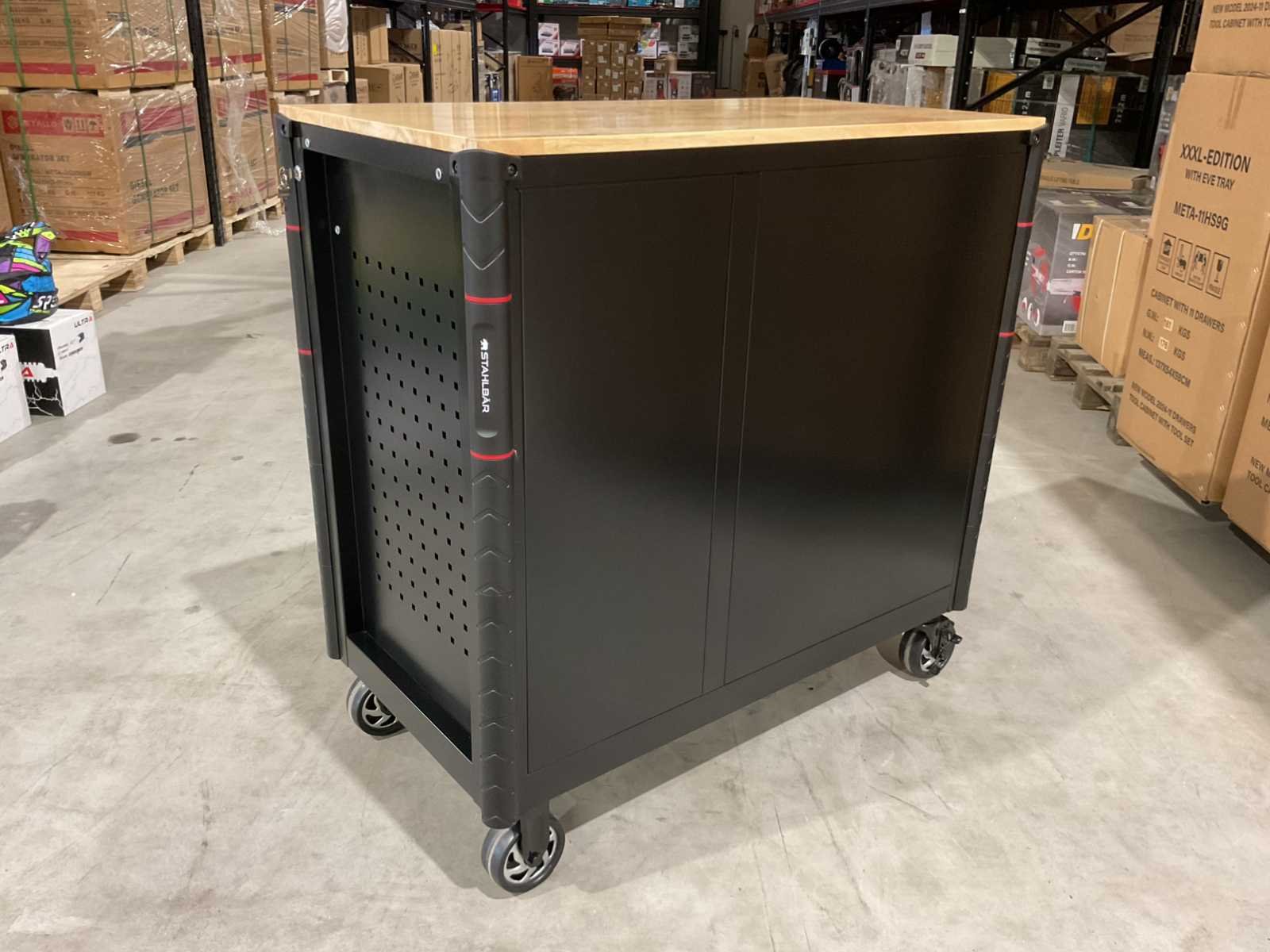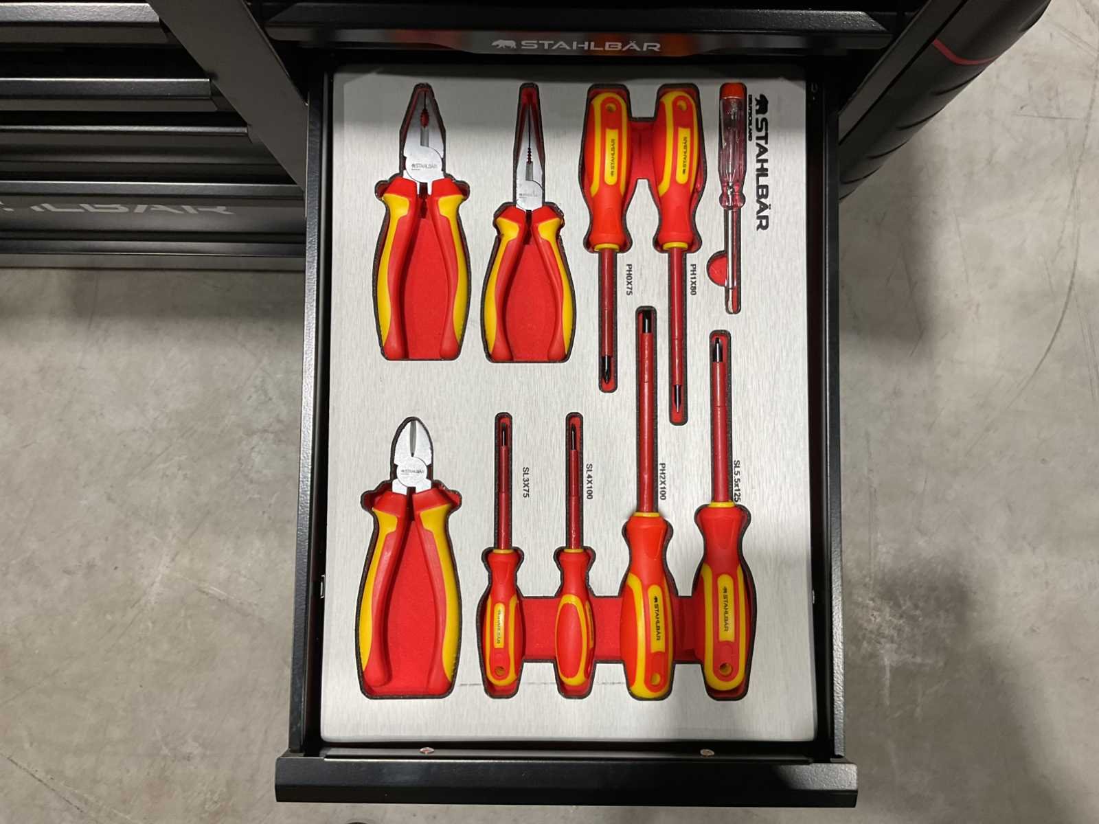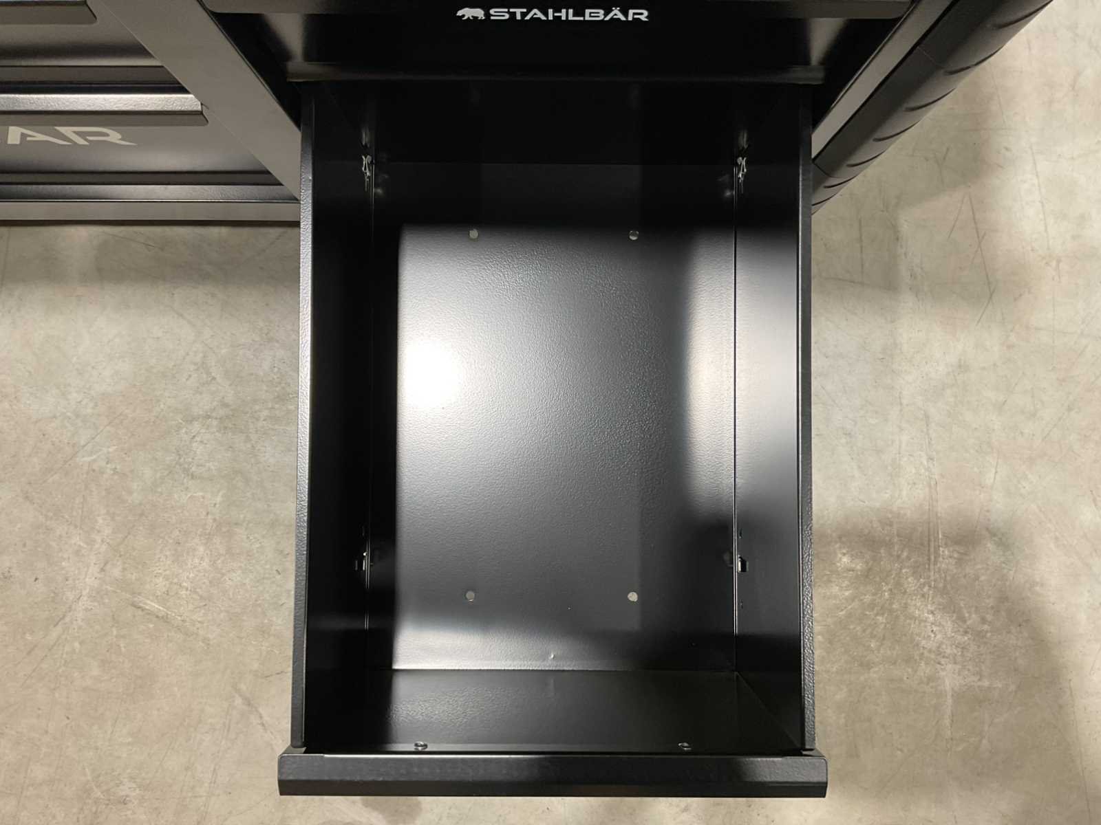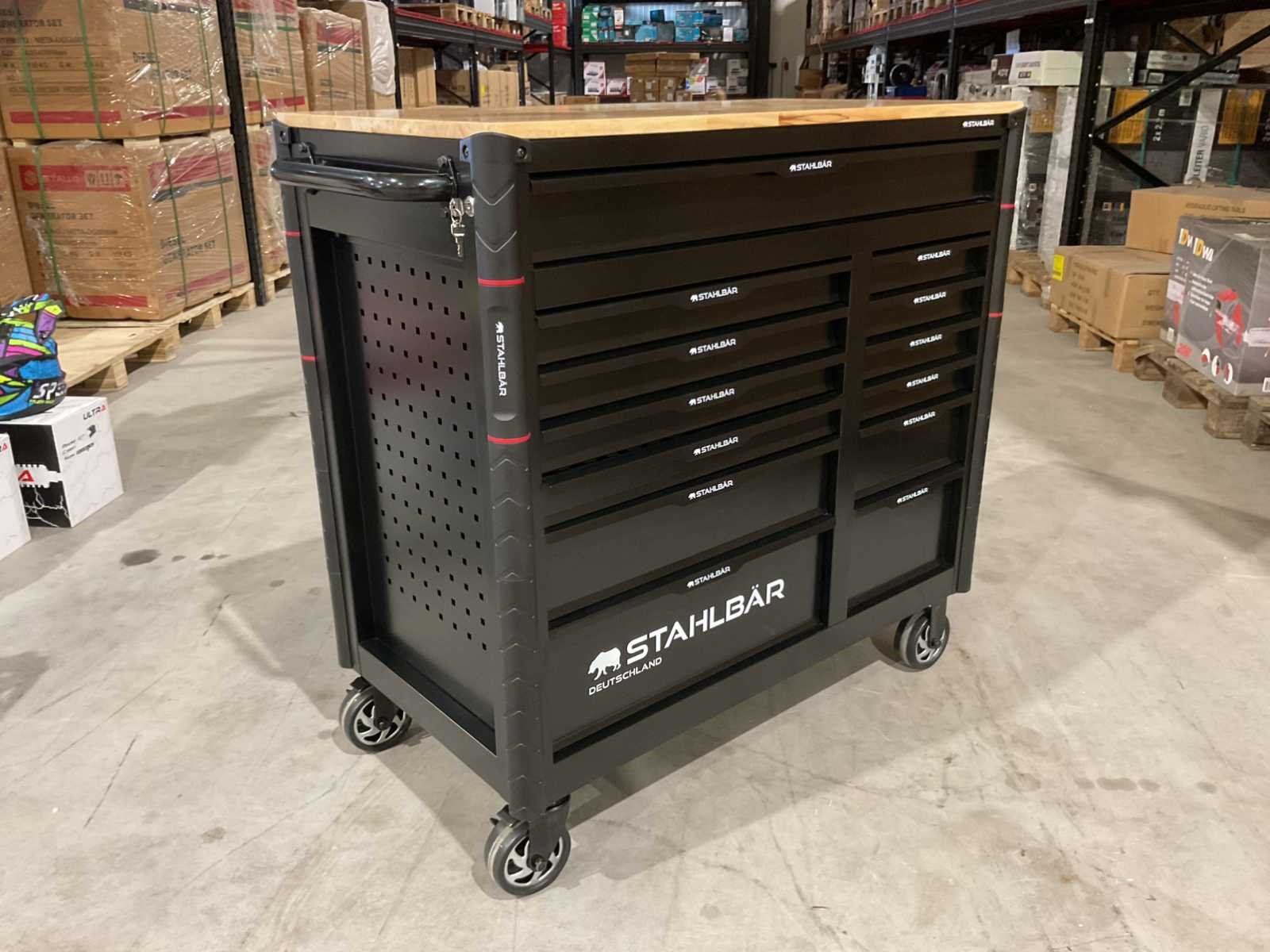 Voorzien van 13 lades waarvan 10 gevuld met gereedschap; professioneel chroom-vanadium gereedschap; heavy duty gereedschapswagen; houten werkblad; 4 wielen; stevig handvat; ongebruikt in doos (transport afmetingen 115x50x100 cm) Merk: Stahlbär Type: Deutschland XXXL PRO Bouwjaar: 2025 Aantal laden: 13 Met inhoud: true Eigen gewicht: 138kg Totale afmeting L: 1150mm Totale afmeting Breedte: 500mm Totale afmeting Hoogte: 1000mm