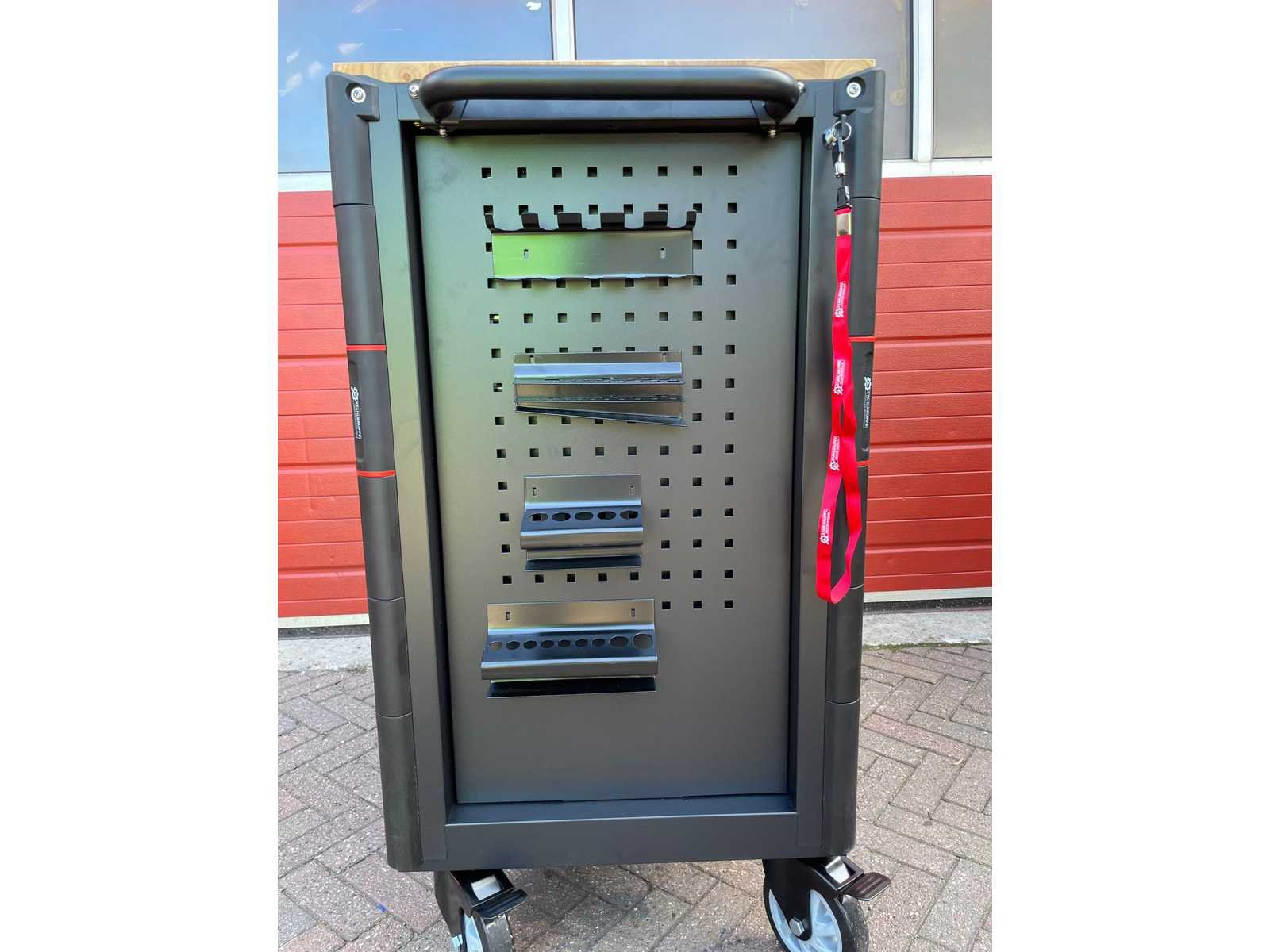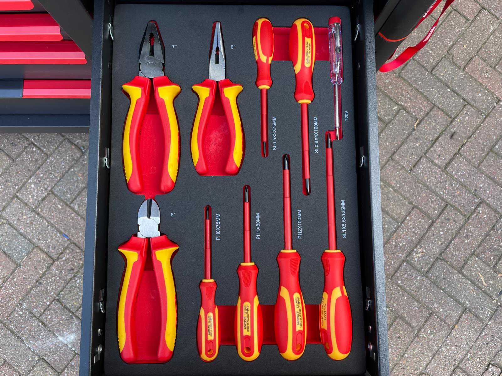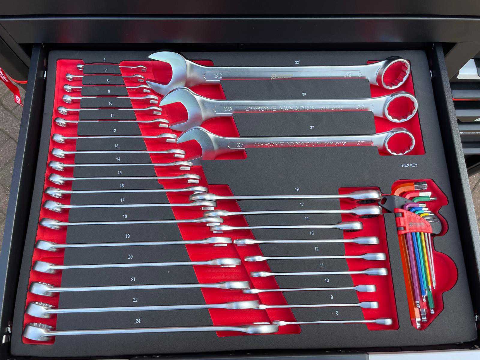 Gevulde gereedschapswagen; aantal gevulde laden: 11 gevulde laden; gereedschap: chrome vanadium; inhoud: 2 dopsleutel sets, momentsleutel, ringsteeksleutel set 6-32, ringratelsleutel 8-19, inbussleutel set, ringsleutel set 6-32, torx sleutel set T8-T70, schroevendraaier set (21 stuks), tangen set (9 stuks), beitel en doorslagen set (18 stuks), vijlen set (5 stuks), T-greep dopsleutel set 6-14, T-greep torx sleuel set T15-T45, hamers (3 stuks), VDE gereedschap (3 tangen en 7 schroevendraaiers), kabelschoentang set, enzovoort; staat: ongebruikt in doos Merk: Stahlgruppe Type: Jumbo R Bouwjaar: 2024 Aantal laden: 13 Met inhoud: true Eigen gewicht: 138kg Totale afmeting L: 1100mm Totale afmeting Breedte: 620mm Totale afmeting Hoogte: 1120mm