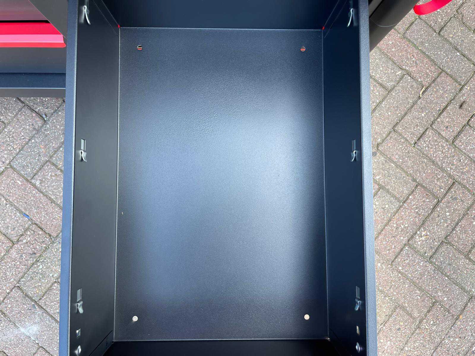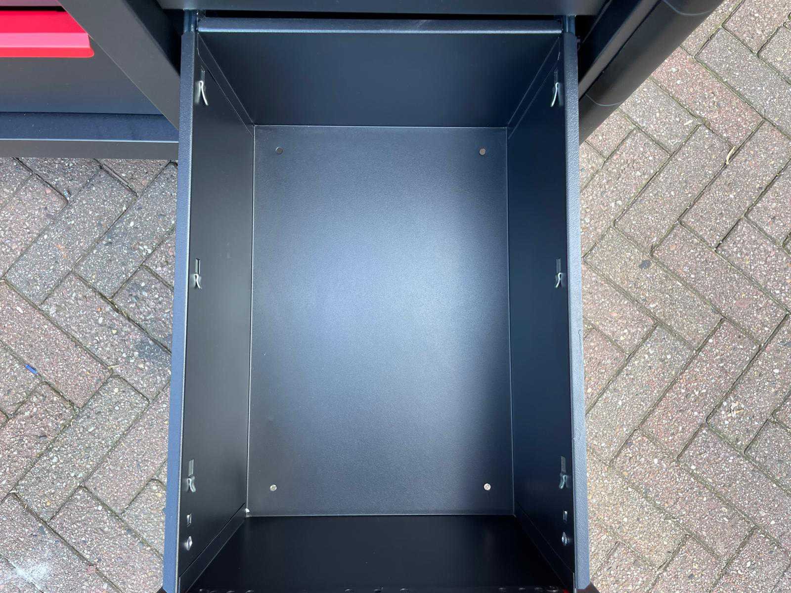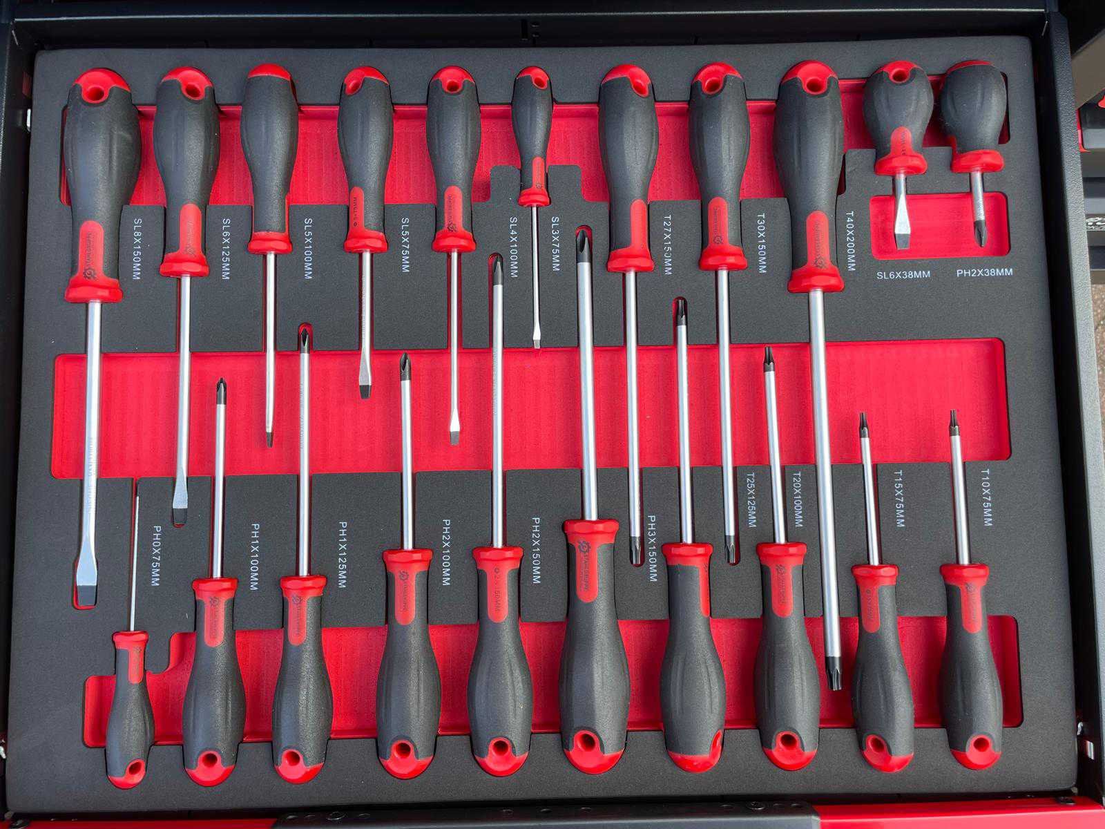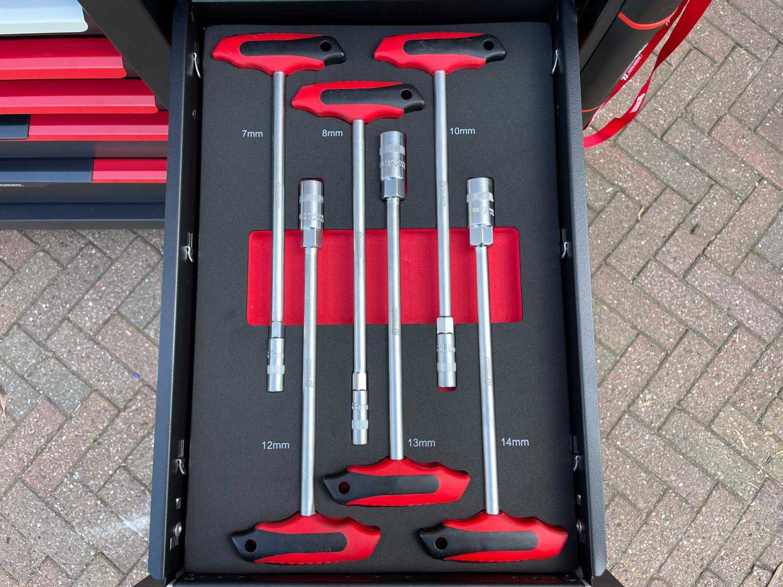 Gevulde gereedschapswagen; aantal gevulde laden: 11 gevulde laden; gereedschap: chrome vanadium; inhoud: 2 dopsleutel sets, momentsleutel, ringsteeksleutel set 6-32, ringratelsleutel 8-19, inbussleutel set, ringsleutel set 6-32, torx sleutel set T8-T70, schroevendraaier set (21 stuks), tangen set (9 stuks), beitel en doorslagen set (18 stuks), vijlen set (5 stuks), T-greep dopsleutel set 6-14, T-greep torx sleuel set T15-T45, hamers (3 stuks), VDE gereedschap (3 tangen en 7 schroevendraaiers), kabelschoentang set, enzovoort; staat: ongebruikt in doos Merk: Stahlgruppe Type: Jumbo R Bouwjaar: 2024 Aantal laden: 13 Met inhoud: true Eigen gewicht: 138kg Totale afmeting L: 1100mm Totale afmeting Breedte: 620mm Totale afmeting Hoogte: 1120mm