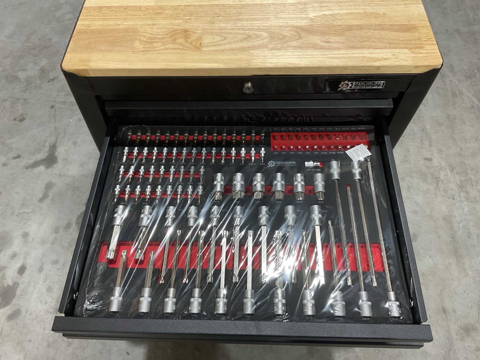 Voorzien van 7 lades waarvan 6 gevuld met gereedschap; professioneel chroom-vanadium gereedschap; heavy duty gereedschapswagen; houten werkblad; 4 wielen; stevig handvat; (transport afmetingen 70x50x105 cm); Let op transports schade Merk: Stahlgruppe Type: SG15 Bouwjaar: 2025 Aantal laden: 7 Met inhoud: true Eigen gewicht: 77kg Totale afmeting L: 68mm Totale afmeting Breedte: 48mm Totale afmeting Hoogte: 104mm