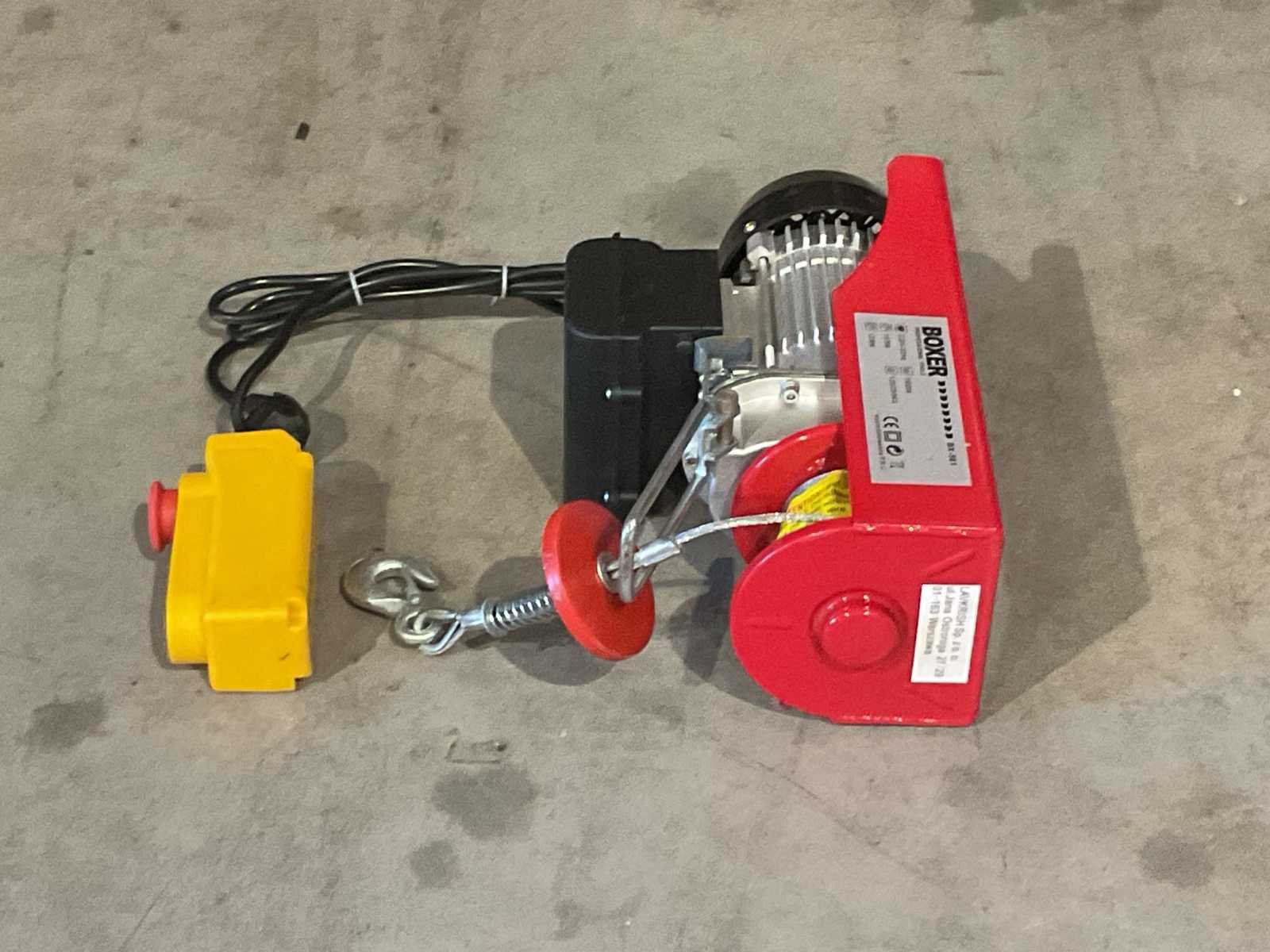 Voorzien van katrol; Motorvermogen: 1500 W; Maximale Laadcapaciteit (enkel / dubbel-kabel): ca. 125kg / 250kg; Maximale Hefhoogte (125kg / 250kg): 12m / 6m; Gem. hijssnelheid: 10 m/min;Aansluiting: 230V; 1 x elektrische lier; 1 x katrol met haak; 1 x montagebeugels; 1 x Bekabelde afstandbediening 1,45; Ongebruikt in doos (Afmeting transport verpakking 355x190x235 mm lxbxh, gewicht 11.36 kg) Merk: Boxer Type: BX-561 250kg Bouwjaar: 2025 Capaciteit.: 1000kg Hijshoogte: 12m Afstandsbediening: true Aansluiting: 220V Totale afmeting L: 355mm Totale afmeting Breedte: 190mm Totale afmeting Hoogte: 235mm Eigen gewicht: 11.36kg